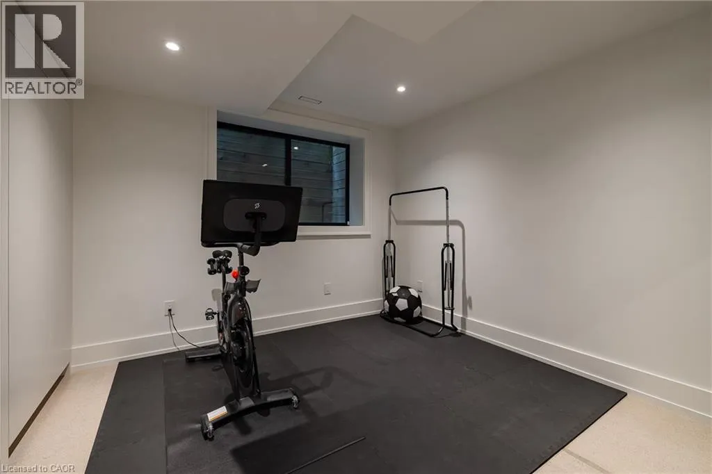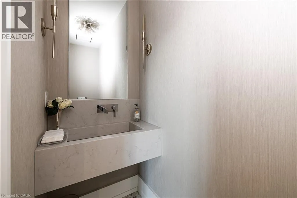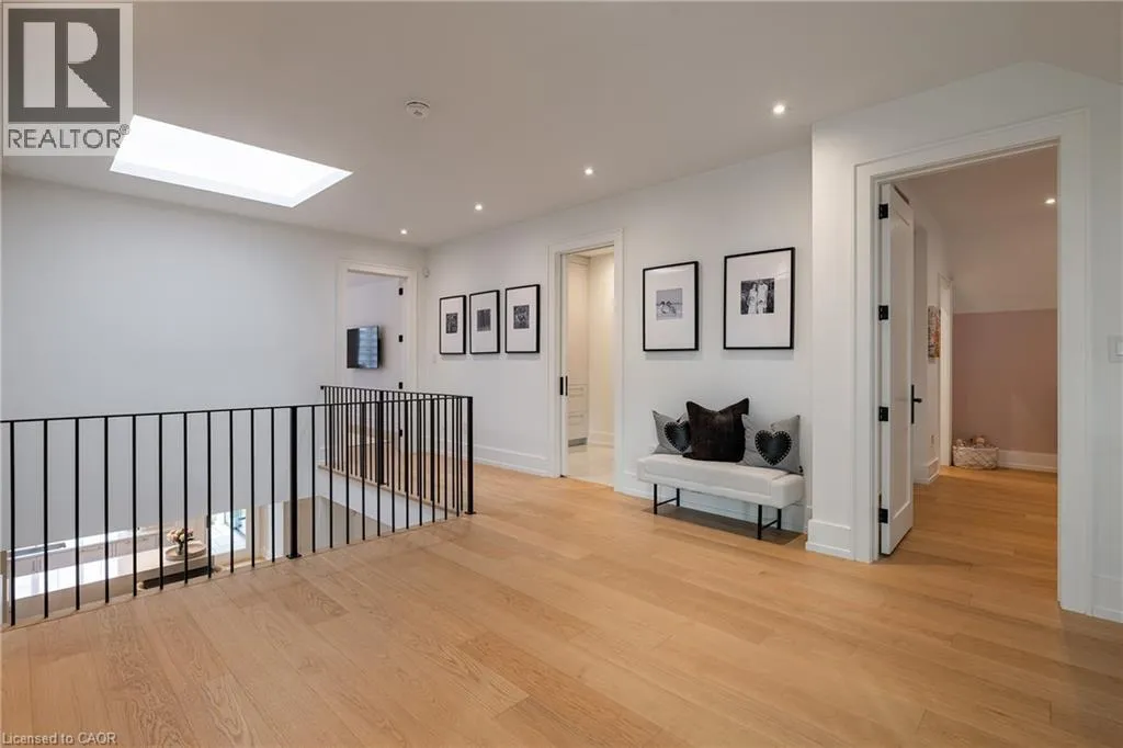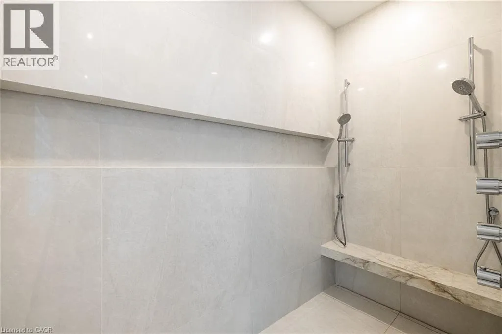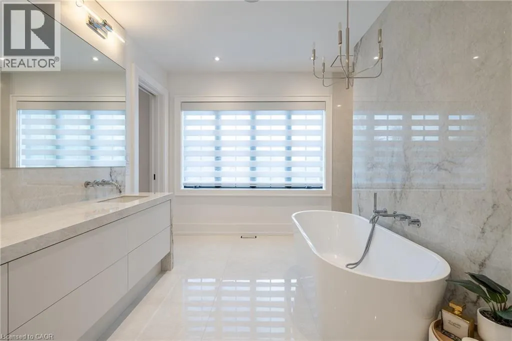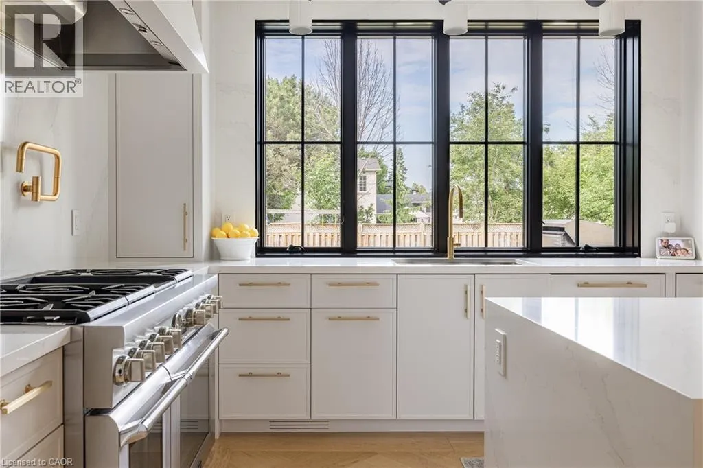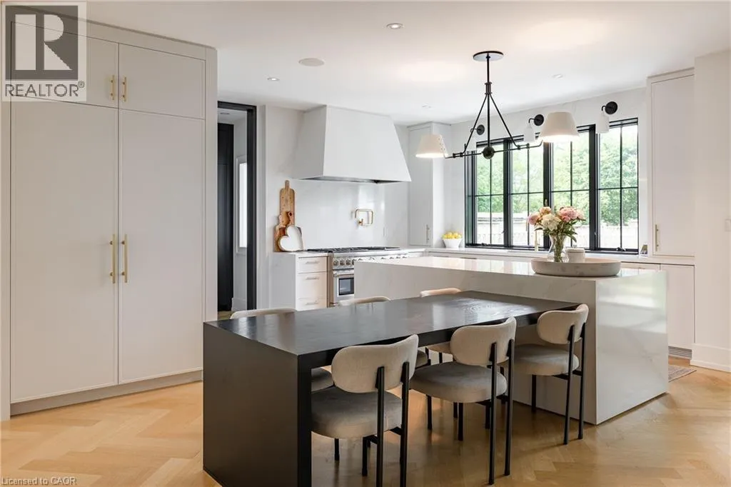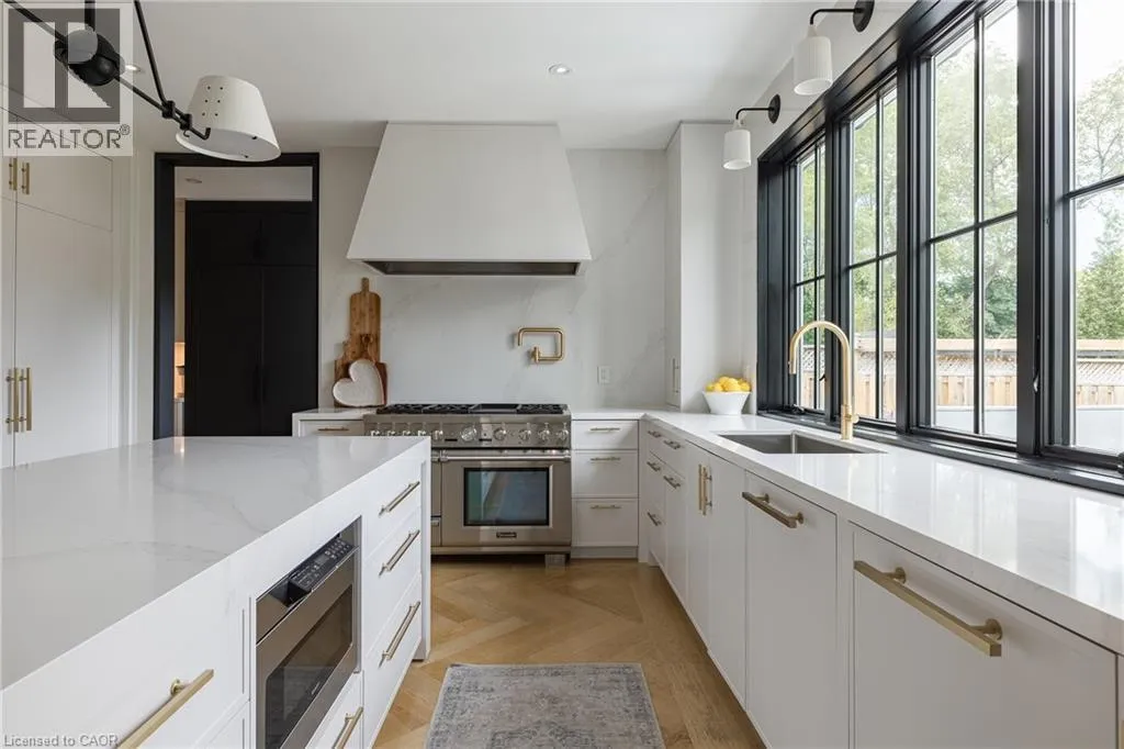 inside. Herringbone-patterned engineered hardwood floors, soaring ceiling heights, and custom millwork by Misani Custom Design create a warm yet elegant backdrop. A dedicated office at the front of the home provides a quiet workspace, while the formal dining room with adjacent servery is perfect for entertaining. The heart of the home is the expansive kitchen where custom cabinetry, premium appliances, and a large island flow seamlessly into the great room. A thoughtfully designed mudroom with built-ins and side entry adds everyday functionality. Upstairs, the primary suite is a private retreat featuring a spacious, custom-designed walk-in closet and a luxurious ensuite with double vanity, freestanding soaker tub, and oversized shower. The two additional bedrooms include private ensuites and custom built-ins, offering privacy and comfort for family and guests alike. A fully outfitted laundry room finishes off this level. The fully finished lower level offers nearly 1,900 square feet of additional space with radiant in-floor heating and polished concrete floors. A large recreation area, fourth bedroom, full bathroom with steam shower, second laundry and ample storage make this level both versatile and functional. Step outside to a backyard oasis designed for year-round enjoyment. A covered rear porch with glass enclosure acts as a true four-season extension of the home, while the built-in BBQ, hot tub, and landscaped grounds create an idyllic setting for outdoor entertaining. An exceptional offering in West Oakville, this home delivers style, substance, and space in equal measure. (id:62650)