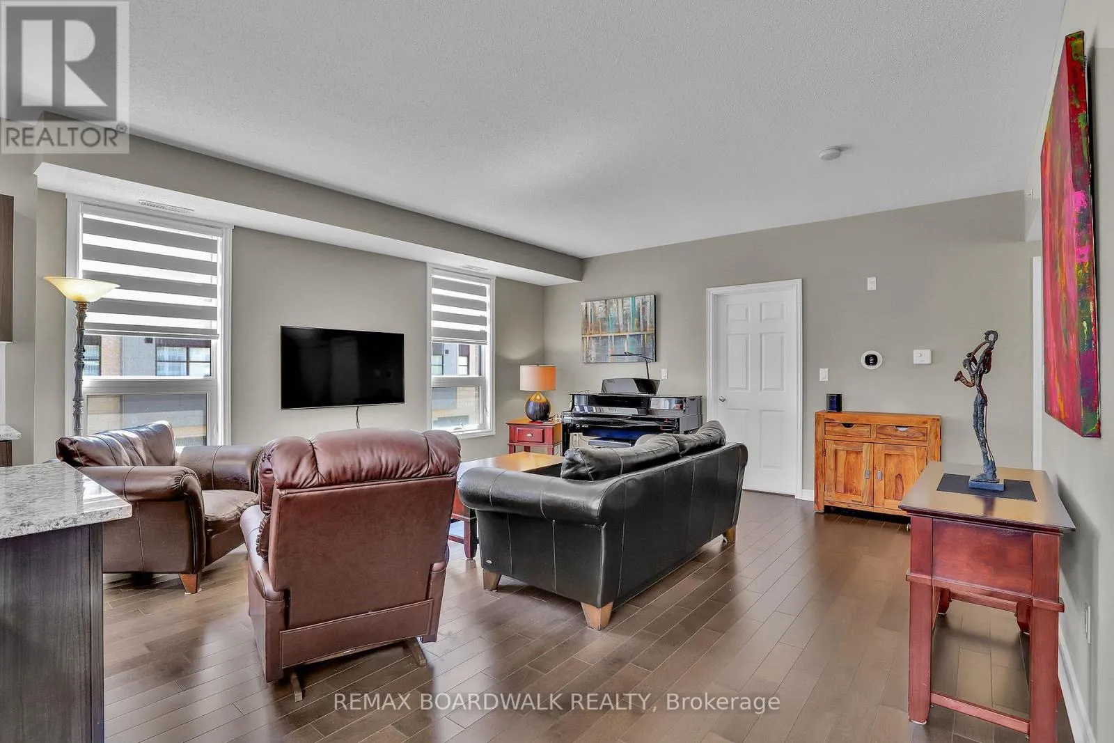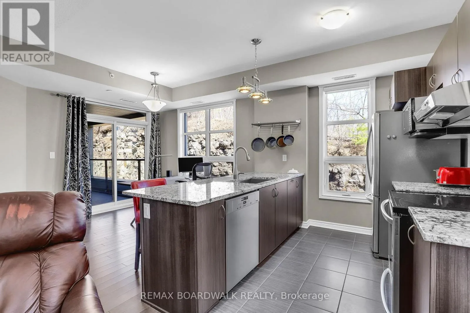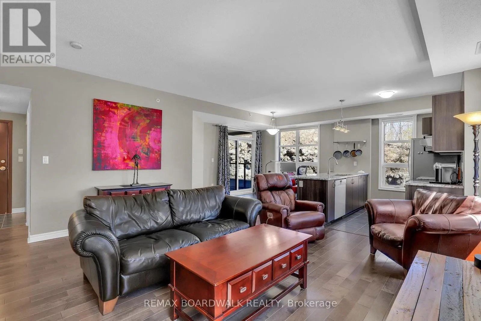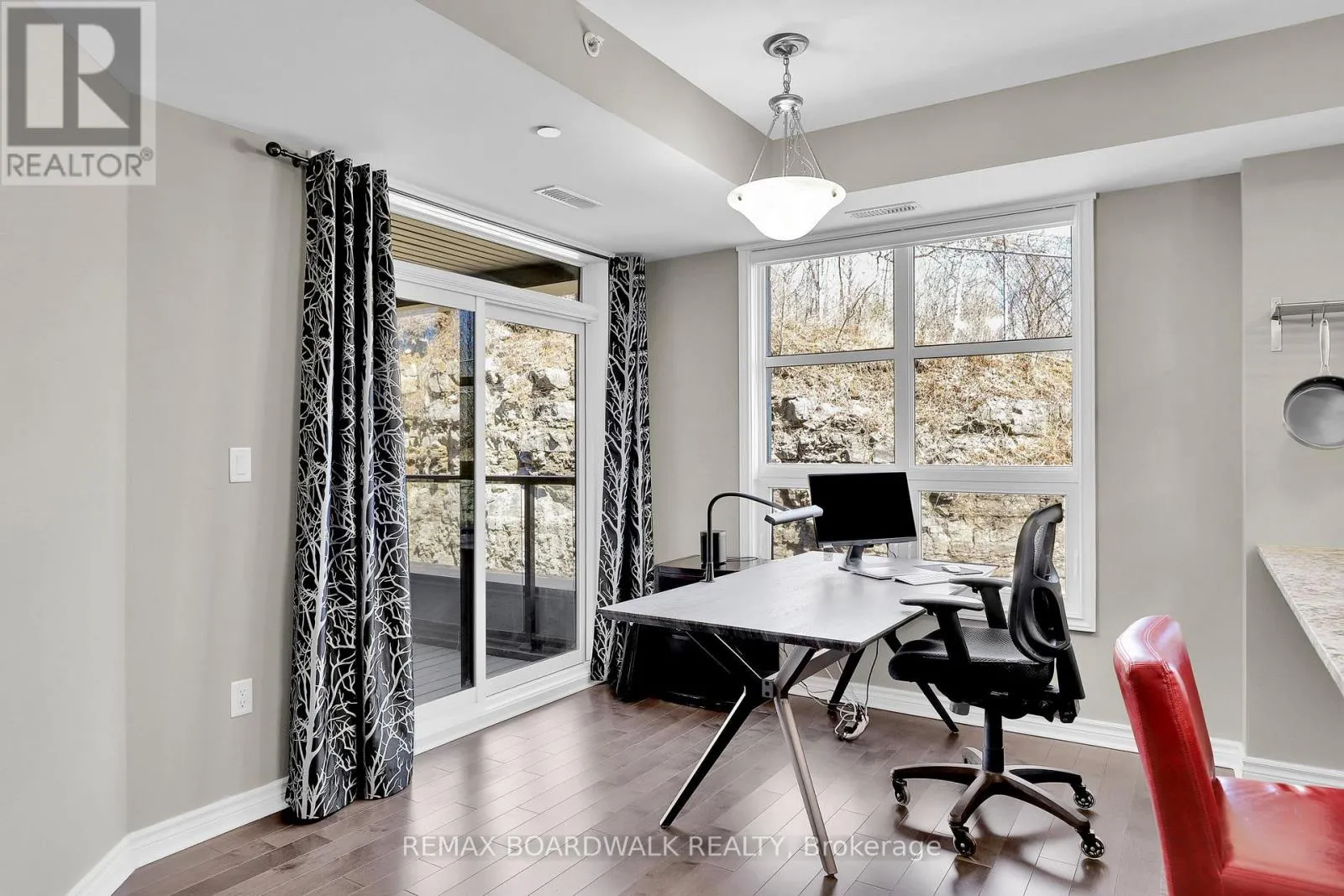 Welcome to 230 Titanium Private nestled in the tree filled Quarry Ridge complex of low-rise luxury condos. This large 2 bedroom & 2 bathroom CORNER unit showcases hardwood floors, 9ft ceilings, custom blinds and is filled with natural lights thanks to all your large windows. The open concept living area hosts a spacious living room, dining area with