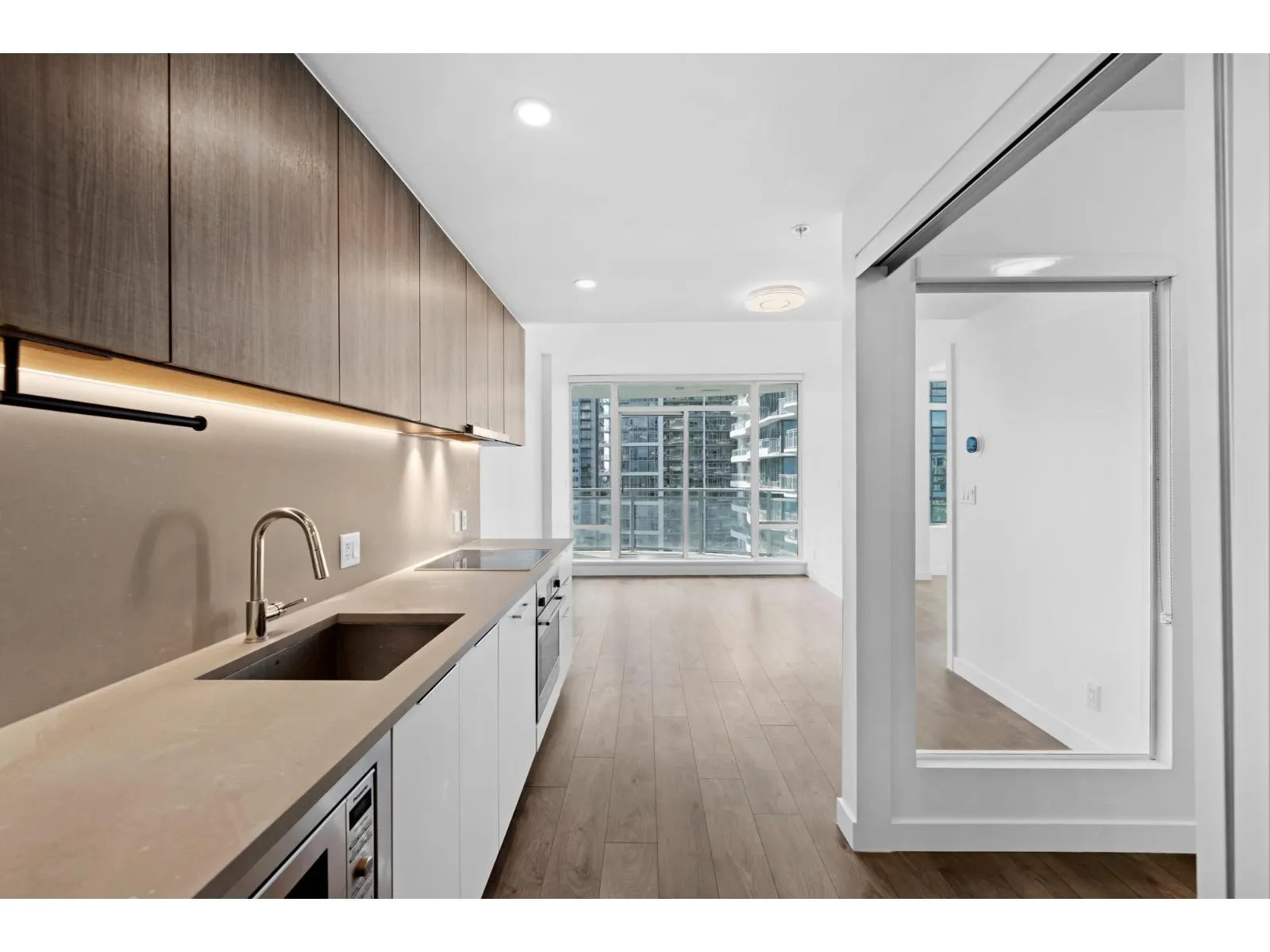 1st-TIME HOME BUYER ALERT at Linea by Rize! Experience Surrey Central at its BEST! This south-facing 572 sqft 2-bed + 1-bath unit with a spacious 66 sqft balcony on the quiet side offers courtyard views. Enjoy central AC, wide-plank laminate hardwood floors, 8’8 “ceilings, and TOP-OF-THE-LINE appliances and includes parking & locker. Strata fee covers central AC, heating, hot water,