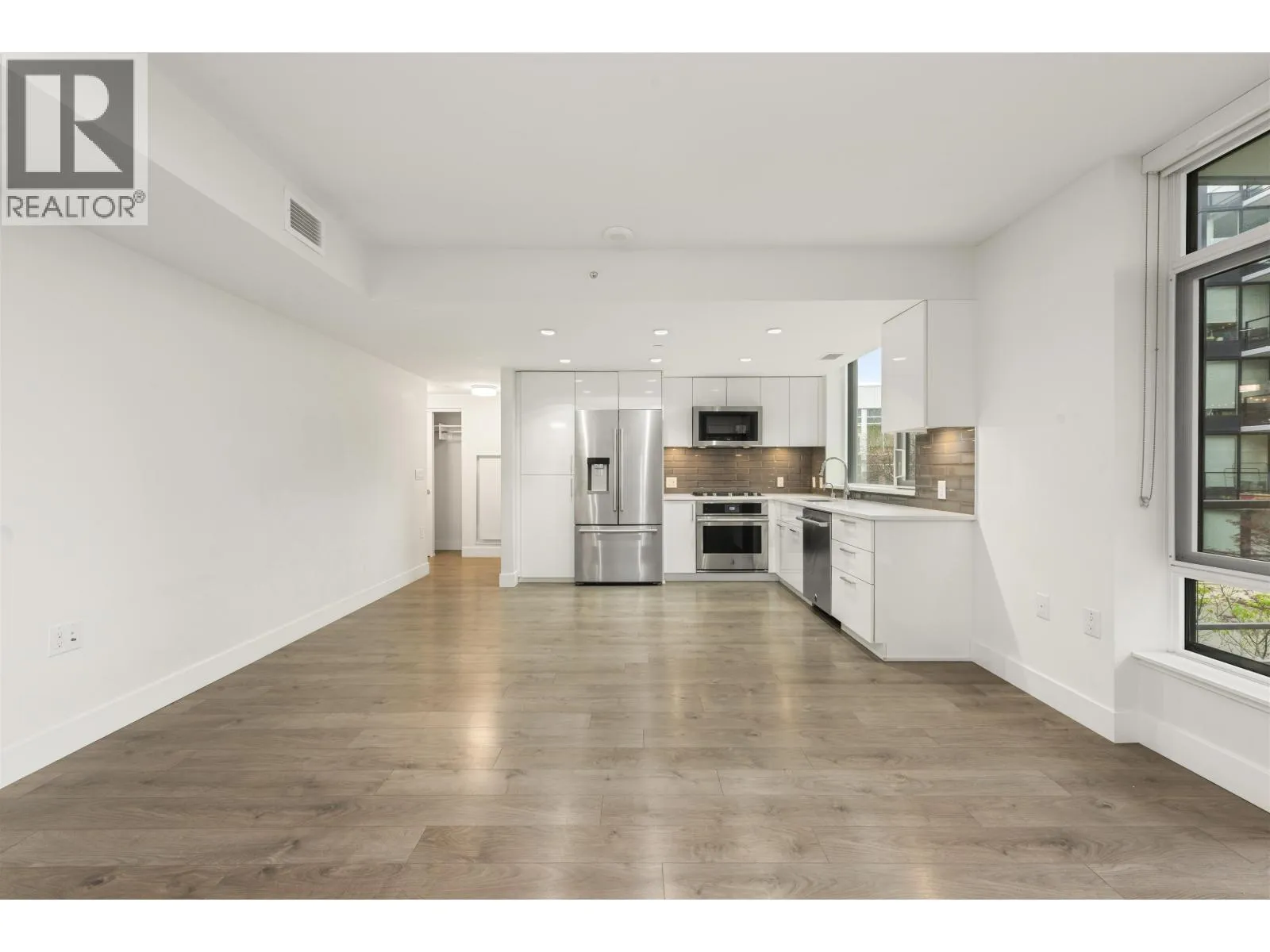 South-facing 2 Bed, 2 Bath + Flex home with one of the best open floor plans in the building, overlooking the peaceful central garden. Bright and functional 910 square ft layout with spacious living and dining areas, separated bedrooms, versatile flex space, A/C, and high-end Jenn-Air appliances. Rare low-density podium-level residence with only 22 units sharing the elevator and just