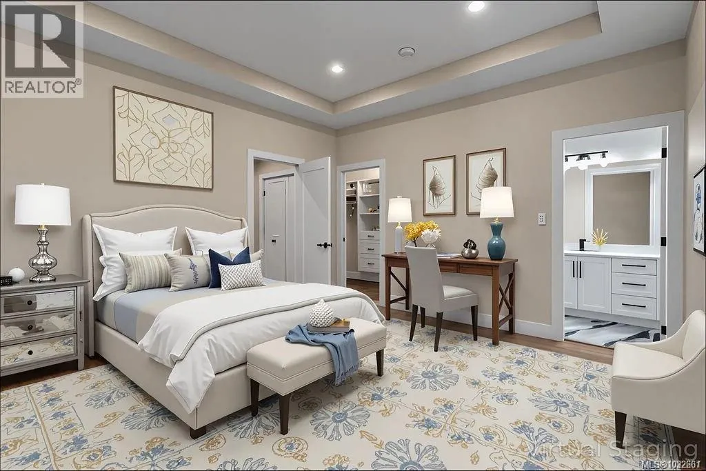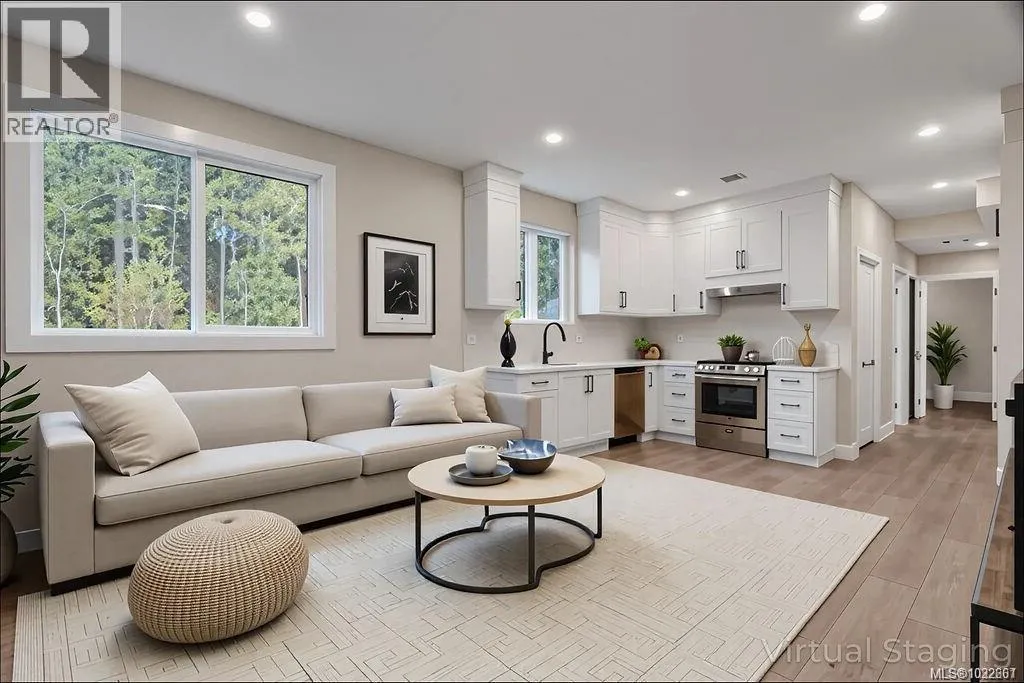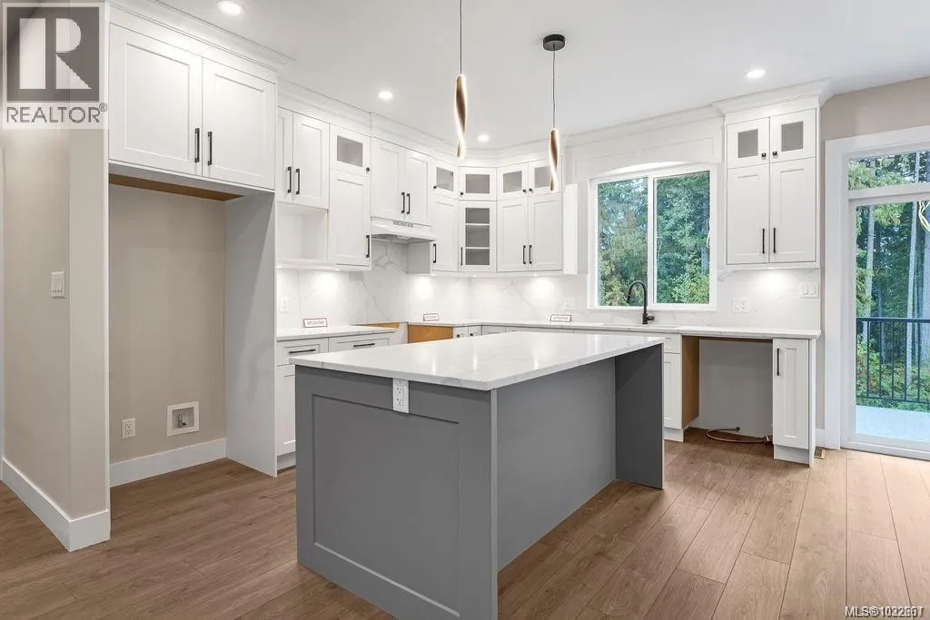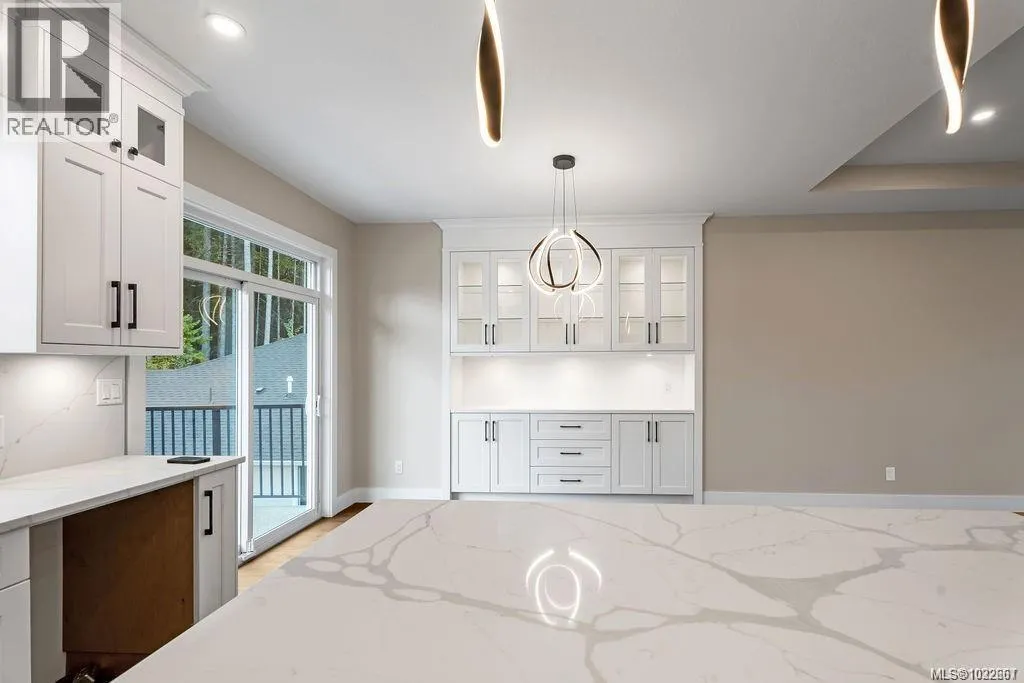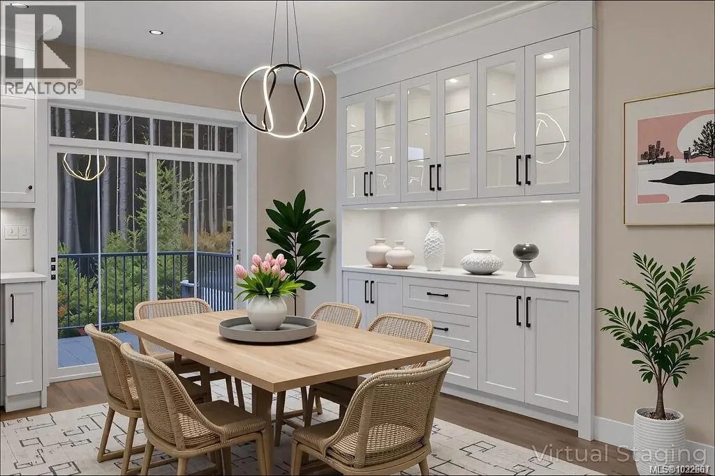 A modern and private home on a no thru road where thoughtful details and quality finishes shine throughout. An open-concept main level offers great flow between the living, kitchen, and dining areas. The living room features a tray ceiling and cozy fireplace, while the dining area includes custom built-in cabinetry. The kitchen features a spacious island, quartz countertops and elegant