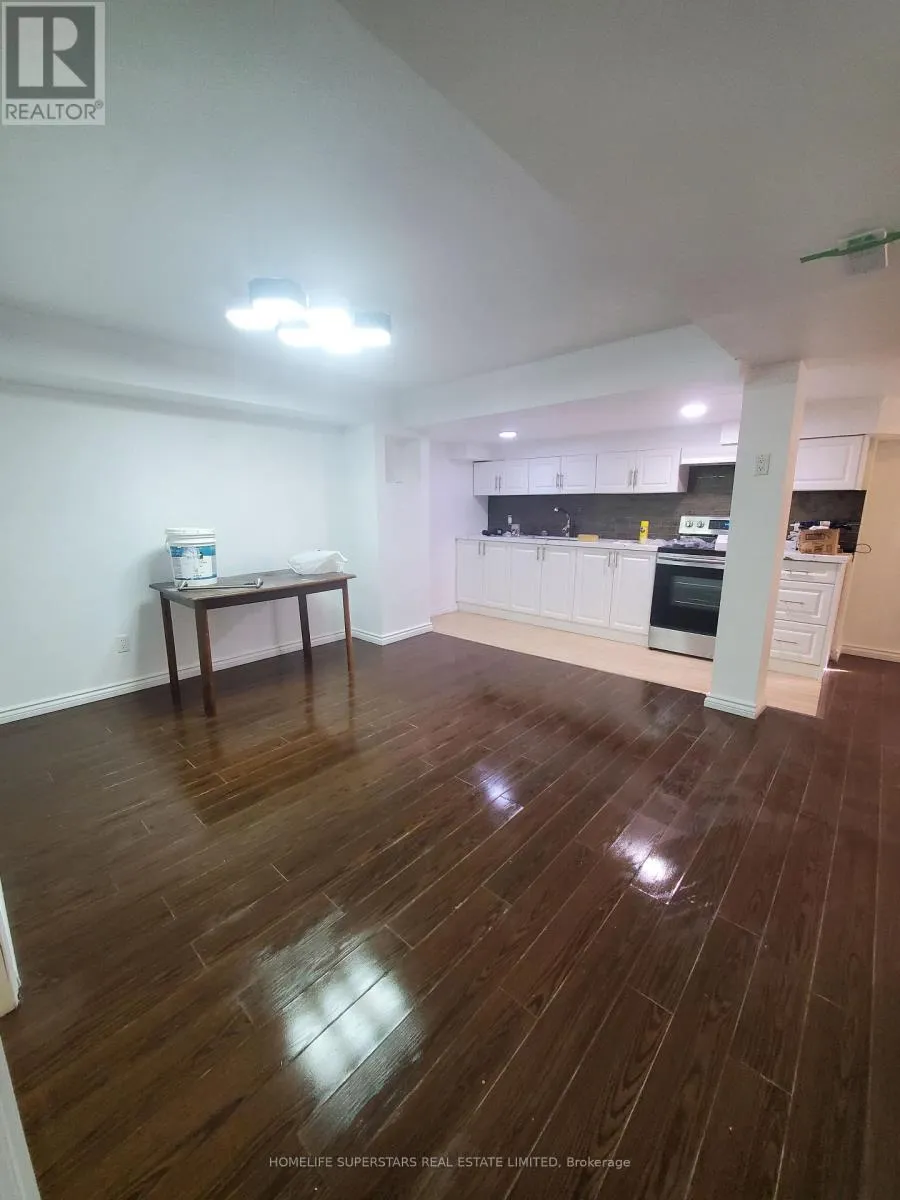 This beautiful basement apartment was fully renovated in 2023 and is ready for you to move in. It features a modern kitchen with white cabinets, dark tile backsplash, and a stainless steel stove, plus a spacious open-concept living and dining area with dark hardwood floors and pot lights throughout. The unit has two good-sized bedrooms with hardwood floors and windows,