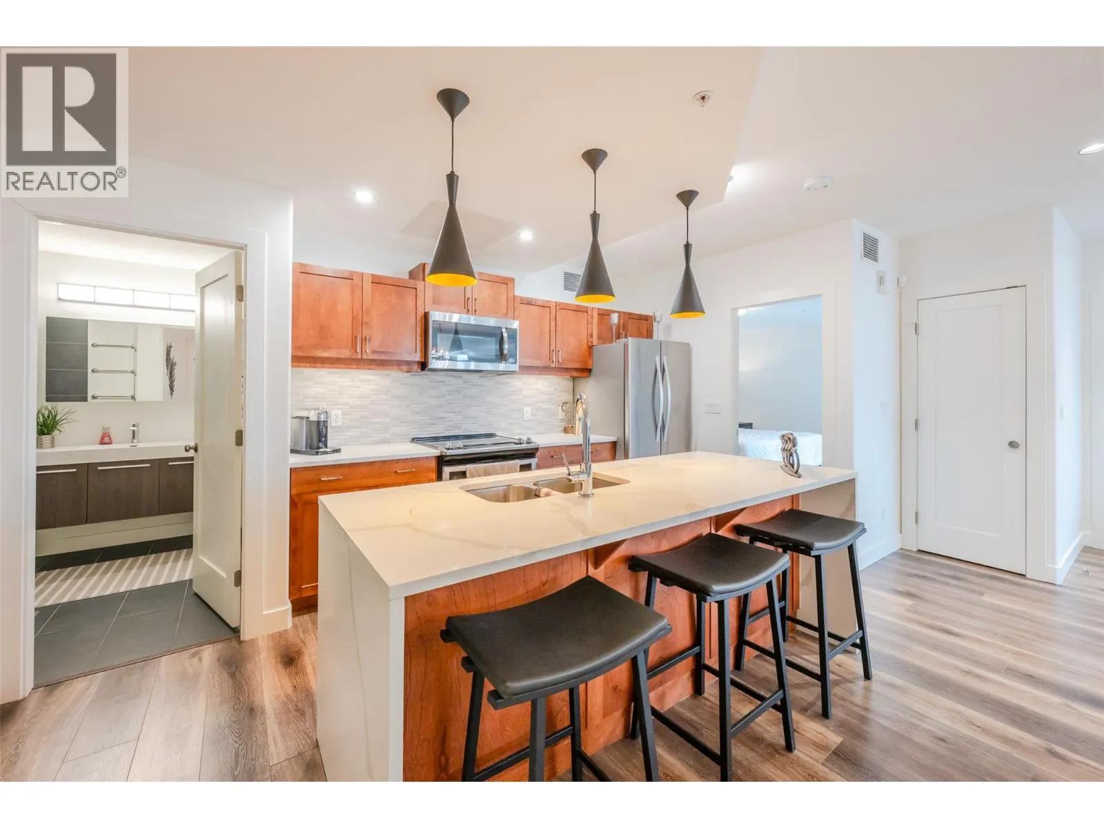 Move-in ready, this beautifully renovated one-bedroom plus den ground-floor condo is ideally located just steps from Okanagan Beach. An exceptional added value, the property includes an adjacent commercial unit, currently leased to a long-term month-to-month tenant—offering a unique opportunity to live in one space while generating income or operating a business next door. The residential unit features a spacious walkout