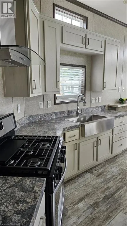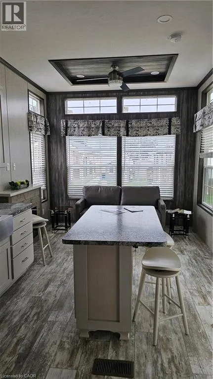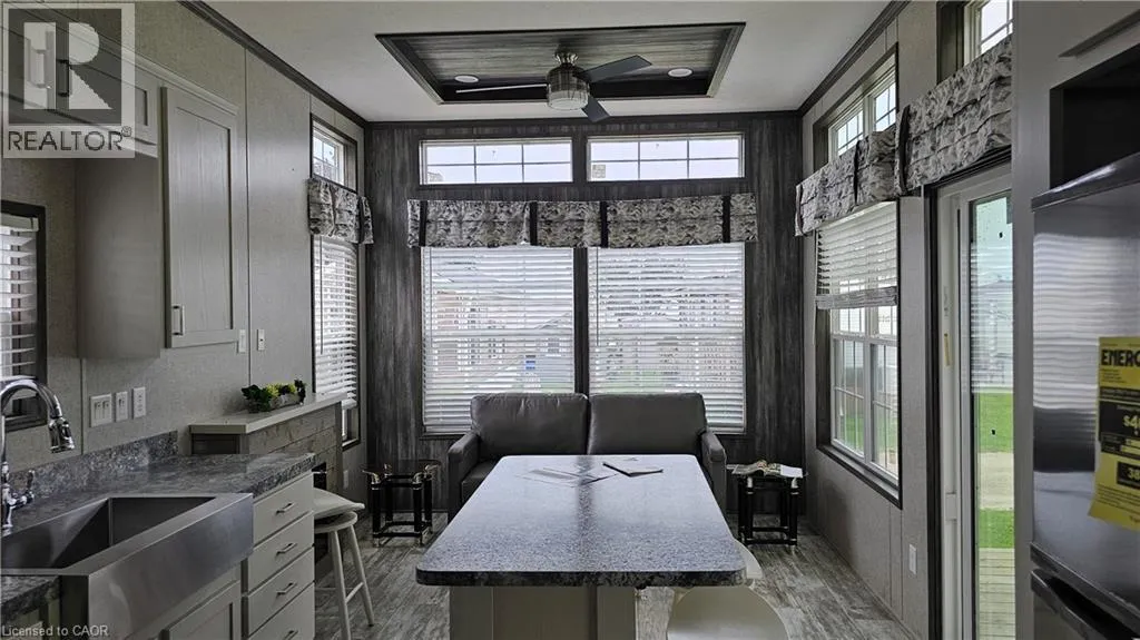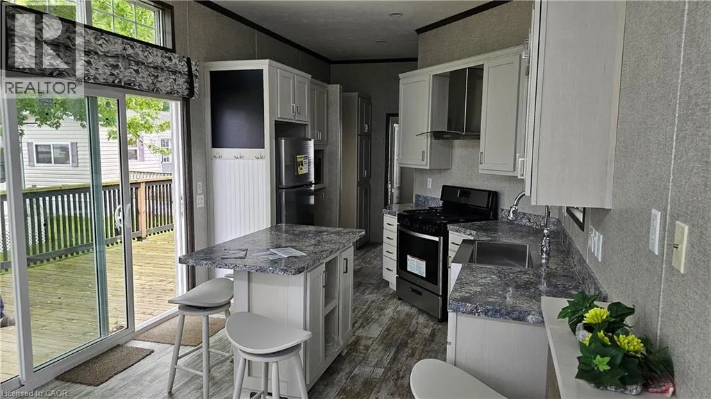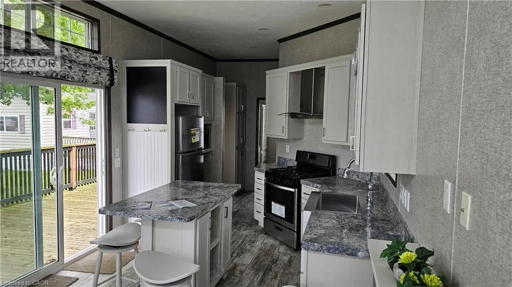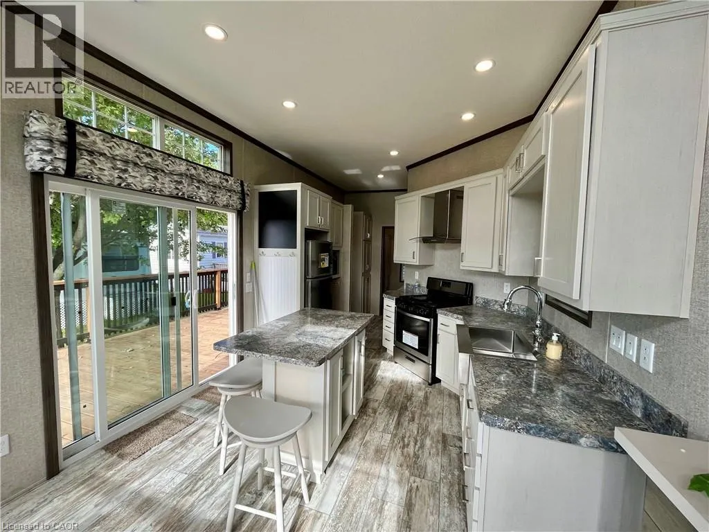 Modern, move-in ready seasonal retreat at Collins Harbour Marina Resort. This well-maintained unit offers a bright, open-concept layout with high ceilings and large windows that fill the space with natural light. The stylish kitchen features stainless steel appliances, a centre island, and plenty of storage, making it both functional and inviting. The comfortable living area includes a tray ceiling and
