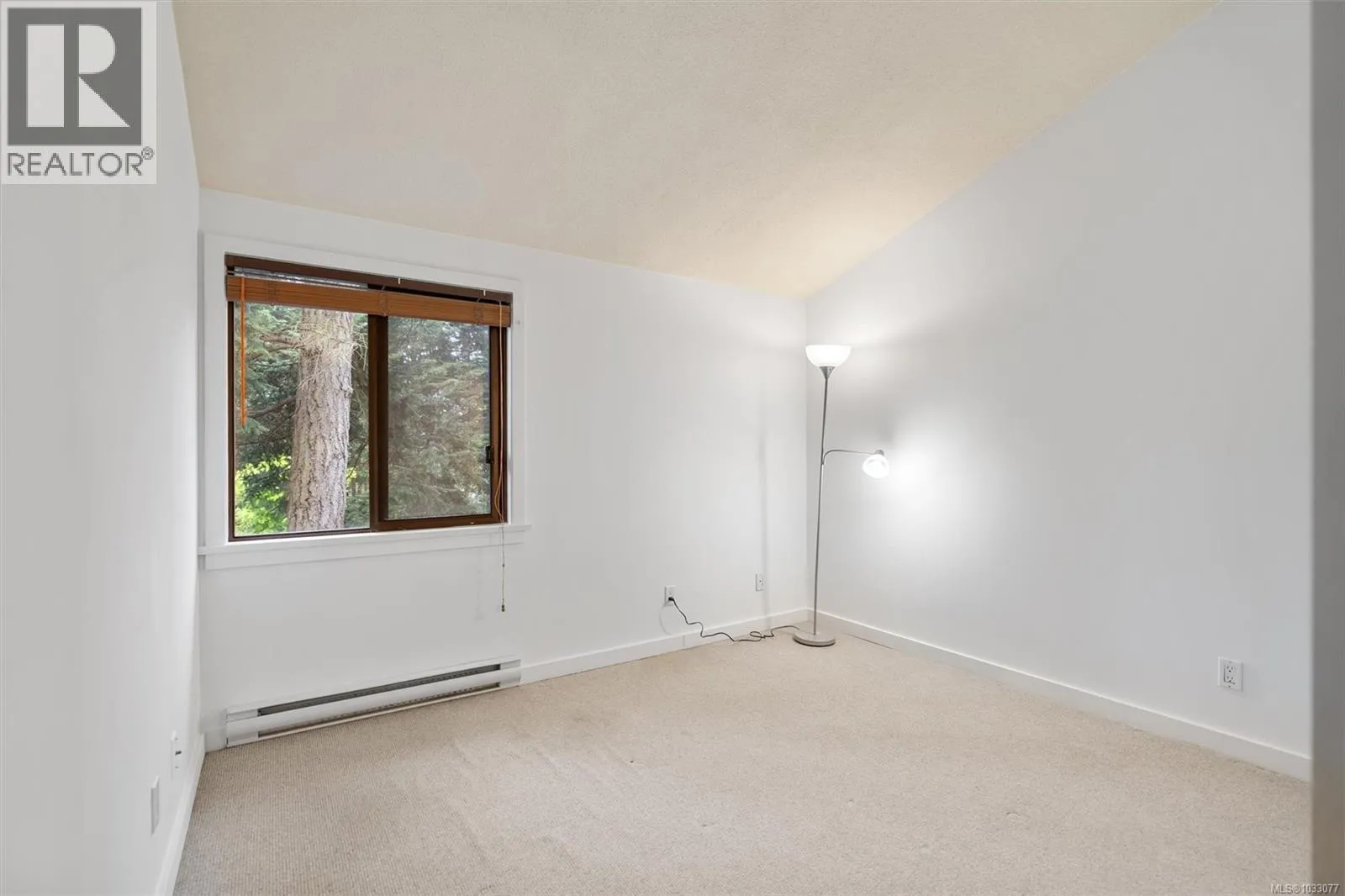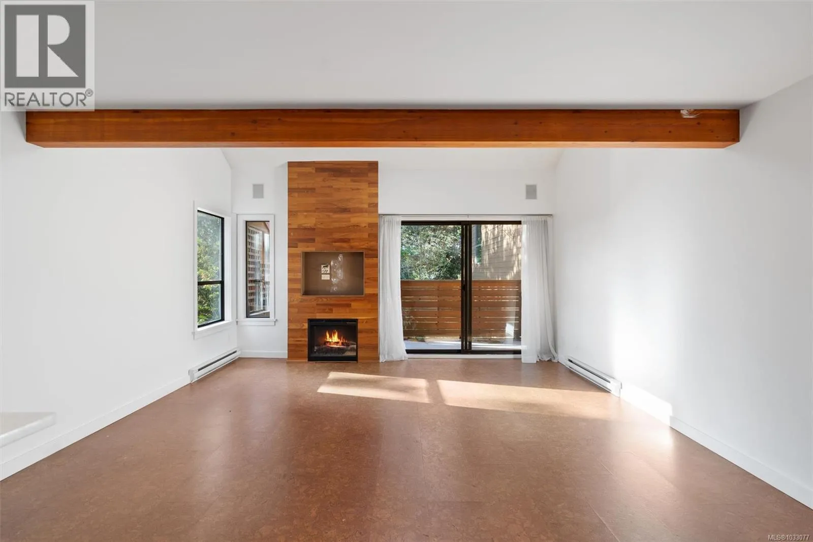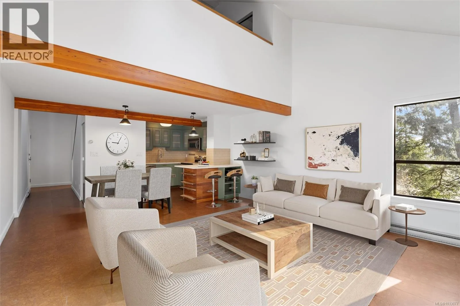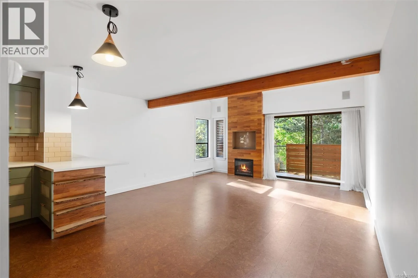 Tucked into a quiet, forested pocket of Sidney just steps from the marina on Harbour Road, this top floor 2 bed/2 bath townhome offers a rare mix of privacy and convenience. At 1,100 sq ft, the layout feels open and airy, with 14-foot ceilings, cork flooring, and an electric fireplace at the heart of the living and dining areas. The
