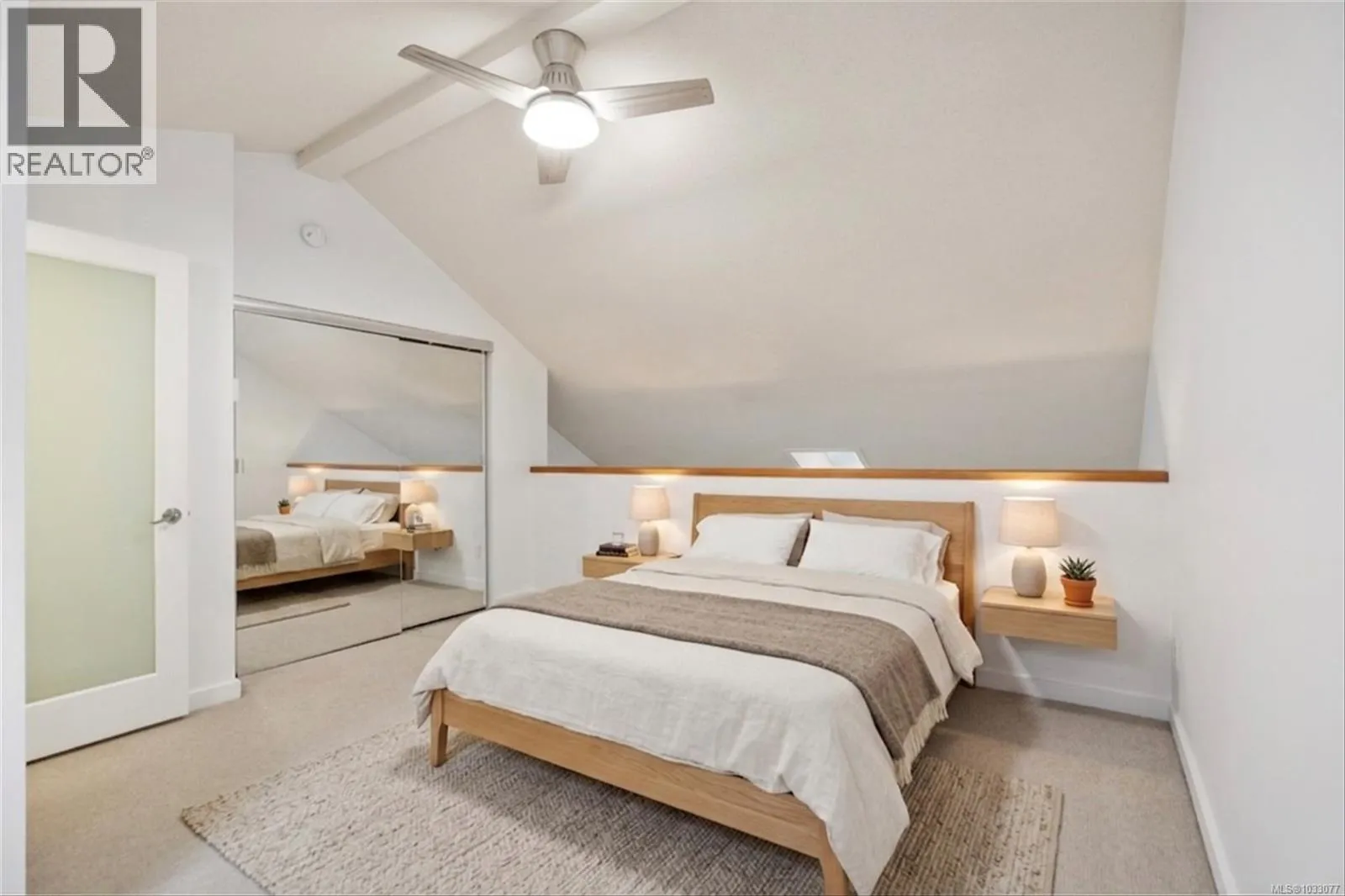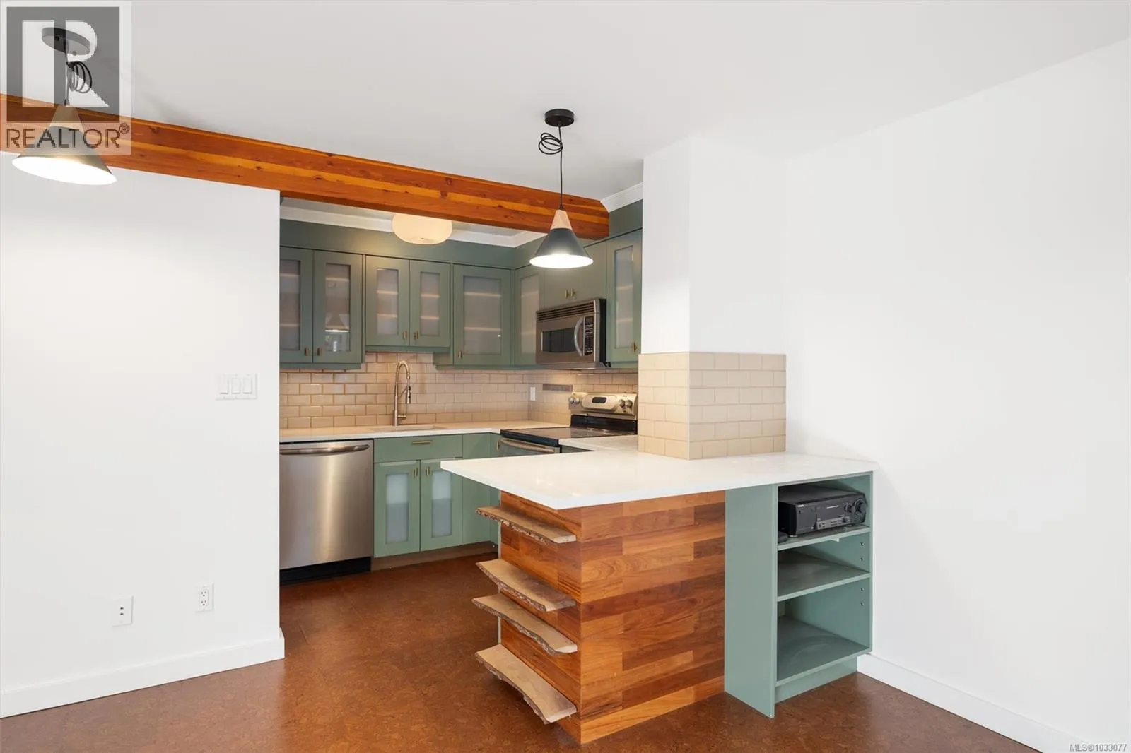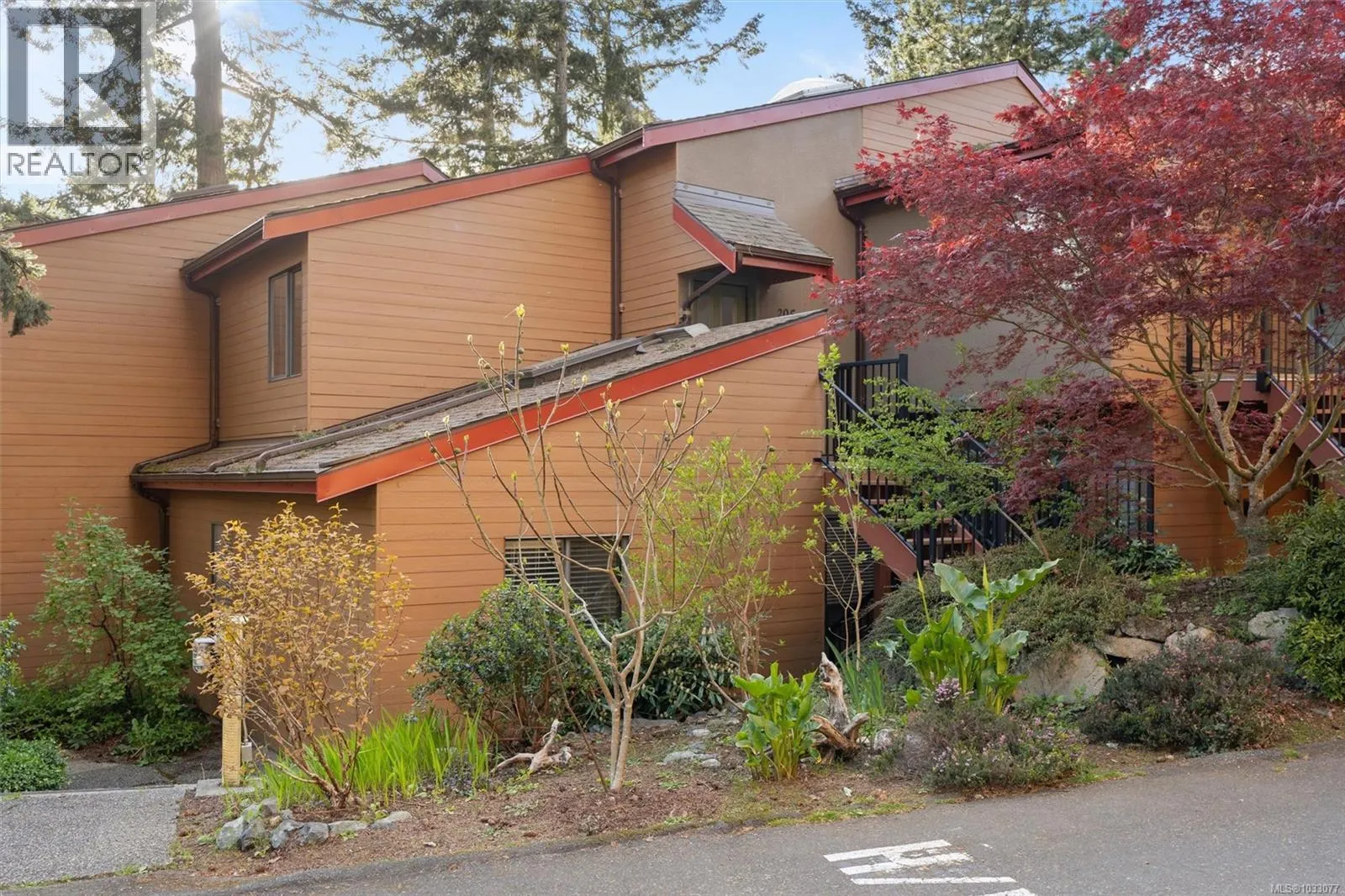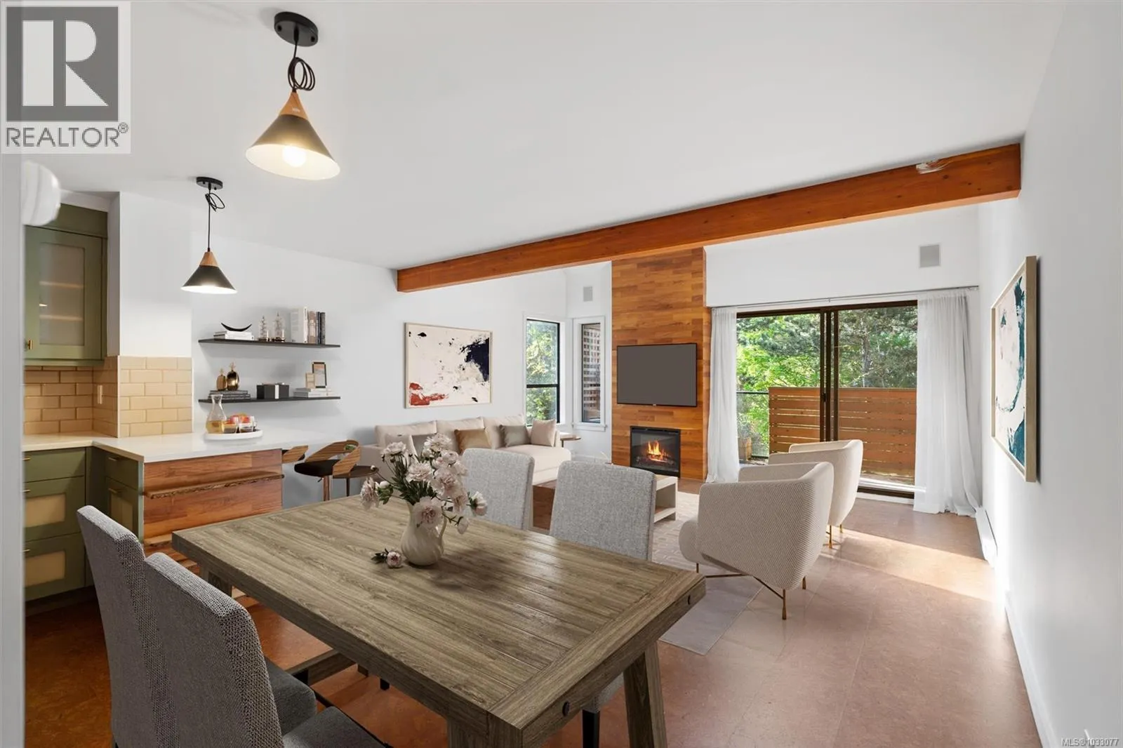Tucked into a quiet, forested pocket of Sidney just steps from the marina on Harbour Road, this top floor 2 bed/2 bath townhome offers a rare mix of privacy and convenience. At 1,100 sq ft, the layout feels open and airy, with 14-foot ceilings, cork flooring, and an electric fireplace at the heart of the living and dining areas. The