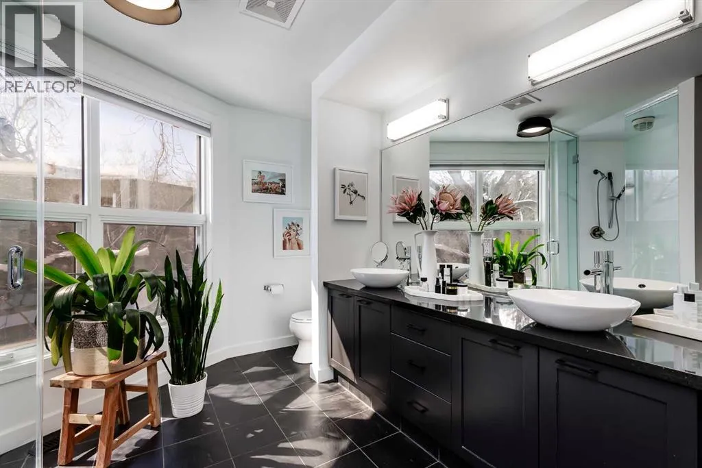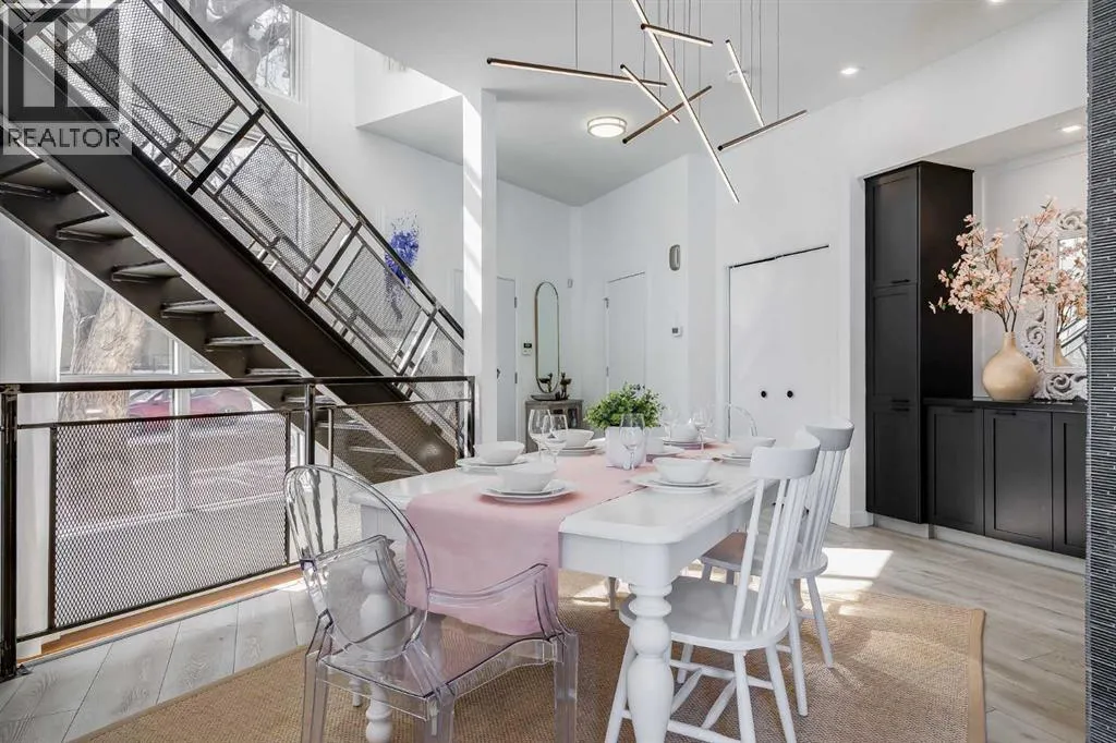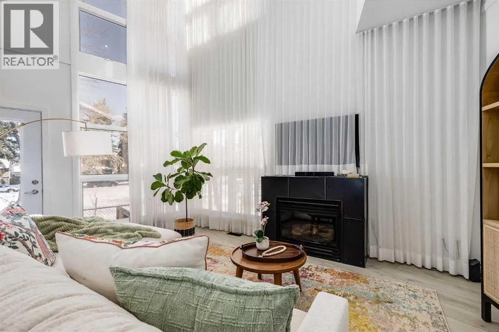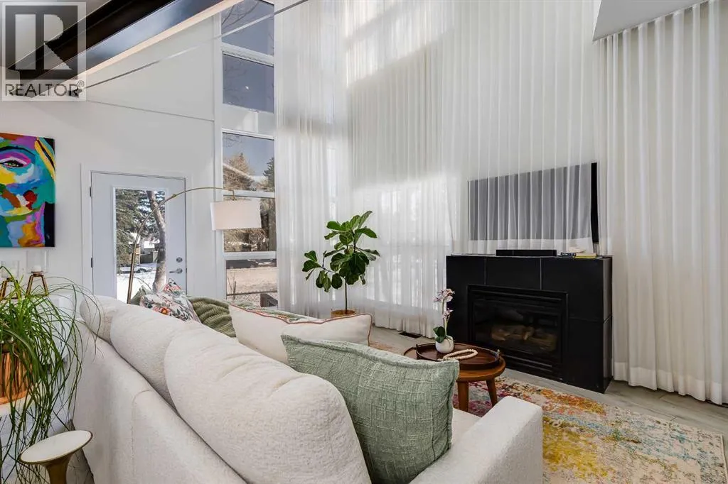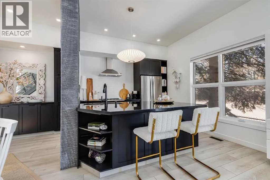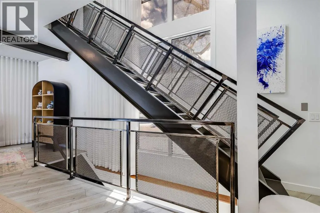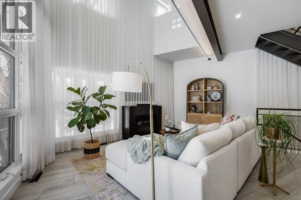 tucked along a quiet, tree-lined street just steps from the neighborhood’s well-known shops, restaurants, and amenities. The exterior presents a modern blend of stucco and corrugated metal siding, complemented by oversized, energy-efficient reflective windows. Inside, over $80,000 in renovations enhance both form and function. The main floor opens with a generous entryway and continues into an open-concept layout grounded by wide-plank vinyl flooring. Soaring 18-foot ceilings, expansive windows, and full-height drapery bring in natural light and add dimension, while subtle industrial elements, including exposed steel features, contribute to the home’s architectural character. The kitchen is both practical and refined, featuring black cabinetry, granite countertops, a stylish backsplash, stainless steel appliances, and a large island with seating. Adjacent dining and living areas provide a comfortable setting for everyday living or hosting, with designer lighting over the dining space and a gas fireplace anchoring the living room. Full-height windows frame views of the surrounding greenspace and park, creating a strong connection to the outdoors. A two-piece powder room completes this level. Upstairs, the entire loft is dedicated to the primary retreat, offering a private and spacious layout with cork flooring underfoot, a large walk-in closet, and a five-piece ensuite with dual sinks, a deep soaker tub, and an oversized glass-enclosed shower with bench seating. The upper balcony extends the living space outdoors, with ample room for seating and elevated views through the surrounding trees. The fully developed basement adds further flexibility with a spacious recreation area suited for a media room, office, or fitness space. A full wall of built-in shelving provides both storage and display, while additional pot lighting ensures the space is well-lit into the evening. A spacious den and a three-piece bathroom offer privacy for guests or extended use, along with additional storage. Outside, the property backs directly onto greenspace and a park, creating a natural extension of the home’s living space. A private yard offers room for a BBQ and easy access to outdoor areas. Park conveniently in any of the ample stalls at your front door or in a titled stall within the heated garage. Located in one of Calgary’s most established inner-city neighborhoods, this home is within walking distance to boutique shopping, dining, cafés, and local breweries. The Bow River pathways are just minutes away, and you’ll enjoy quick access to downtown by car or public transit. Check out the 3D Tour! (id:64429)