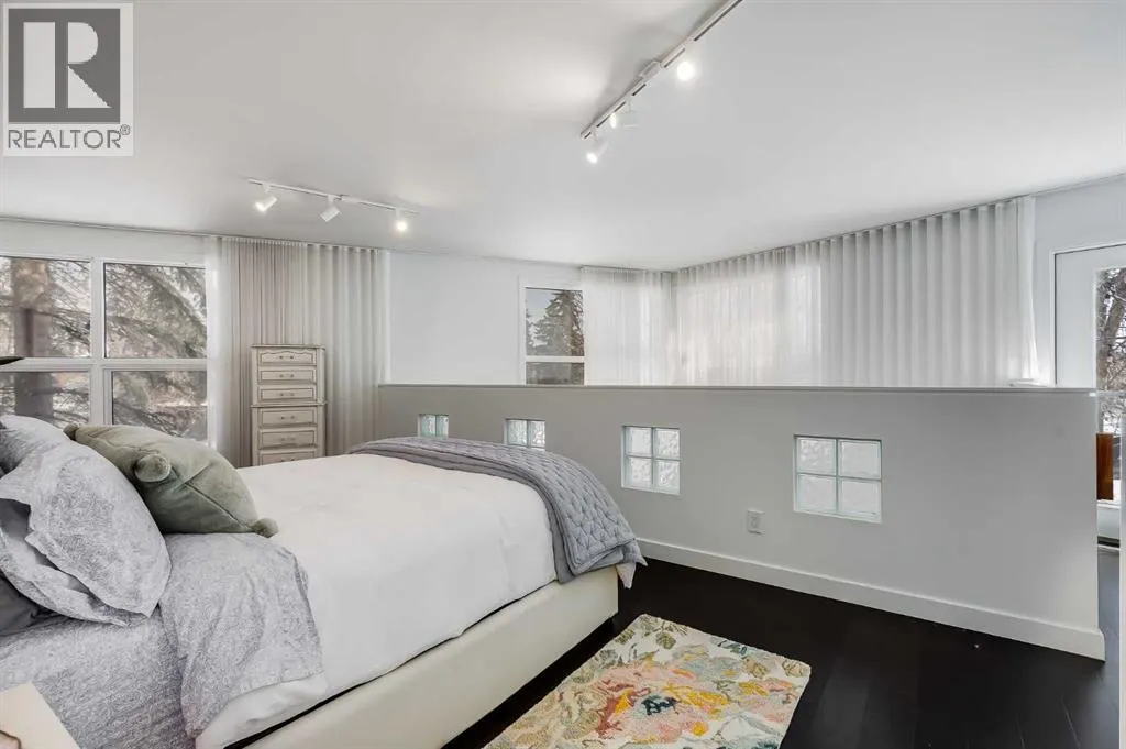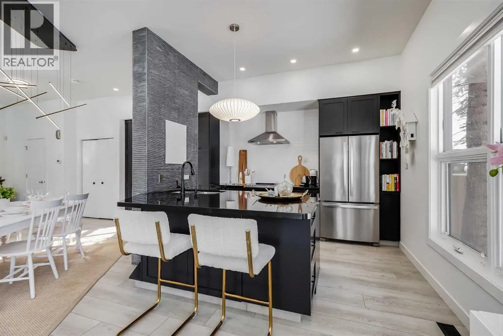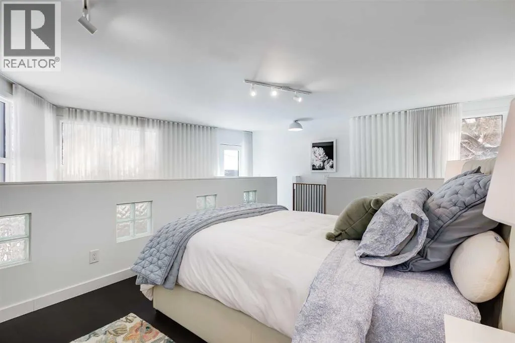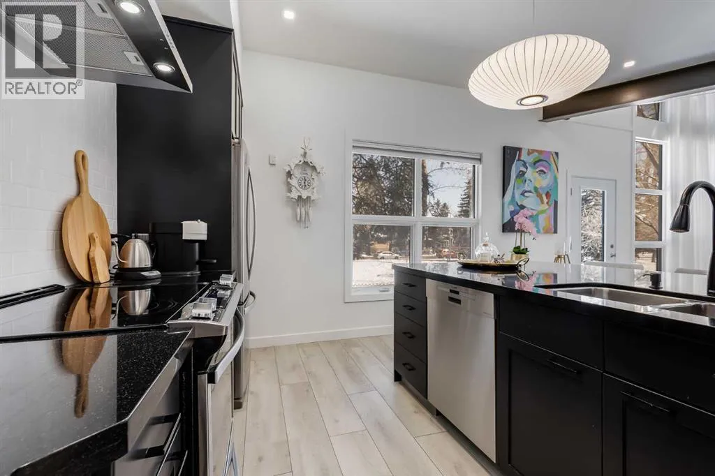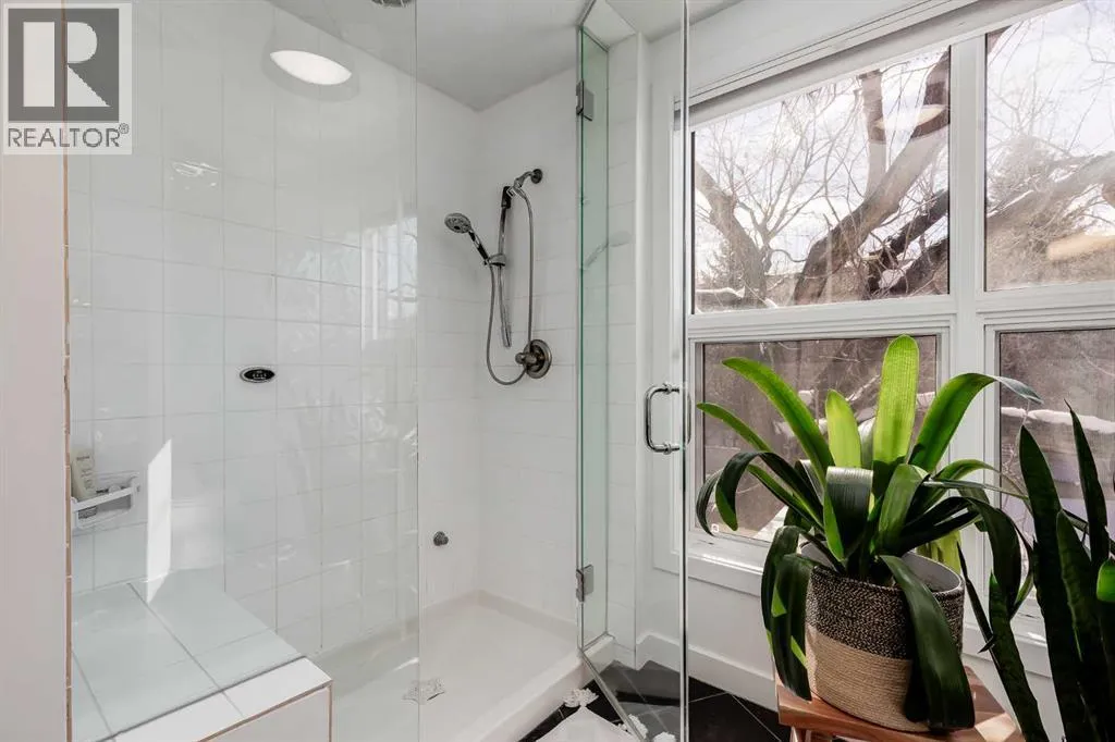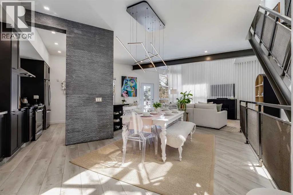 tucked along a quiet, tree-lined street just steps from the neighborhood’s well-known shops, restaurants, and amenities. The exterior presents a modern blend of stucco and corrugated metal siding, complemented by oversized, energy-efficient reflective windows. Inside, over $80,000 in renovations enhance both form and function. The main floor opens with a generous entryway and continues into an open-concept layout grounded by wide-plank vinyl flooring. Soaring 18-foot ceilings, expansive windows, and full-height drapery bring in natural light and add dimension, while subtle industrial elements, including exposed steel features, contribute to the home’s architectural character. The kitchen is both practical and refined, featuring black cabinetry, granite countertops, a stylish backsplash, stainless steel appliances, and a large island with seating. Adjacent dining and living areas provide a comfortable setting for everyday living or hosting, with designer lighting over the dining space and a gas fireplace anchoring the living room. Full-height windows frame views of the surrounding greenspace and park, creating a strong connection to the outdoors. A two-piece powder room completes this level. Upstairs, the entire loft is dedicated to the primary retreat, offering a private and spacious layout with cork flooring underfoot, a large walk-in closet, and a five-piece ensuite with dual sinks, a deep soaker tub, and an oversized glass-enclosed shower with bench seating. The upper balcony extends the living space outdoors, with ample room for seating and elevated views through the surrounding trees. The fully developed basement adds further flexibility with a spacious recreation area suited for a media room, office, or fitness space. A full wall of built-in shelving provides both storage and display, while additional pot lighting ensures the space is well-lit into the evening. A spacious den and a three-piece bathroom offer privacy for guests or extended use, along with additional storage. Outside, the property backs directly onto greenspace and a park, creating a natural extension of the home’s living space. A private yard offers room for a BBQ and easy access to outdoor areas. Park conveniently in any of the ample stalls at your front door or in a titled stall within the heated garage. Located in one of Calgary’s most established inner-city neighborhoods, this home is within walking distance to boutique shopping, dining, cafés, and local breweries. The Bow River pathways are just minutes away, and you’ll enjoy quick access to downtown by car or public transit. Check out the 3D Tour! (id:64429)