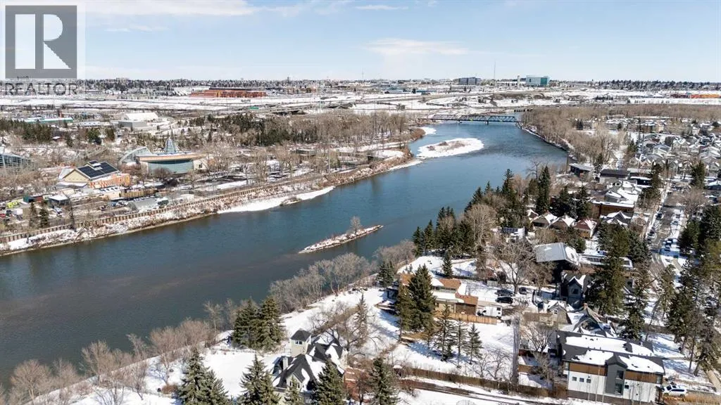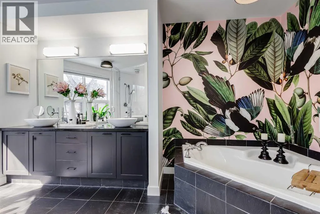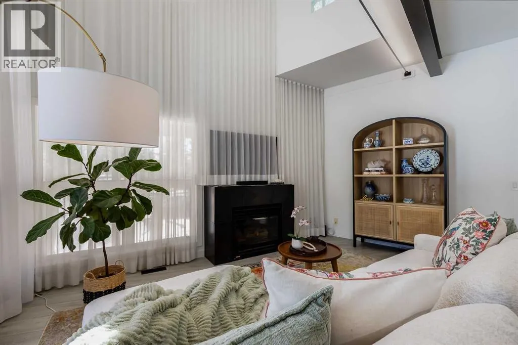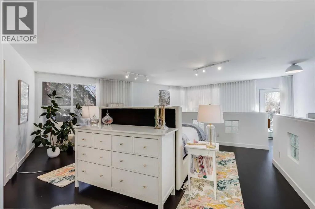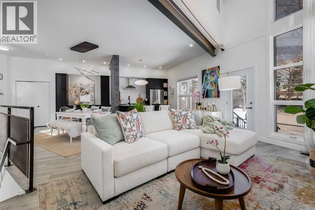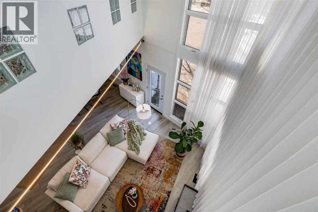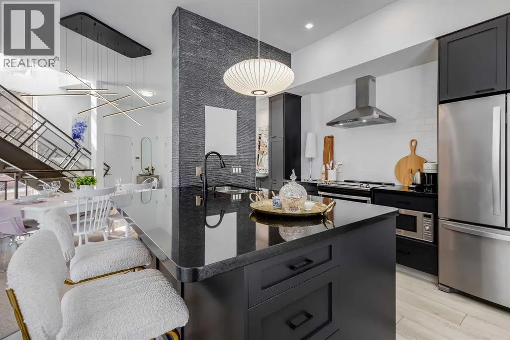 tucked along a quiet, tree-lined street just steps from the neighborhood’s well-known shops, restaurants, and amenities. The exterior presents a modern blend of stucco and corrugated metal siding, complemented by oversized, energy-efficient reflective windows. Inside, over $80,000 in renovations enhance both form and function. The main floor opens with a generous entryway and continues into an open-concept layout grounded by wide-plank vinyl flooring. Soaring 18-foot ceilings, expansive windows, and full-height drapery bring in natural light and add dimension, while subtle industrial elements, including exposed steel features, contribute to the home’s architectural character. The kitchen is both practical and refined, featuring black cabinetry, granite countertops, a stylish backsplash, stainless steel appliances, and a large island with seating. Adjacent dining and living areas provide a comfortable setting for everyday living or hosting, with designer lighting over the dining space and a gas fireplace anchoring the living room. Full-height windows frame views of the surrounding greenspace and park, creating a strong connection to the outdoors. A two-piece powder room completes this level. Upstairs, the entire loft is dedicated to the primary retreat, offering a private and spacious layout with cork flooring underfoot, a large walk-in closet, and a five-piece ensuite with dual sinks, a deep soaker tub, and an oversized glass-enclosed shower with bench seating. The upper balcony extends the living space outdoors, with ample room for seating and elevated views through the surrounding trees. The fully developed basement adds further flexibility with a spacious recreation area suited for a media room, office, or fitness space. A full wall of built-in shelving provides both storage and display, while additional pot lighting ensures the space is well-lit into the evening. A spacious den and a three-piece bathroom offer privacy for guests or extended use, along with additional storage. Outside, the property backs directly onto greenspace and a park, creating a natural extension of the home’s living space. A private yard offers room for a BBQ and easy access to outdoor areas. Park conveniently in any of the ample stalls at your front door or in a titled stall within the heated garage. Located in one of Calgary’s most established inner-city neighborhoods, this home is within walking distance to boutique shopping, dining, cafés, and local breweries. The Bow River pathways are just minutes away, and you’ll enjoy quick access to downtown by car or public transit. Check out the 3D Tour! (id:64429)