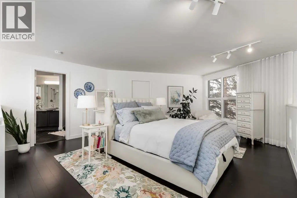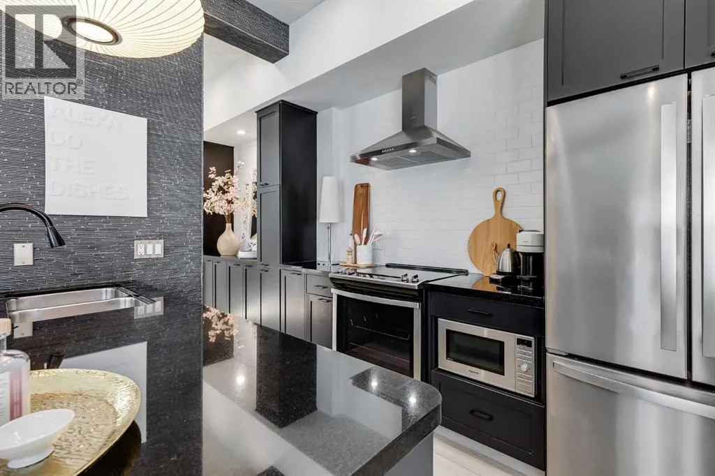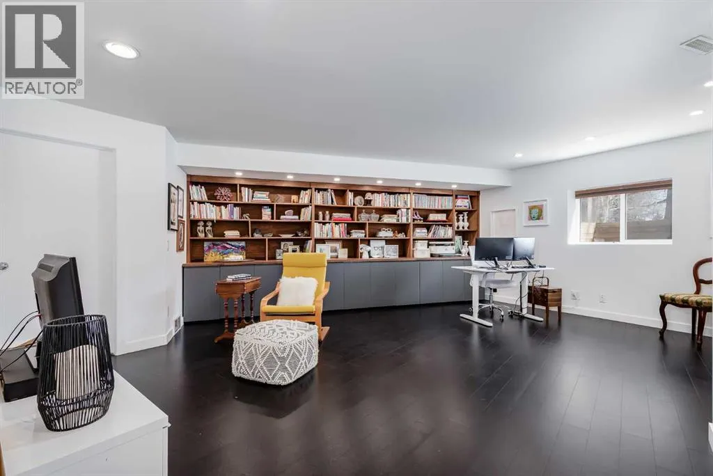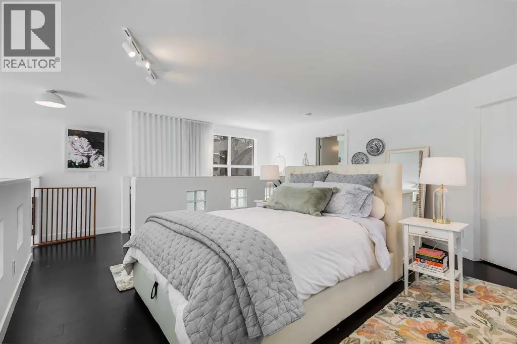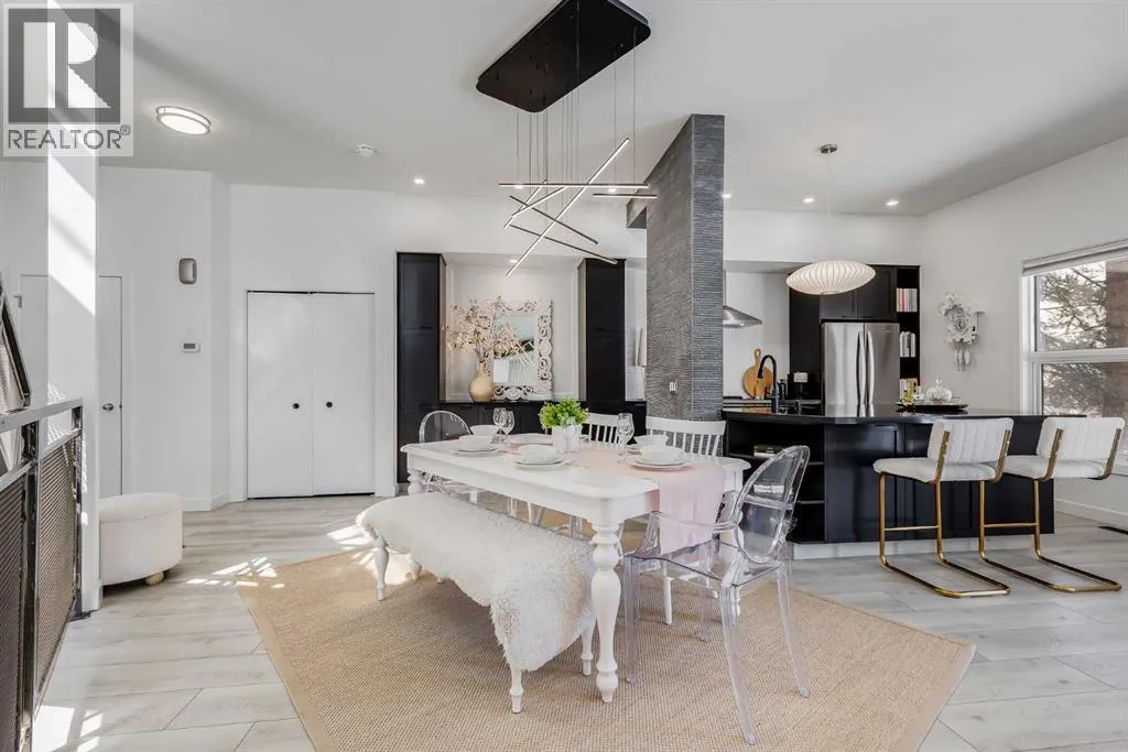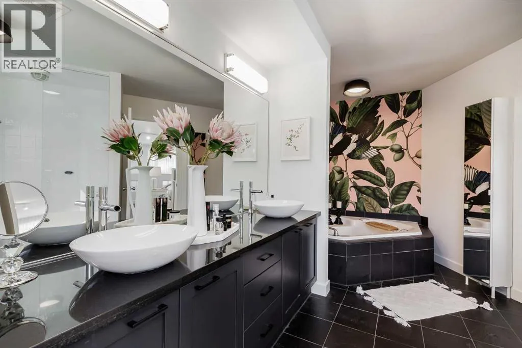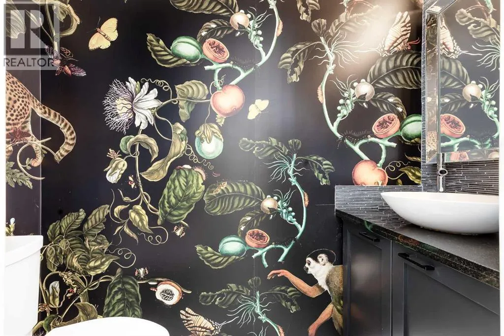 tucked along a quiet, tree-lined street just steps from the neighborhood’s well-known shops, restaurants, and amenities. The exterior presents a modern blend of stucco and corrugated metal siding, complemented by oversized, energy-efficient reflective windows. Inside, over $80,000 in renovations enhance both form and function. The main floor opens with a generous entryway and continues into an open-concept layout grounded by wide-plank vinyl flooring. Soaring 18-foot ceilings, expansive windows, and full-height drapery bring in natural light and add dimension, while subtle industrial elements, including exposed steel features, contribute to the home’s architectural character. The kitchen is both practical and refined, featuring black cabinetry, granite countertops, a stylish backsplash, stainless steel appliances, and a large island with seating. Adjacent dining and living areas provide a comfortable setting for everyday living or hosting, with designer lighting over the dining space and a gas fireplace anchoring the living room. Full-height windows frame views of the surrounding greenspace and park, creating a strong connection to the outdoors. A two-piece powder room completes this level. Upstairs, the entire loft is dedicated to the primary retreat, offering a private and spacious layout with cork flooring underfoot, a large walk-in closet, and a five-piece ensuite with dual sinks, a deep soaker tub, and an oversized glass-enclosed shower with bench seating. The upper balcony extends the living space outdoors, with ample room for seating and elevated views through the surrounding trees. The fully developed basement adds further flexibility with a spacious recreation area suited for a media room, office, or fitness space. A full wall of built-in shelving provides both storage and display, while additional pot lighting ensures the space is well-lit into the evening. A spacious den and a three-piece bathroom offer privacy for guests or extended use, along with additional storage. Outside, the property backs directly onto greenspace and a park, creating a natural extension of the home’s living space. A private yard offers room for a BBQ and easy access to outdoor areas. Park conveniently in any of the ample stalls at your front door or in a titled stall within the heated garage. Located in one of Calgary’s most established inner-city neighborhoods, this home is within walking distance to boutique shopping, dining, cafés, and local breweries. The Bow River pathways are just minutes away, and you’ll enjoy quick access to downtown by car or public transit. Check out the 3D Tour! (id:64429)