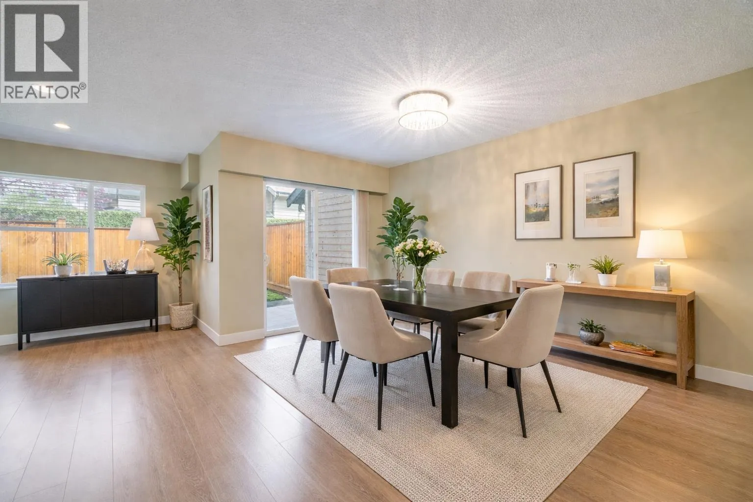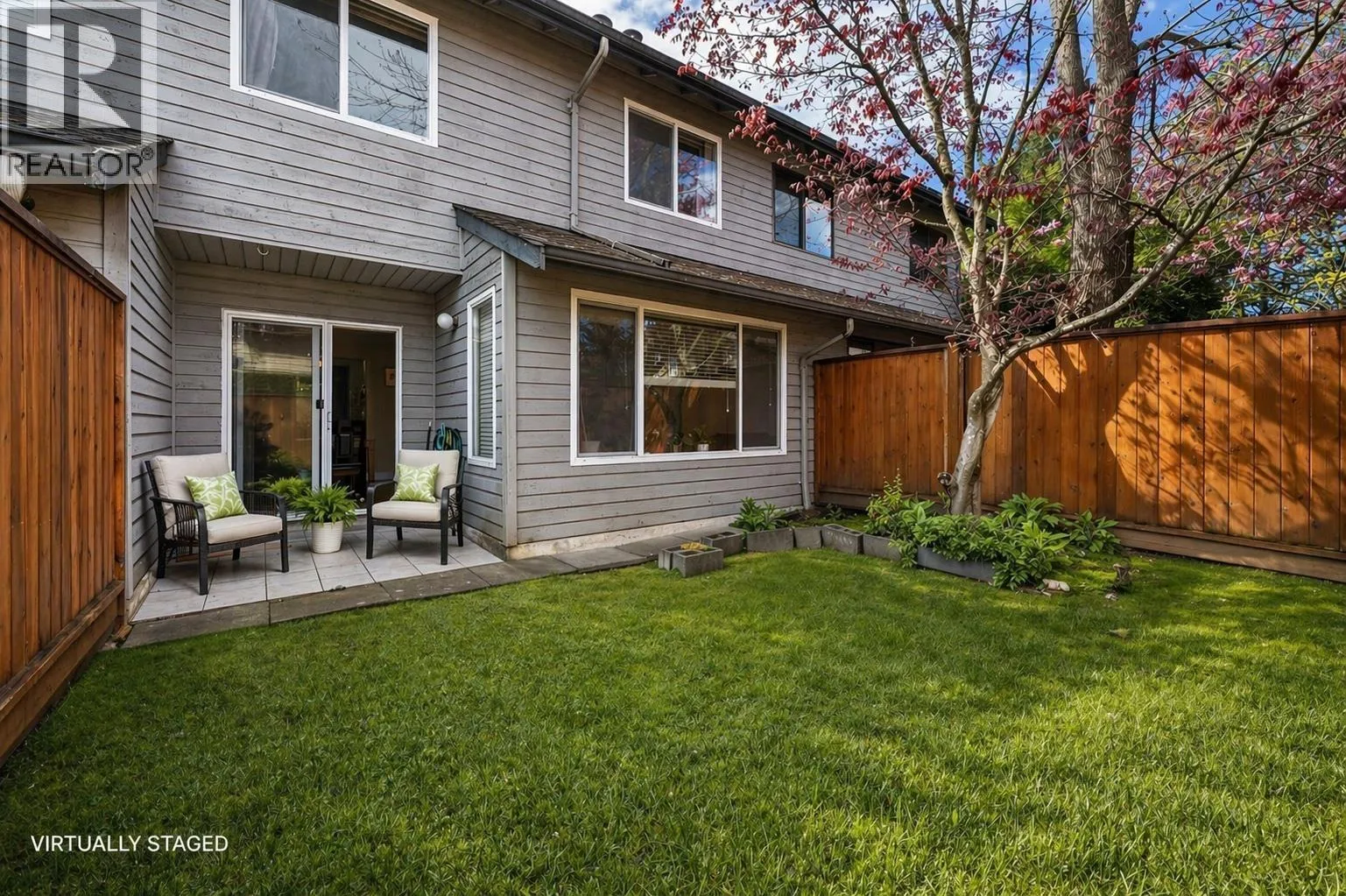 A rare find-a 3 bedroom townhome in family friendly complex! Main floor living, spacious living room/dining areas, laminate flooring, bright white kitchen (quartz counter tops) opens onto eating area. Easy access to private fenced yard with patio area. Upper floor has three bedrooms plus a den, laminate flooring. Primary bedroom with a private deck (11’x10′) walk in closet adjacent to