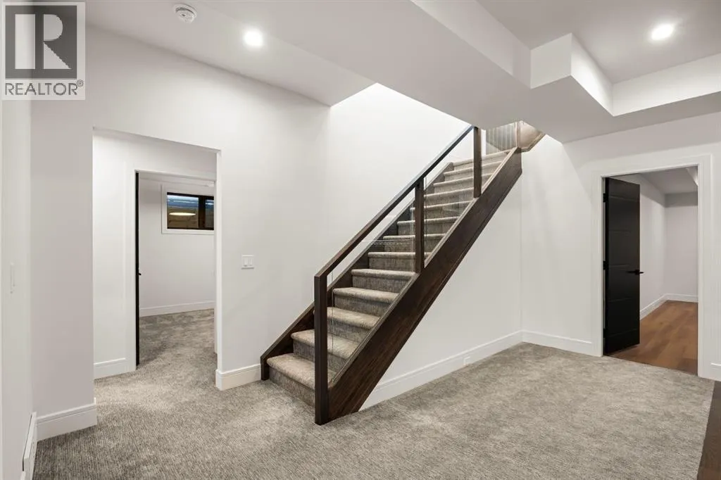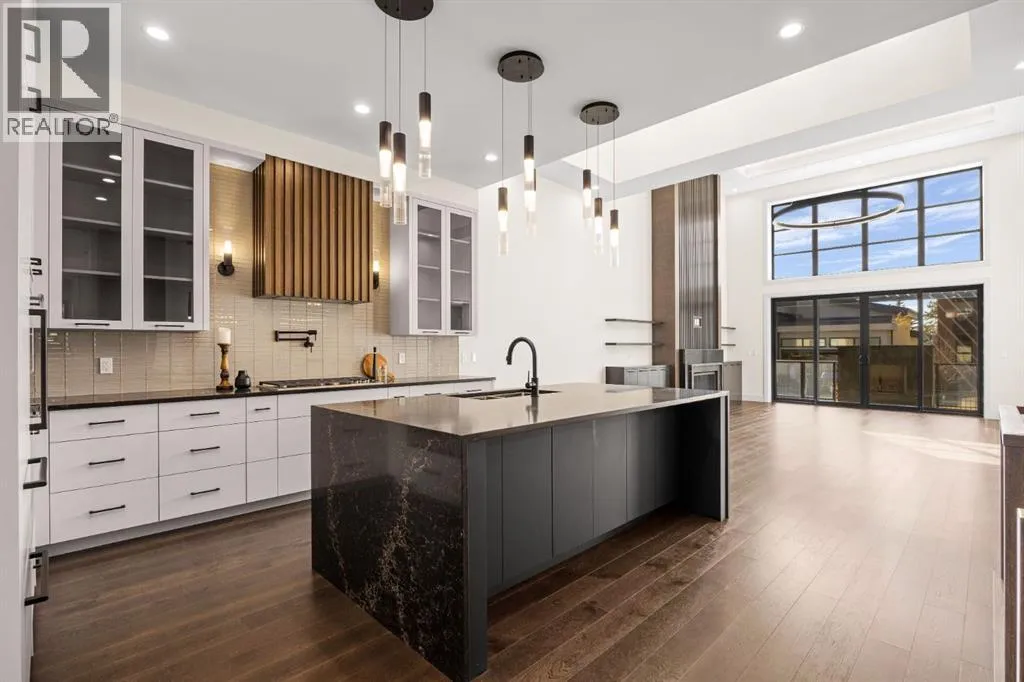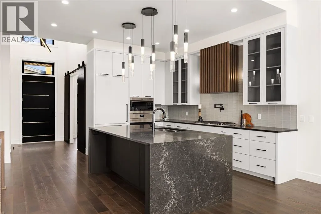 in the mountains, this home offers the peace of mind and maintenance-free ease you’ve been looking for without sacrificing bespoke finishes and premium construction. The interior is a masterclass in modern elegance, defined by a high-contrast palette where dark elements meet crisp gallery walls and gleaming floors. The open-concept main level features soaring ceilings, multiple skylights, and expansive windows that flood the space with natural light. A custom fireplace surround reaching the 16’ ceilings anchors the great room creating a chic focal point in the home, while large doors transition seamlessly to a west-facing patio. This outdoor oasis extends the living space and is elevated by a built-in gas fireplace and a remote-controlled louvred pergola, allowing customized sun exposure or protection from the elements while entertaining.The kitchen is a flawless blend of style and utility, featuring premium, integrated Wolf and Sub-Zero appliances, custom cabinetry, plenty of counter space and a commanding island wrapped in deep, inky quartz that provides a sophisticated contrast to the light cabinetry. The main floor continues to impress with a primary suite that serves as a true sanctuary, boasting a walk-in dressing room and a spa-inspired ensuite with in-floor heat, dual vanities, a sizeable shower and a freestanding soaker tub. A private den with sleek barn door access, a mood-filled powder room featuring bold designer wallpaper and a statement pendant light, and a well-appointed laundry room complete the main level, ensuring all your daily es sentials are accessible on one floor.The fully developed lower level, with nine-foot ceilings and a second fireplace, is engineered for lifestyle flexibility and hosting. A generous recreation area features a designer wet bar with custom glossy millwork and dual refrigeration, while two additional bedrooms provide ideal accommodations for guests or teens. A flex room offers the perfect footprint for a home gym or hobby space. The spacious lower patio leads directly to the fenced, private west facing yard. The oversized double garage boasts a heated slab, transom windows and ceiling height to accommodate a car lift. Built to an exceptional standard with full Insulated Concrete Form (ICF) construction to the soffit line and triple-glazed windows, this home offers superior sound attenuation and thermal efficiency. Located just minutes from Aspen Landing and the Rocky Mountains, this villa offers an unparalleled blend of privacy and convenience for the next chapter of your life. (id:62650)