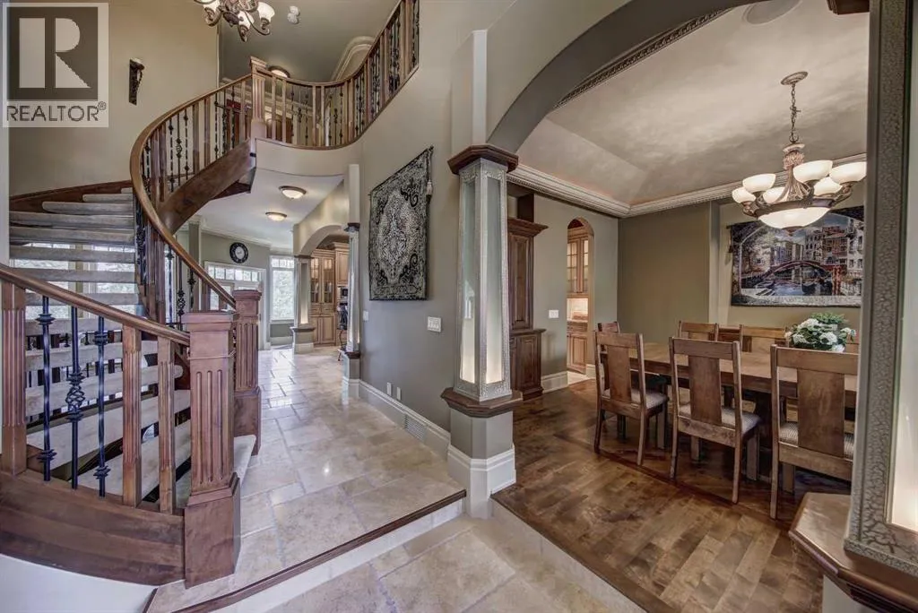 Set against the breathtaking natural backdrop of Fish Creek Provincial Park, this exceptional estate home by Taradar Fine Homes offers nearly 5,000 square feet of exquisitely crafted living space, blending timeless elegance with modern luxury. The grand front entrance welcomes you with a sweeping curved staircase and soaring 10-foot ceilings, setting the tone for the meticulous attention to detail found