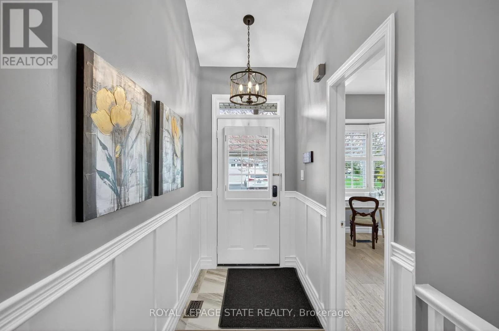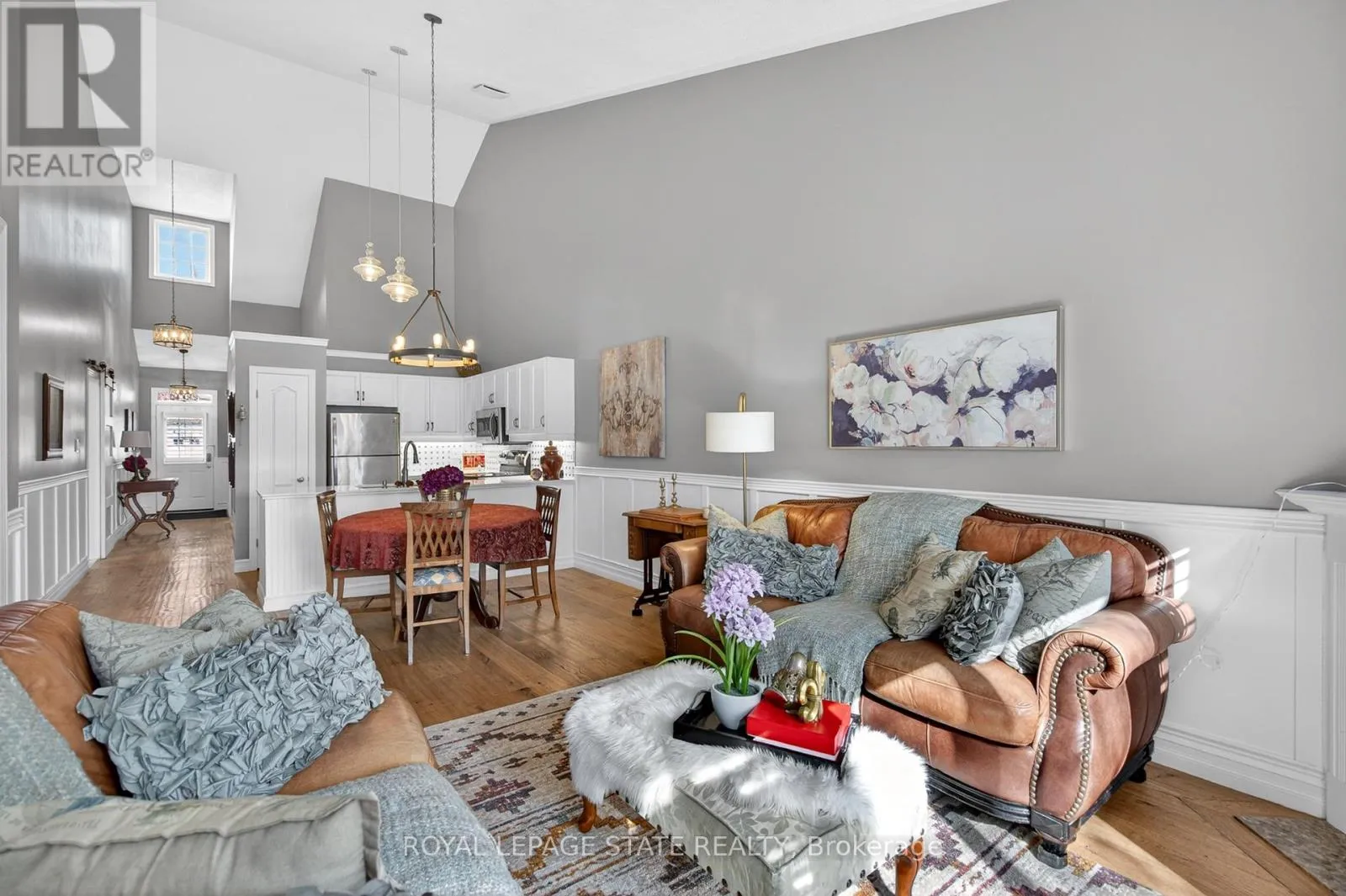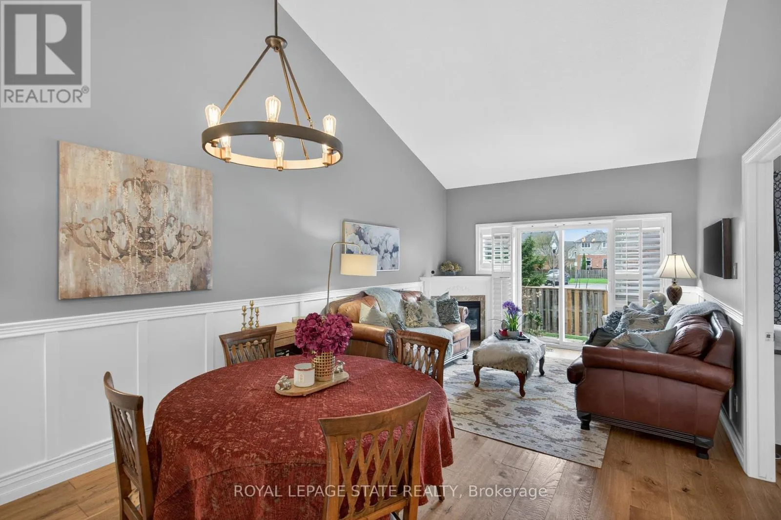 with an upper window welcomes you, leading to a versatile front bedroom with a bay window and oversized closet. The updated 4-piece main bathroom is thoughtfully finished, while the main level laundry facilities – doubling as a mudroom with inside garage access – adds everyday convenience. The open-concept main level is truly impressive, highlighted by soaring 18-foot vaulted ceilings. The tastefully updated kitchen features stainless steel appliances, quartz countertops, tiled backsplash, undermount lighting, and a pantry. A formal dining area flows seamlessly into the inviting living room, complete with a corner gas fireplace and sliding doors with sidelight windows leading to a private rear courtyard. The primary retreat is a standout, offering crown moulding, double closets, and a stunning 5-piece ensuite with a double vanity, corner glass shower, and relaxing soaker tub. The fully finished lower level expands the living space with a bright recreation room, bonus den (currently utilized as a 3rd bedroom), 4-piece bathroom, and ample storage. Noteworthy upgrades include stunning hardwood flooring throughout, trim, lighting fixtures, wainscotting, California shutters & more. Noteworthy mechanical updates include the sliding door to the rear courtyard (2018), furnace/central air conditioning (2019), roof shingles (2019) & more. Located in the Meadowlands, enjoy walkable access to shopping, restaurants, parks, schools, and quick highway connectivity – a lifestyle defined by convenience and community. (id:62650)