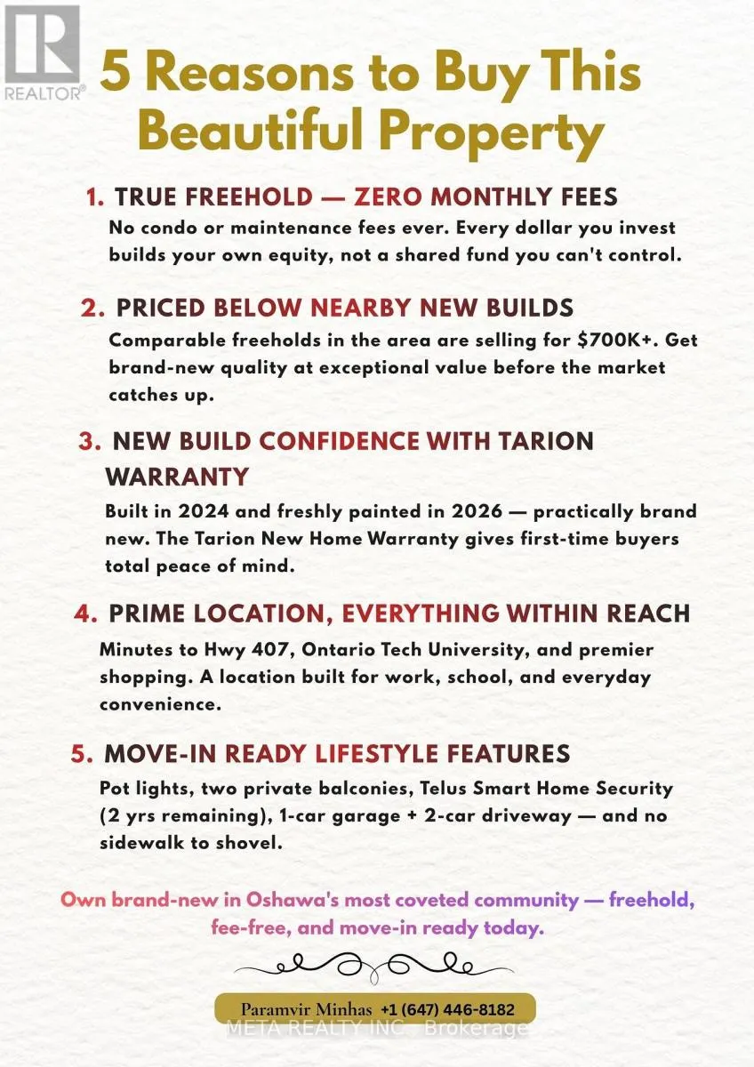 Welcome to one of North Oshawa’s most exciting & Very rare opportunity! This 2024-built, 4-bedroom, 3 full-bath FREEHOLD townhouse in the coveted Kedron community is the one you’ve been waiting for, and it won’t last! Zero monthly fees means Zero compromises. NO POTL, NO Maintenance Fees, Freshly painted in 2026, this home feels brand new, because it practically is.