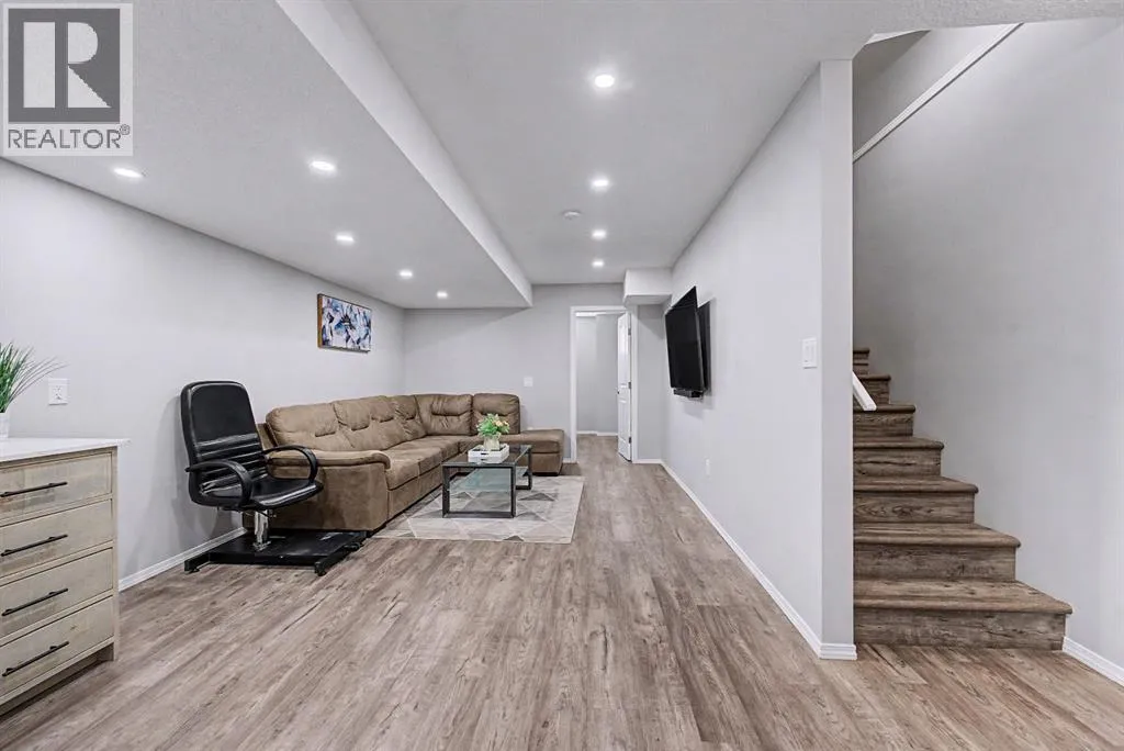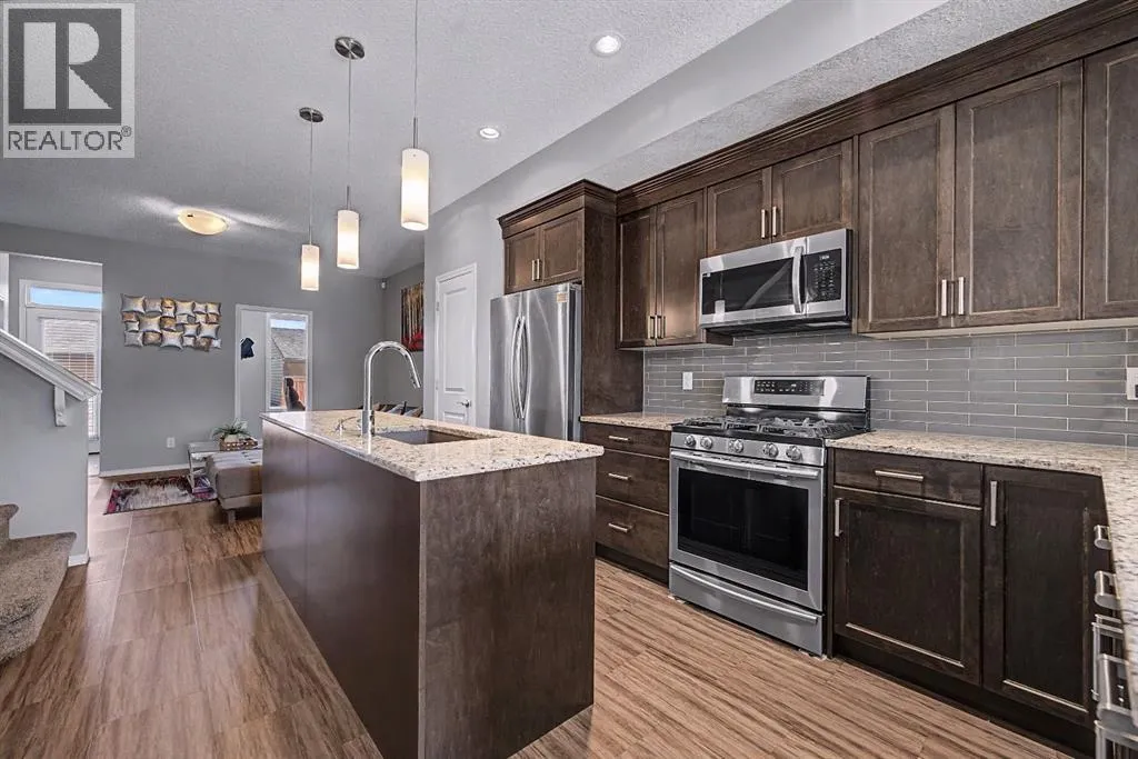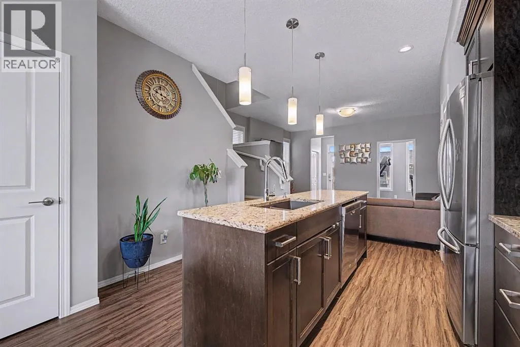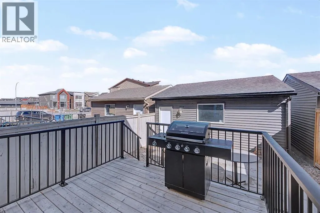 inside to an inviting open-concept main floor, greeted by a welcoming foyer and a bright dining area framed by three large windows that flood the space with natural sunlight. The main level is finished with luxury vinyl plank flooring, adding both durability and a modern touch throughout. The kitchen is both stylish and practical, featuring a large island, breakfast bar, granite countertops, stainless steel appliances, a gas stove/oven, and rich mocha-coloured cabinetry that beautifully complements the space. The main floor also offers a spacious living area with an electric fireplace, a home office, a 2-piece bathroom, and a mudroom for added convenience.Upstairs, you’ll find a thoughtfully designed layout with three bedrooms and a dedicated laundry room. The primary bedroom, located on the south end of the home, is a bright and spacious retreat complete with large windows, a walk-in closet, and a 5-piece ensuite featuring dual sinks. Down the hall, a versatile nook area provides the perfect space for a home office, study, or flex area to suit your needs. Two additional bedrooms are complemented by a 4-piece bathroom with shared access, making it functional for families.The fully developed basement (approximately 638 sq. ft.) offers incredible additional living space and income potential, featuring a separate entrance, a stylish wet bar with quartz countertops and white backsplash, a 4-piece bathroom, a bedroom, storage, and a recreation area ideal for family entertainment or movie nights.Step outside to your private fenced backyard, designed for low maintenance and enjoyment. The space includes a 10×10 deck, pe rfect for summer barbecues, morning coffee, or relaxing evenings, along with a double detached garage with convenient alleyway access.Located in the amenity-rich community of Cornerstone, residents enjoy close proximity to Highstreet (Chalo! FreshCo, Shoppers Drug Mart), parks, playgrounds, and a new Regional Park. You’re also just 5–10 minutes from major destinations including CrossIron Mills, Costco, SkyPointe Landing, Cardel Rec Centre, and YYC Airport, with quick access to Stoney Trail and Country Hills Blvd for easy commuting. Future community growth includes a planned Major Activity Centre (MAC), multiple school sites, and new transit stations, making this an excellent opportunity in a rapidly developing area.This is a fantastic opportunity to own a modern, move-in-ready home with income potential in one of Calgary’s fastest-growing communities. (id:62650)