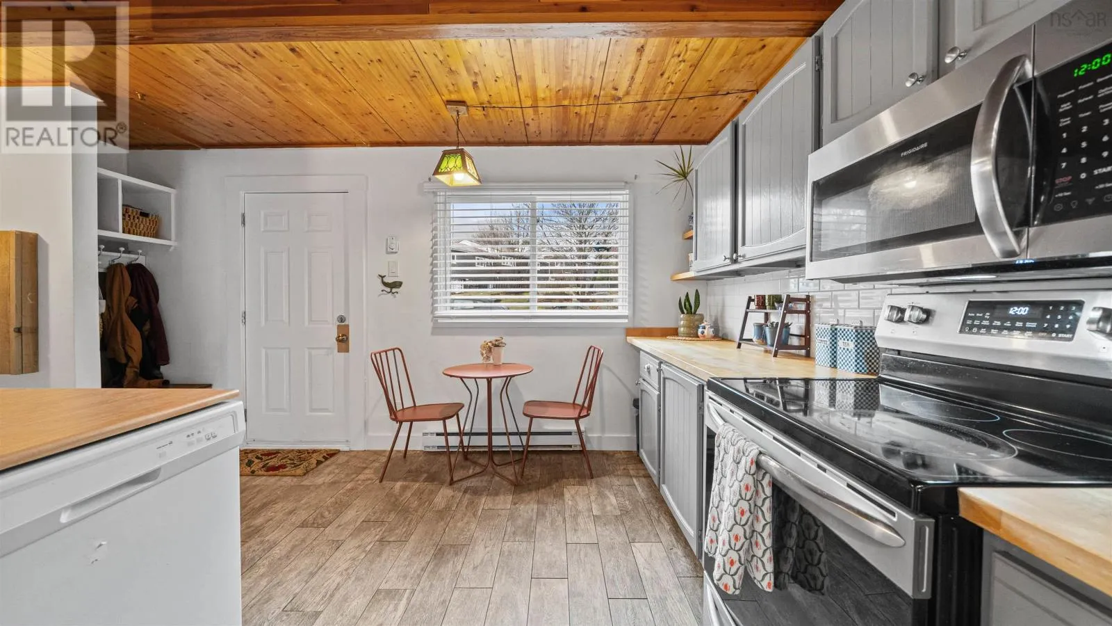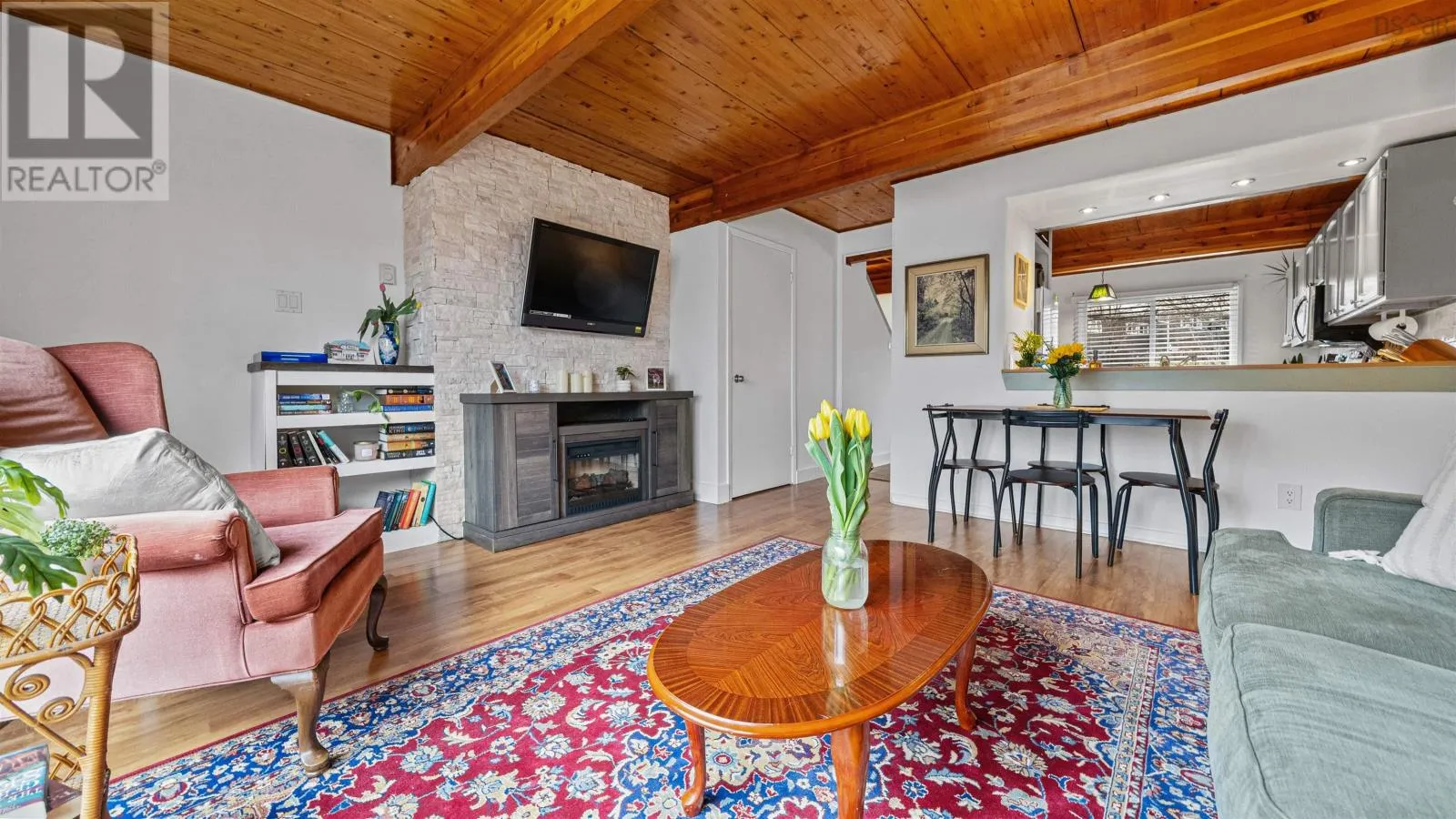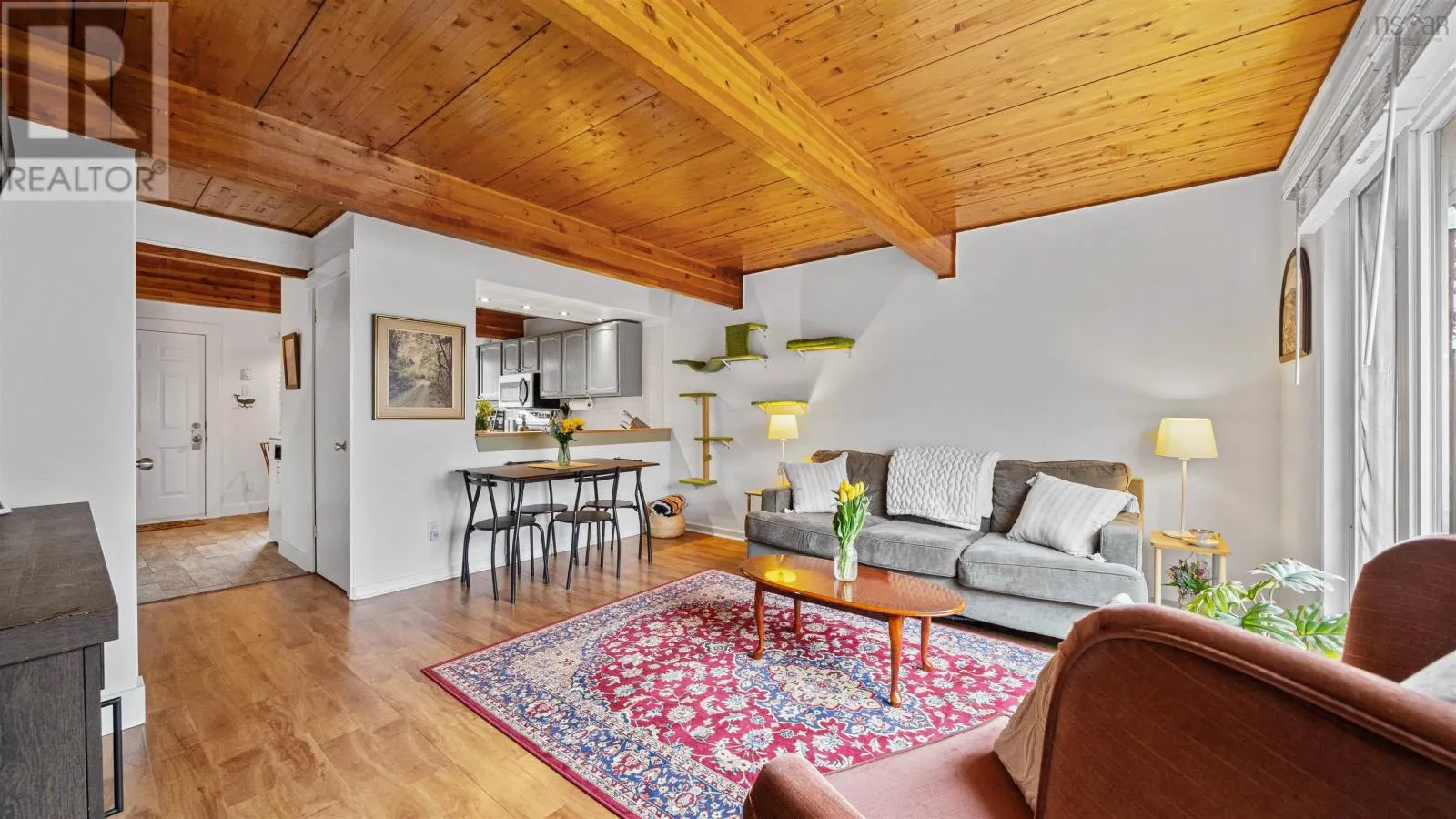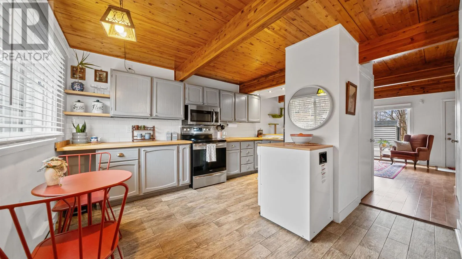 Welcome to 107 Cavendish Road, a move-in ready three-bedroom townhouse in Halifax that perfectly blends modern updates with classic character. The main level features a spacious kitchen with ample countertop space, tile floors, and stainless steel appliances, opening through a charming pass-through window into a bright living room highlighted by beautiful wood beams and ceilings. This inviting space leads directly