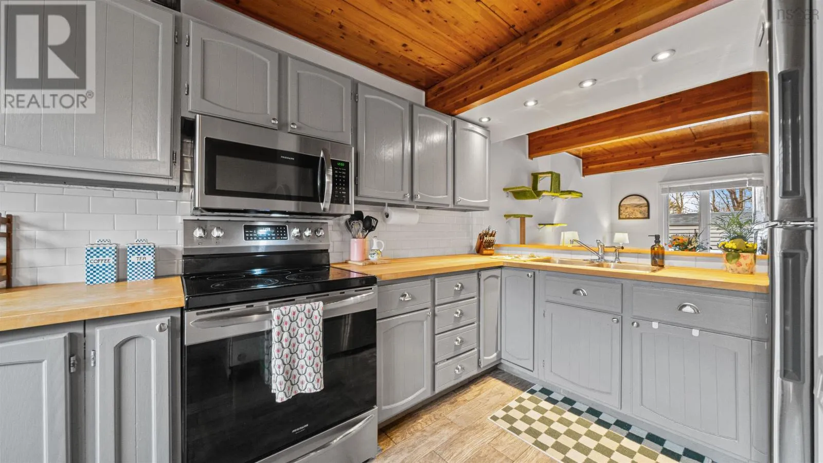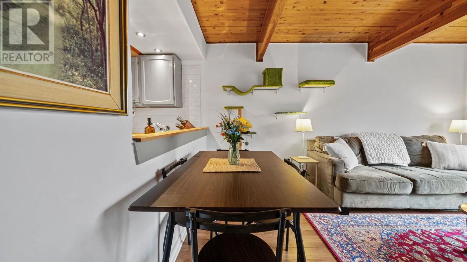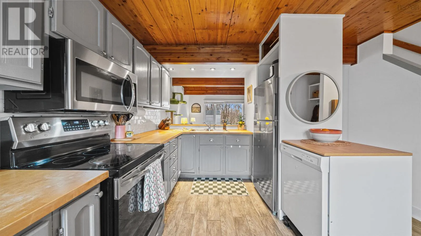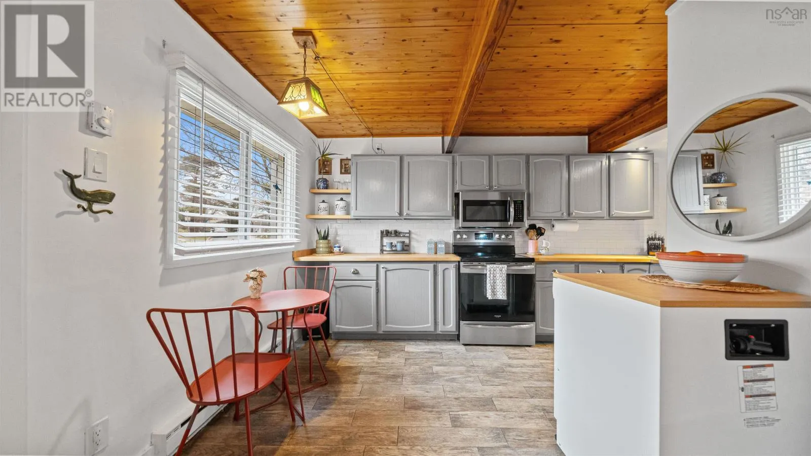 Welcome to 107 Cavendish Road, a move-in ready three-bedroom townhouse in Halifax that perfectly blends modern updates with classic character. The main level features a spacious kitchen with ample countertop space, tile floors, and stainless steel appliances, opening through a charming pass-through window into a bright living room highlighted by beautiful wood beams and ceilings. This inviting space leads directly
