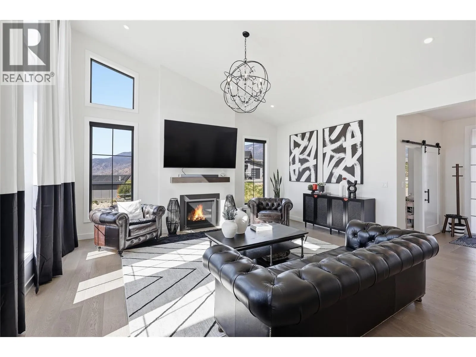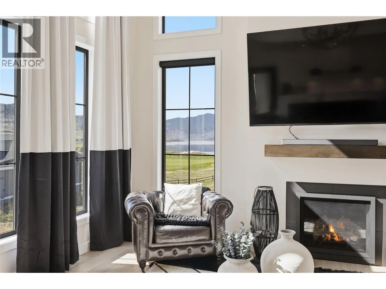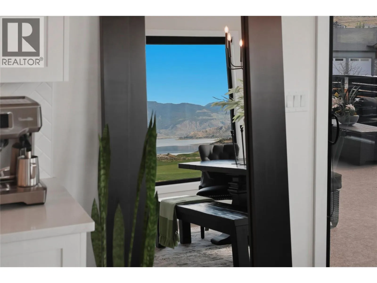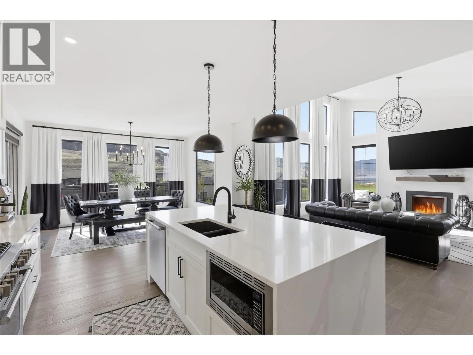 A home defined by scale, light, and a layout that feels considered the moment you walk in. The main living space is defined by height and volume, with oversized windows that draw in natural light and frame views of the lake and surrounding hills. Kitchen, dining, and living connect seamlessly and extend to a covered deck, creating a natural indoor
