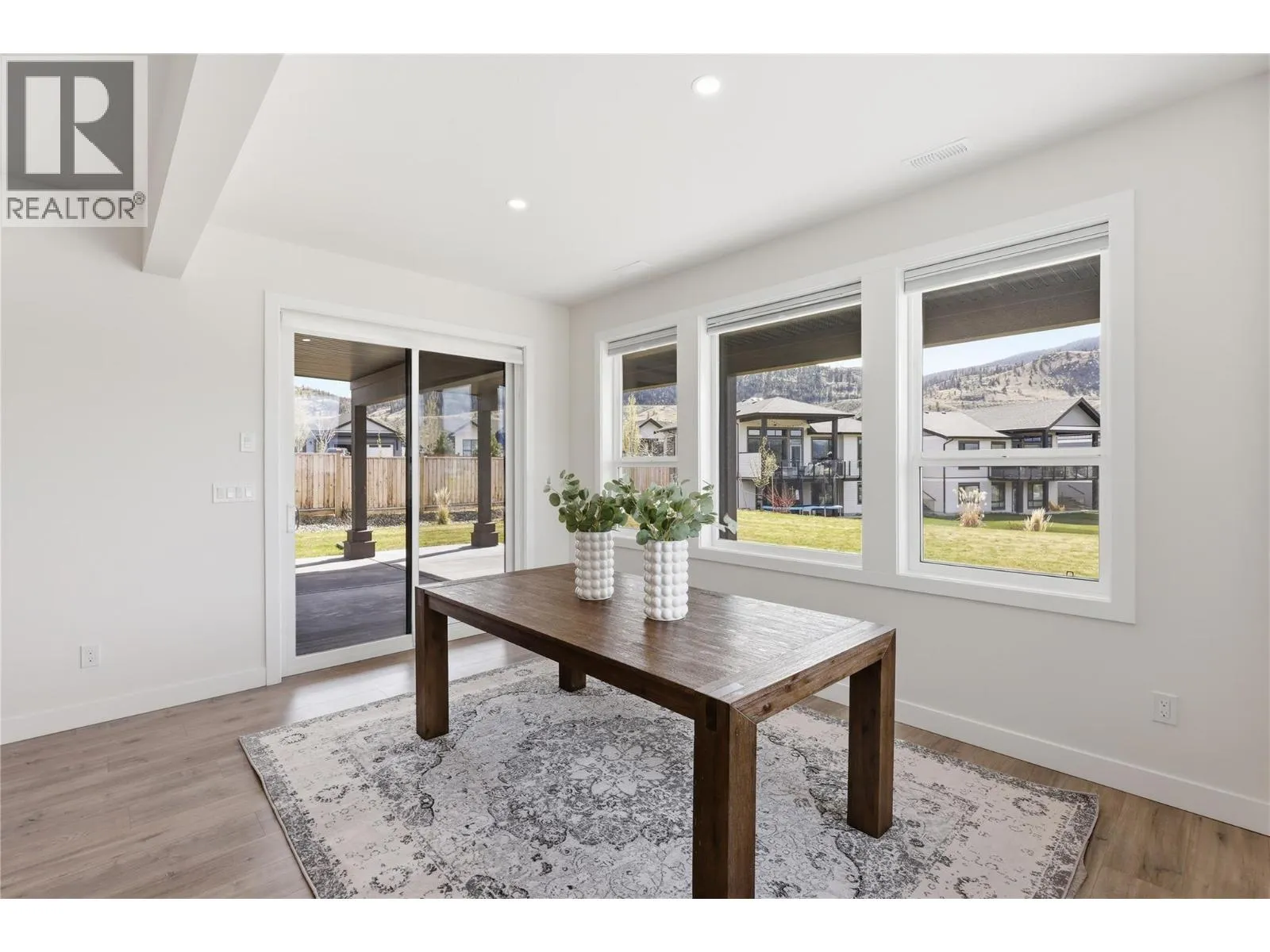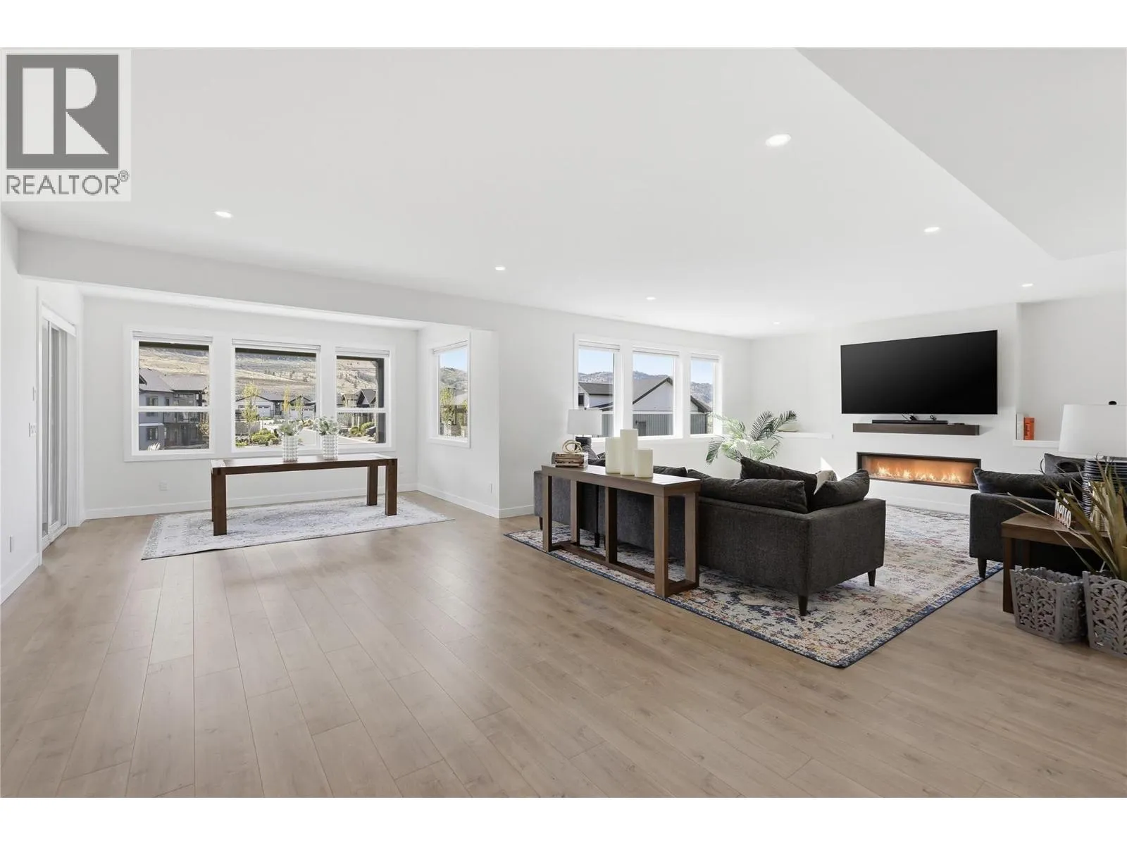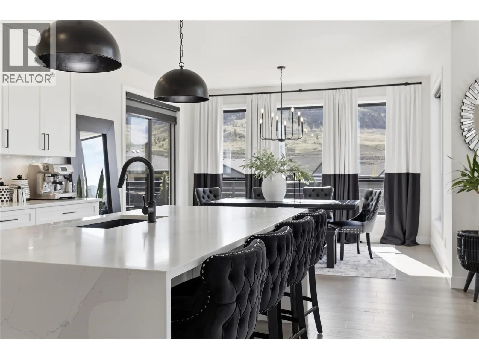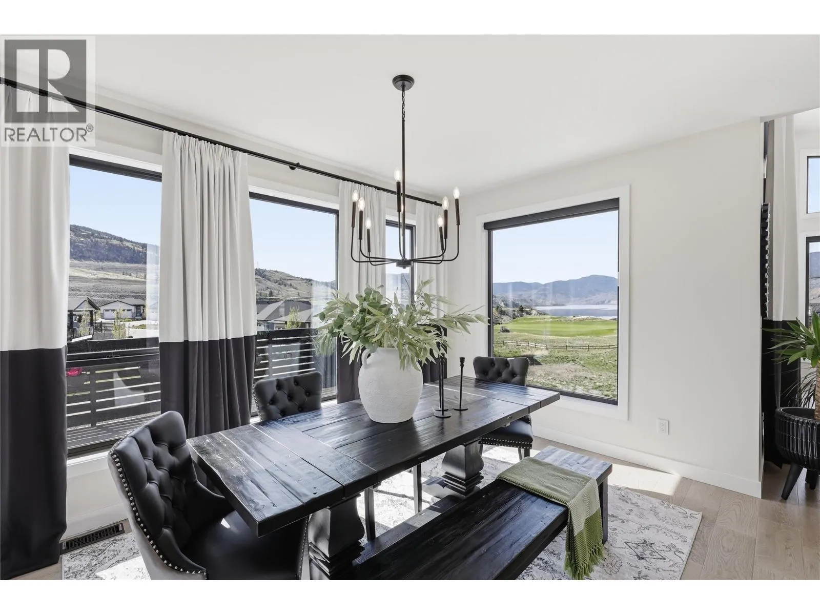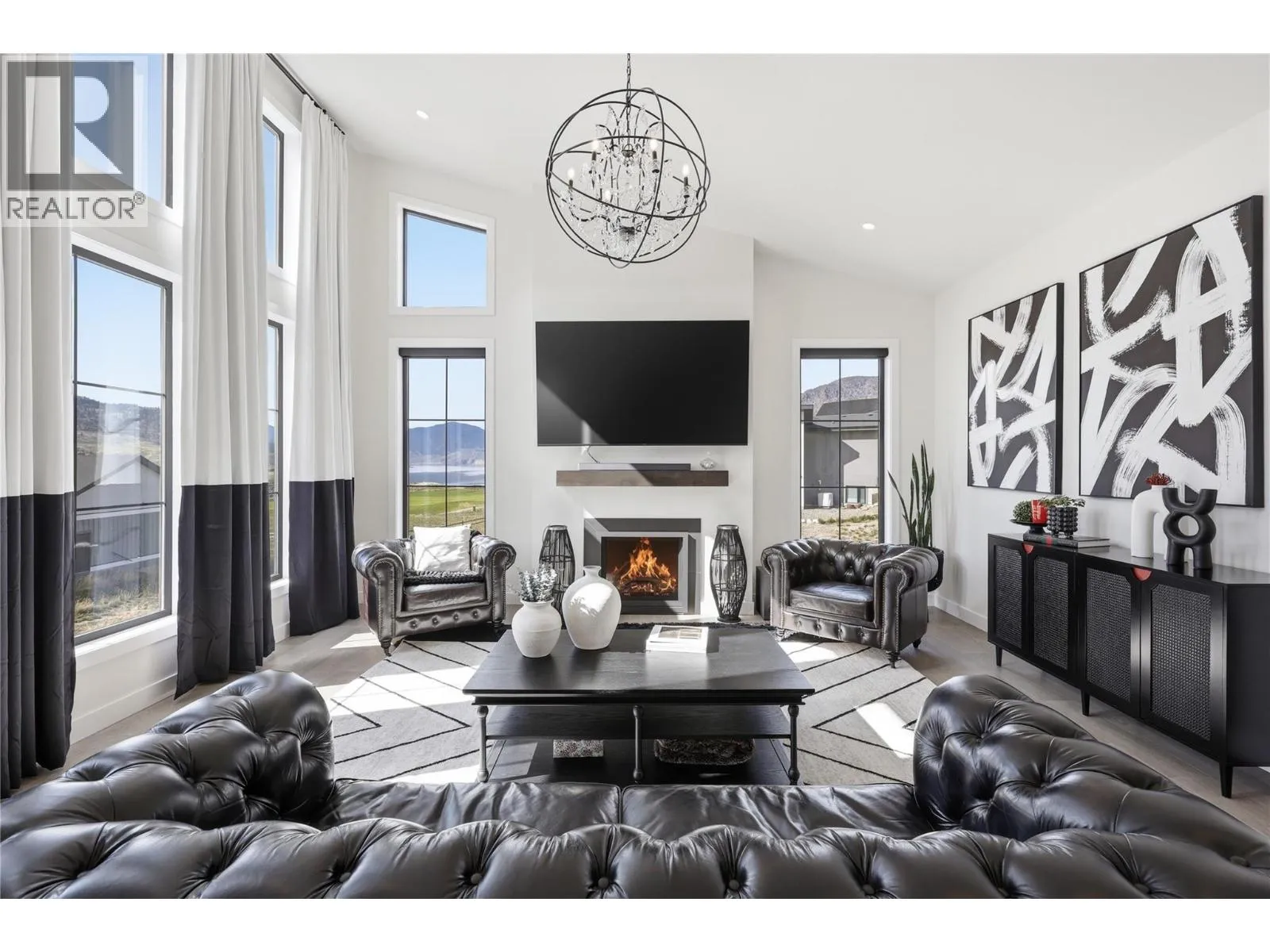 A home defined by scale, light, and a layout that feels considered the moment you walk in. The main living space is defined by height and volume, with oversized windows that draw in natural light and frame views of the lake and surrounding hills. Kitchen, dining, and living connect seamlessly and extend to a covered deck, creating a natural indoor
