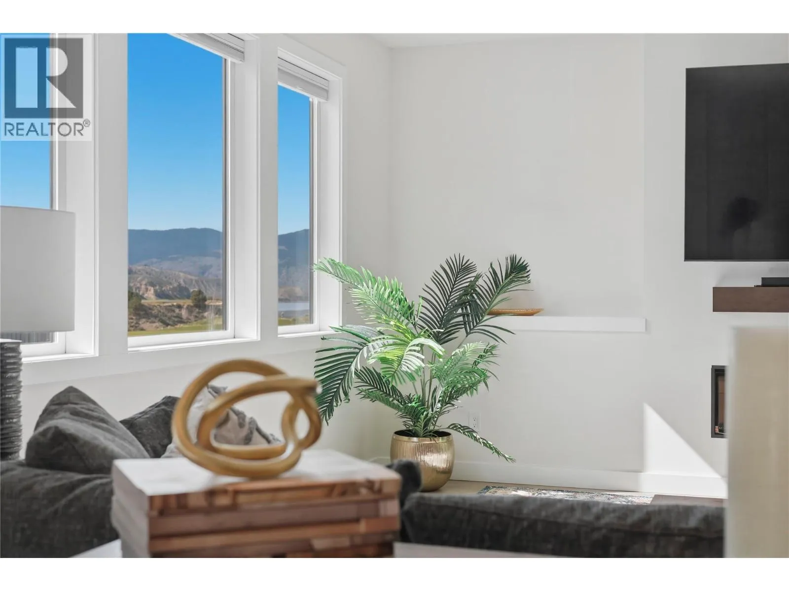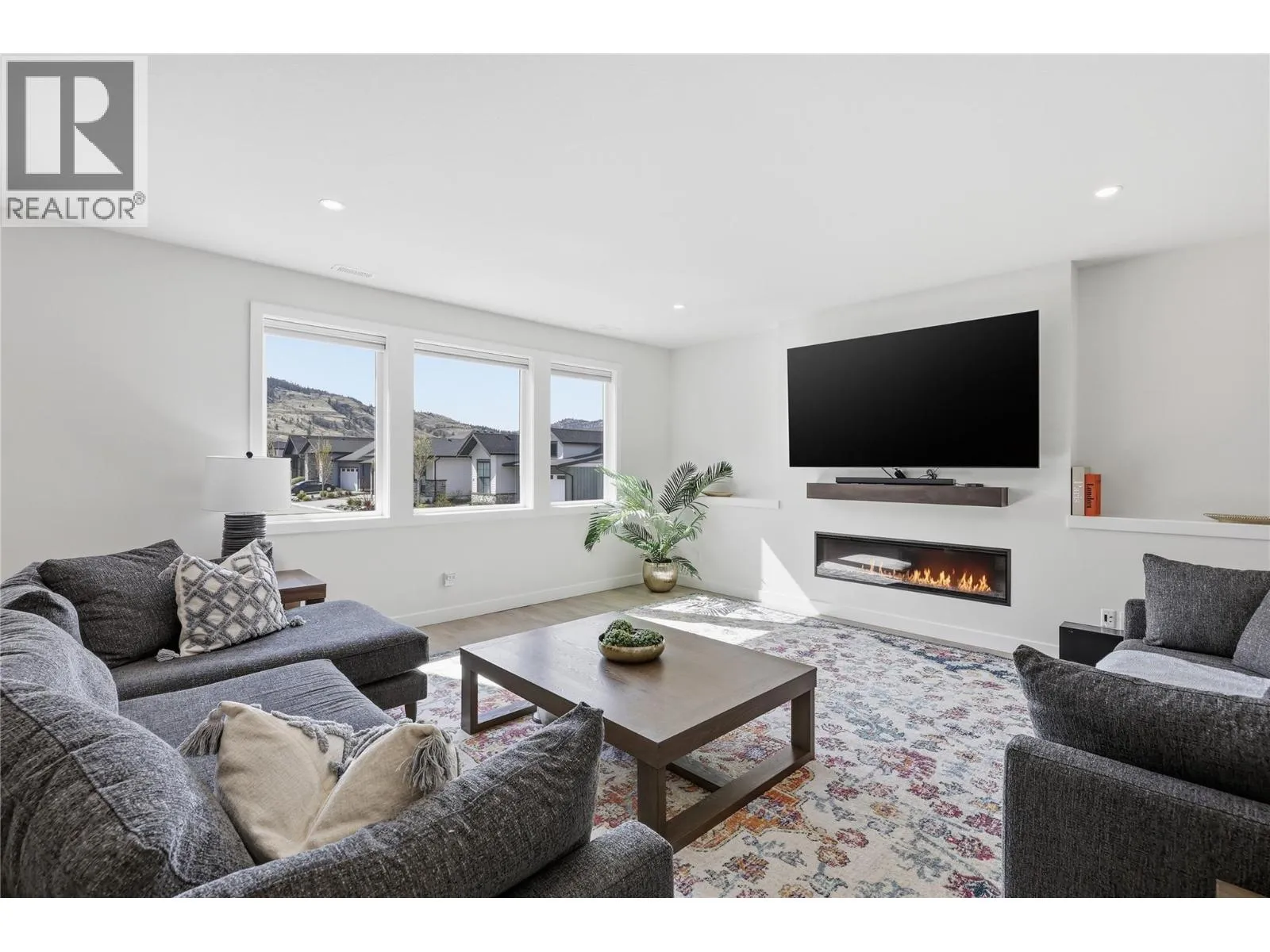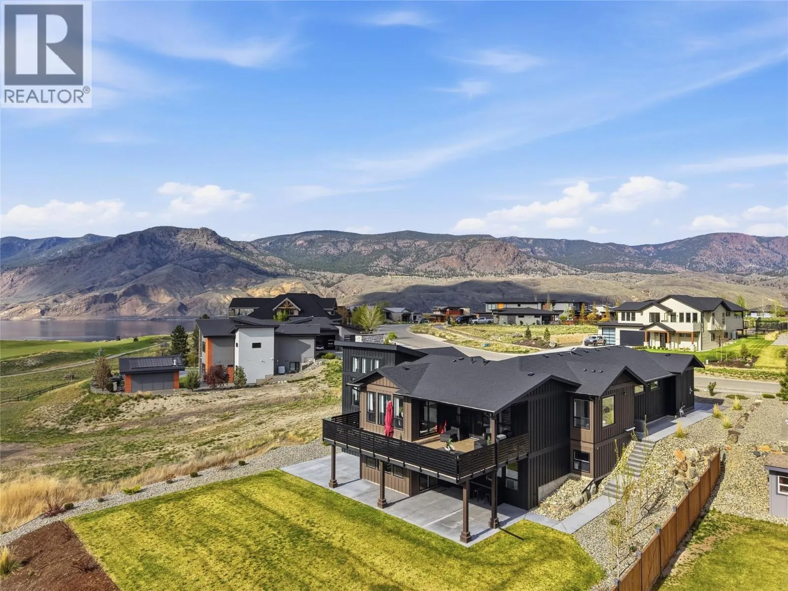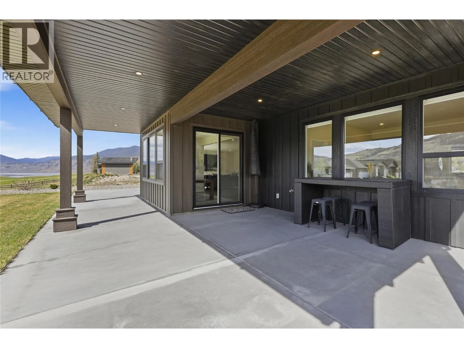 A home defined by scale, light, and a layout that feels considered the moment you walk in. The main living space is defined by height and volume, with oversized windows that draw in natural light and frame views of the lake and surrounding hills. Kitchen, dining, and living connect seamlessly and extend to a covered deck, creating a natural indoor