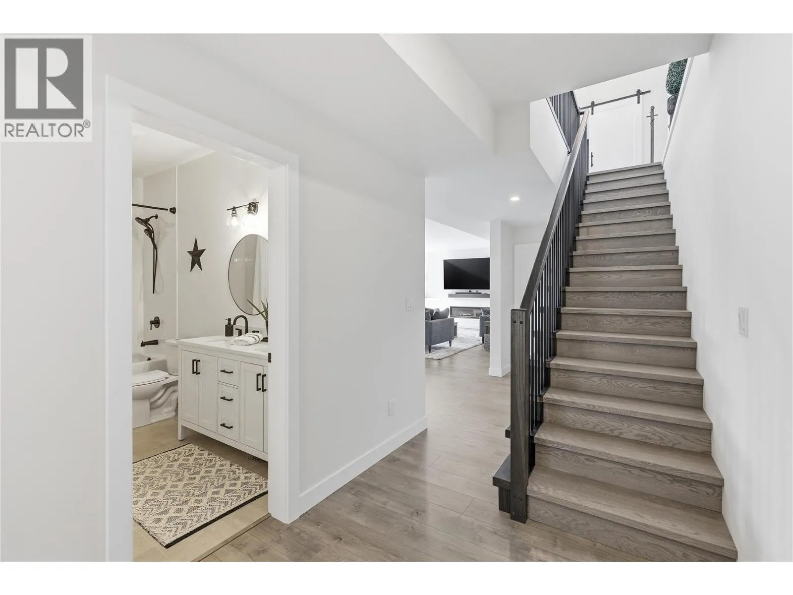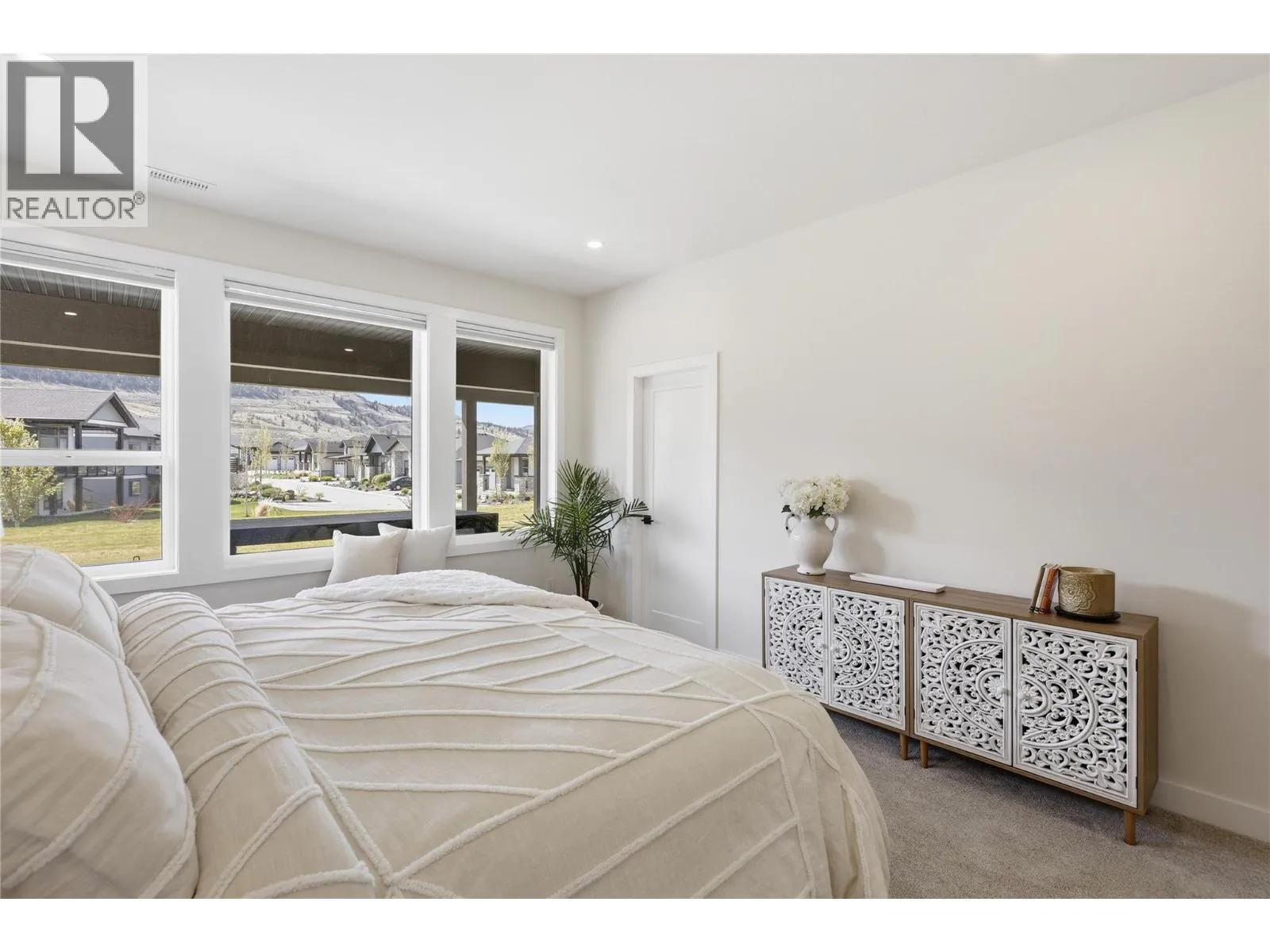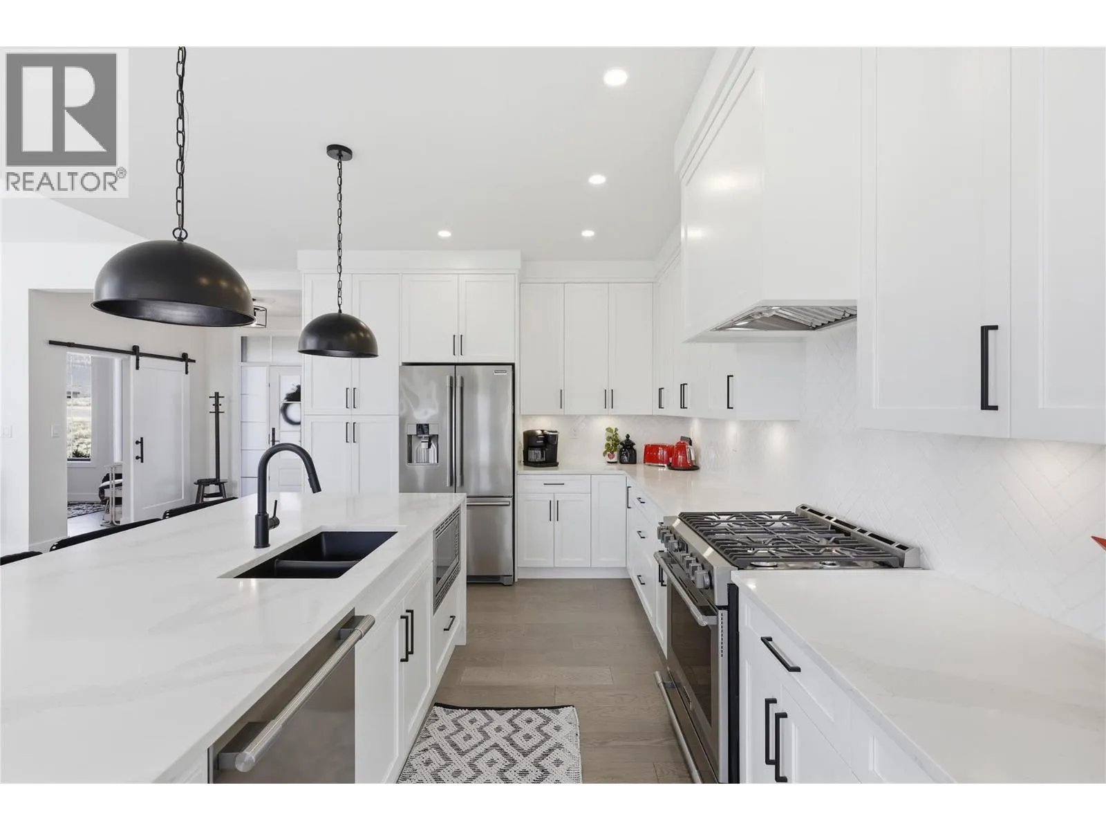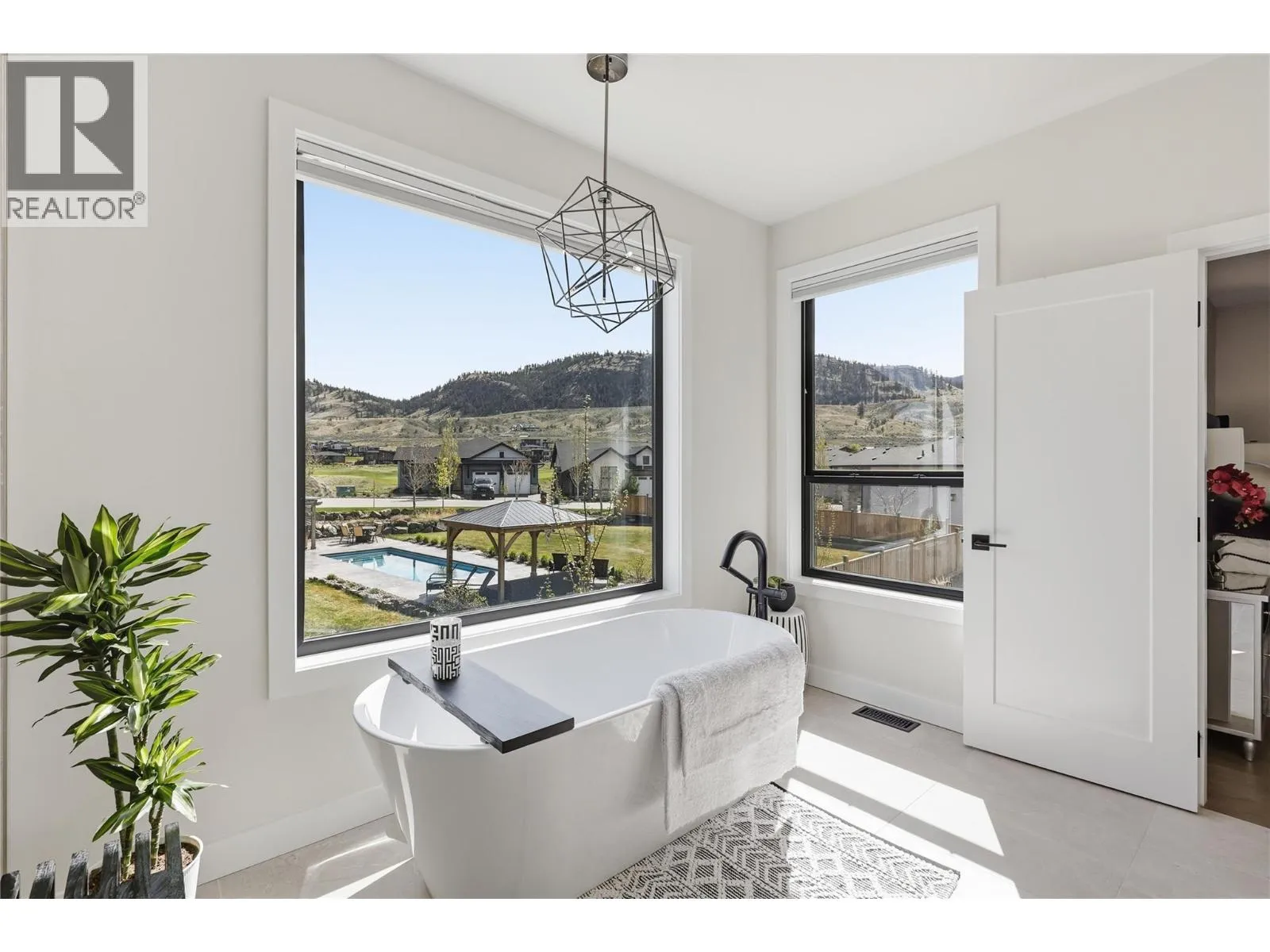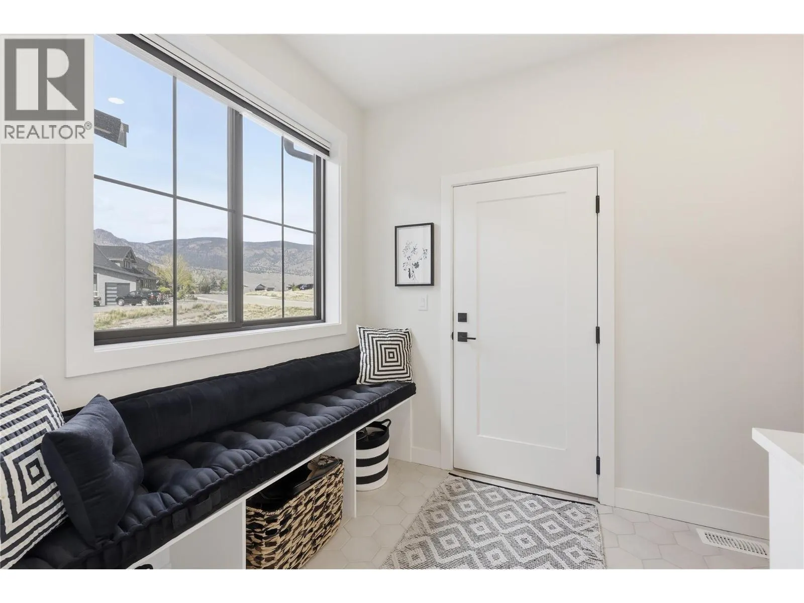 A home defined by scale, light, and a layout that feels considered the moment you walk in. The main living space is defined by height and volume, with oversized windows that draw in natural light and frame views of the lake and surrounding hills. Kitchen, dining, and living connect seamlessly and extend to a covered deck, creating a natural indoor
