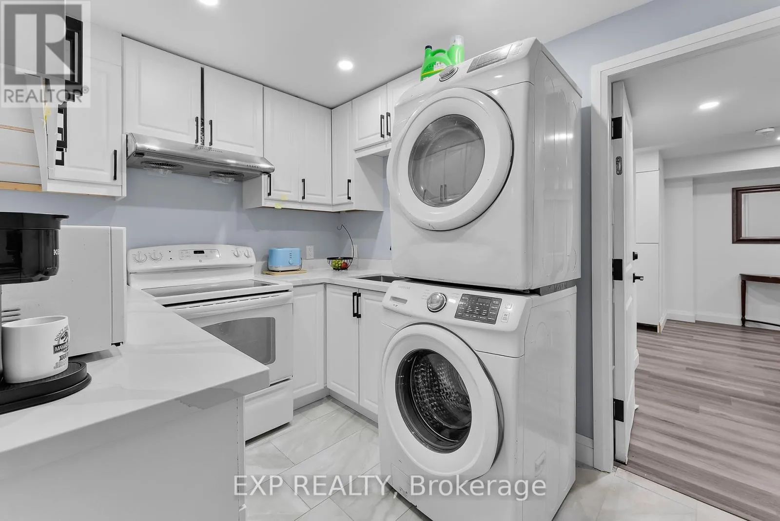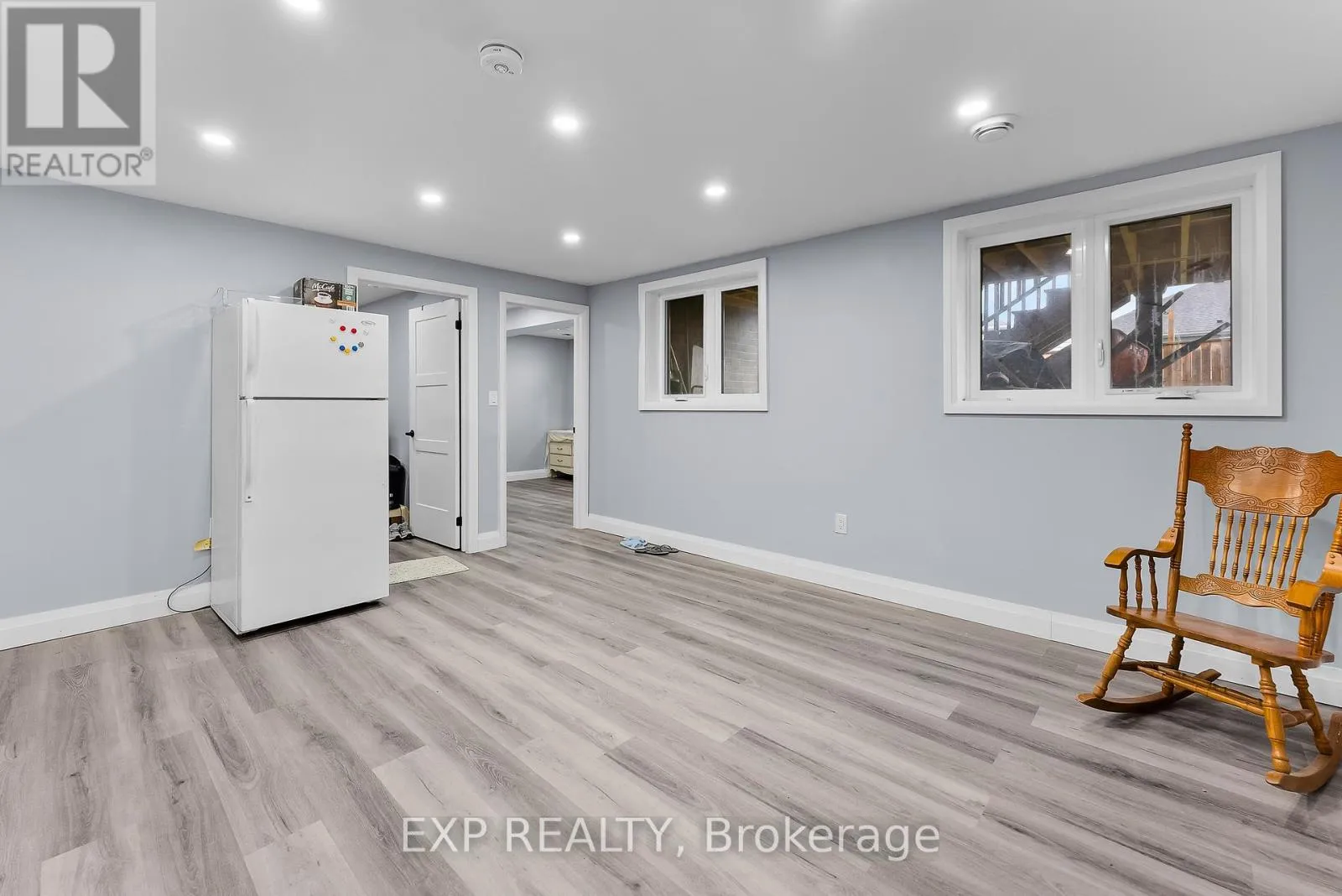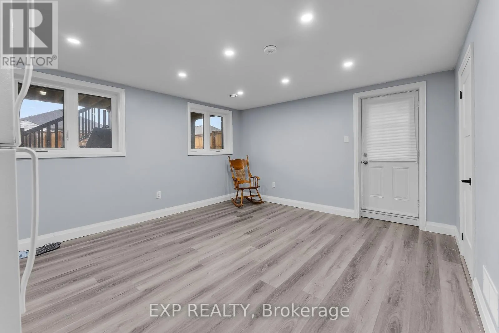 Modern and bright lower-level apartment featuring high ceilings, large windows, and quality finishes throughout. The open-concept layout offers a contemporary kitchen with ample cabinetry, clean countertops, and plenty of pot lighting, flowing into a spacious living area with durable flooring throughout. The unit includes a well-appointed 3-piece bathroom with glass shower and modern fixtures, along with a private separate entrance