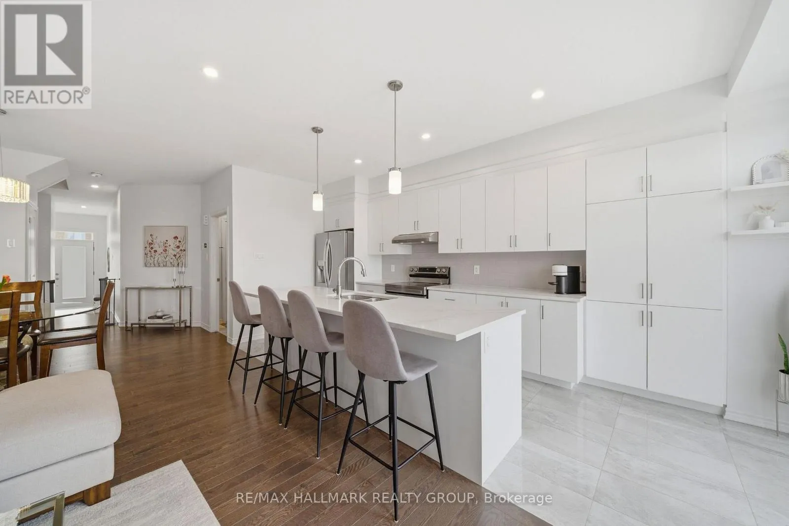 Upgraded 3 bedroom + finished basement end-unit townhome with no rear neighbours, oversized custom deck, and approximately 2,160 sq ft in one of Stittsville’s most sought-after newer family communities. Built in 2020, this move-in ready home offers modern construction, premium finishes, and a rare amount of privacy for townhouse living. The main level features rich hardwood flooring, designer wall moulding