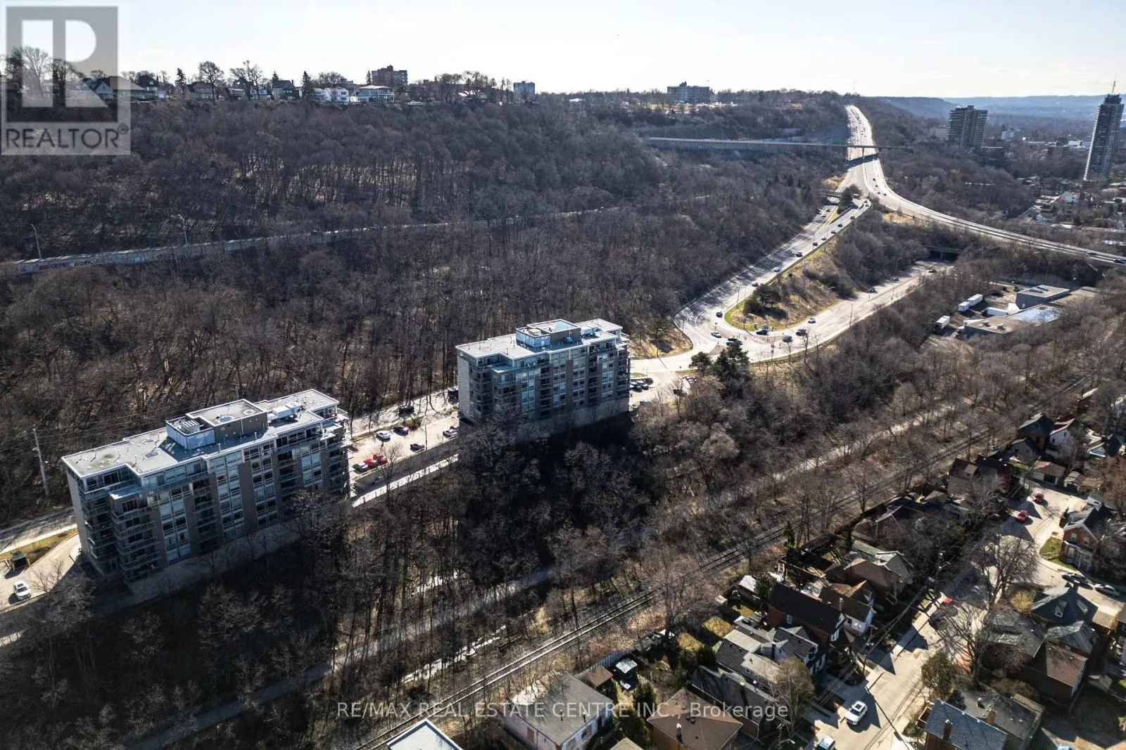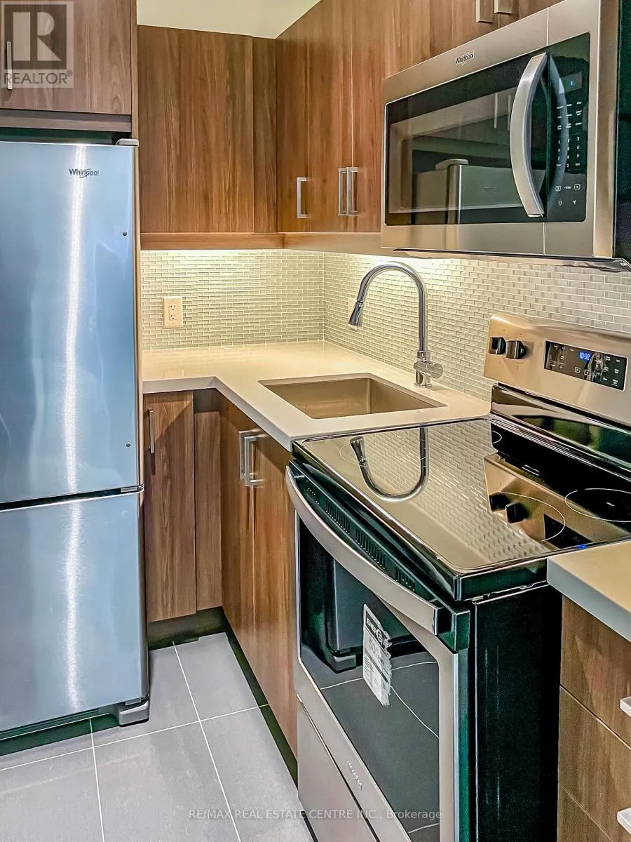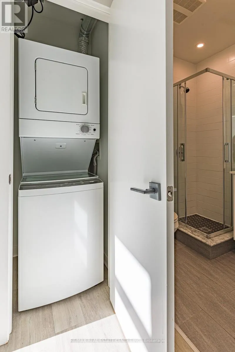 with Escarpment & City Views – Oversized Windows and Sliding Doors provide plenty of Natural Light & Lake views. Freshly painted! Large Quartz Counter in sizeable U-shaped Kitchen with Breakfast Bar & Glass Backsplash. Ample Cupboard space. Stainless appliances include Fridge, Stove, Microwave/Range Hood & Dishwasher. Many Upgrades: Floors, Cabinets, Backsplash, Countertop, Bathroom Tiles & Lighting. Both Bedrooms with Large Closets – Primary features gleaming all white 4pc Ensuite. Second Bed or Home Office. Main 3pc Bath with Glass Shower – so each Bedroom has their own Bath. Convenient In-Suite Laundry includes Stacking Washer/Dryer. Spacious Balcony with Northeast Exposure offers room for Outdoor Dining & Relaxation. Includes owned Storage Locker and Underground Parking Space. Nearby trendy Corktown & Augusta, green space, trails, bike share, transit, shopping, restaurants, coffee shops, schools & parks! Fees include Heat, AC & Water plus Exterior Maintenance & Building Amenities featuring: Motion activated LED Lighting, Acoustic Underlay for Sound Insulation. Beautiful Lobby with Water Feature. Common Outdoor Terraces with BBQs. Well equipped Gym. Party Room with Kitchen & Fireplace. Bike Storage. Security. Visitor Parking. Dog friendly – one dog, one cat, a cat and a dog, or two cats per unit. *Quick closing available* Do not miss this opportunity! Some photos virtually staged. (id:62650)