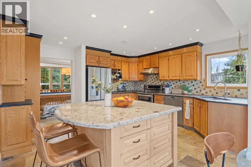 to the Edgemont pathway system and stunning ravine views, this is a rare opportunity to own in one of NW Calgary’s most sought-after locations. A standout feature is the legalized one-bedroom walkout basement suite, offering excellent income potential or a comfortable space for extended family. With its own separate entrance and full living functionality, it adds meaningful flexibility and long-term value. Thoughtfully maintained and extensively updated, all Poly-B plumbing has been removed and the vast majority of windows have been updated. Major mechanical upgrades were completed in 2024, including furnaces, hot water tank, and fresh paint throughout, along with a new radon mitigation system in 2025. The upper level also features a new washer, dishwasher, and fridge (2025), and durable concrete roofing tiles add to the home’s long-term reliability. Inside, soaring vaulted ceilings and large windows flood the home with natural light while showcasing the ravine setting. The main living areas are warm and inviting, with a cozy gas-assist wood fireplace in the family room and a bright breakfast nook that opens onto the rear deck overlooking the ravine. The kitchen is both functional and stylish, featuring a central island and soapstone perimeter countertops for a clean, modern feel. The layout is exceptionally well suited for families of all sizes. Upstairs offers a spacious primary retreat with a full ensuite, along with two additional large bedrooms and another full bathroom. A loft-style bonus room with built-in shelving provides the perfect space for a library, lounge, or play area. The main floor includes a private bedroom with its own full ensuite and walk-in closet—ideal for guests, extended family, or aging relatives seeking main-level living. In addition to the suite, a separate basement flex space with direct access to the lower patio adds even more versatility—perfect for a home gym, media room, or additional living area. The backyard is equally impressive, featuring beautiful crab apple and cherry trees. Additional highlights include an oversized double attached garage and newer window coverings throughout. The home’s timeless design feels both classic and current. Edgemont offers an unmatched lifestyle with scenic pathways, ravines, and proximity to Nose Hill Park. The home is also within walking distance to top-rated schools, including Edgemont School and Tom Baines, as well as everyday amenities like grocery stores, restaurants, and services. A rare combination of location, layout, income potential, and long-term value—this is a home you won’t outgrow! (id:64429)