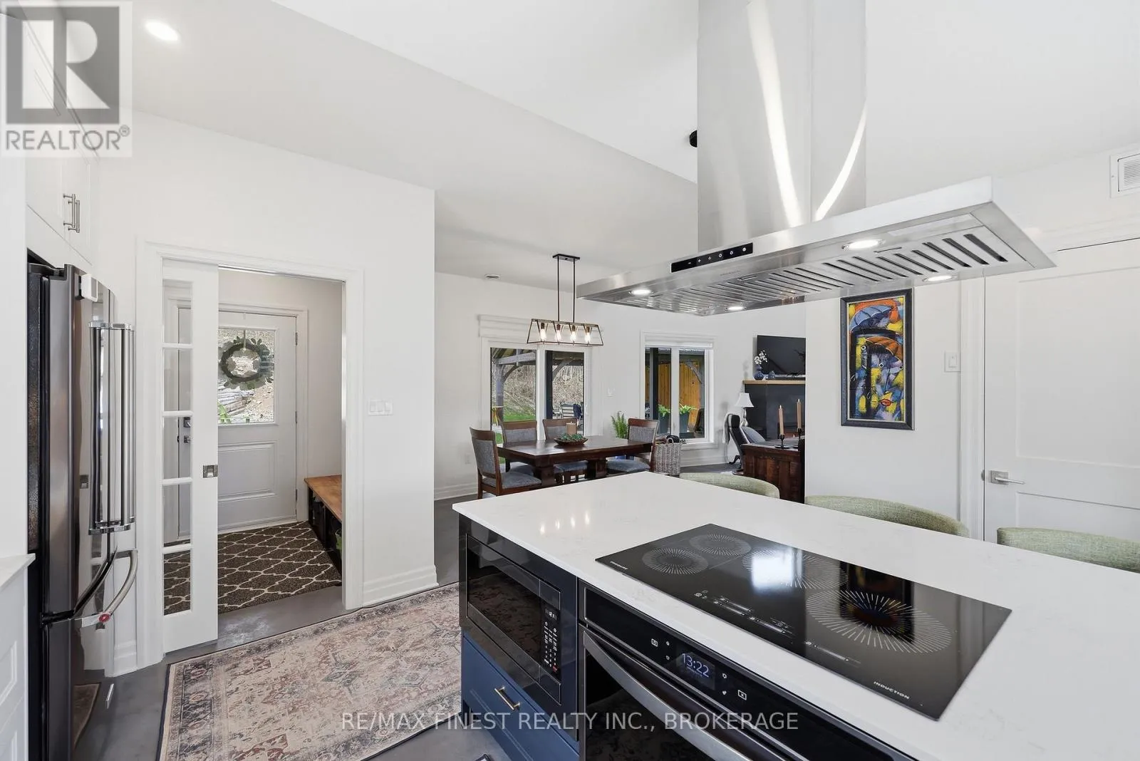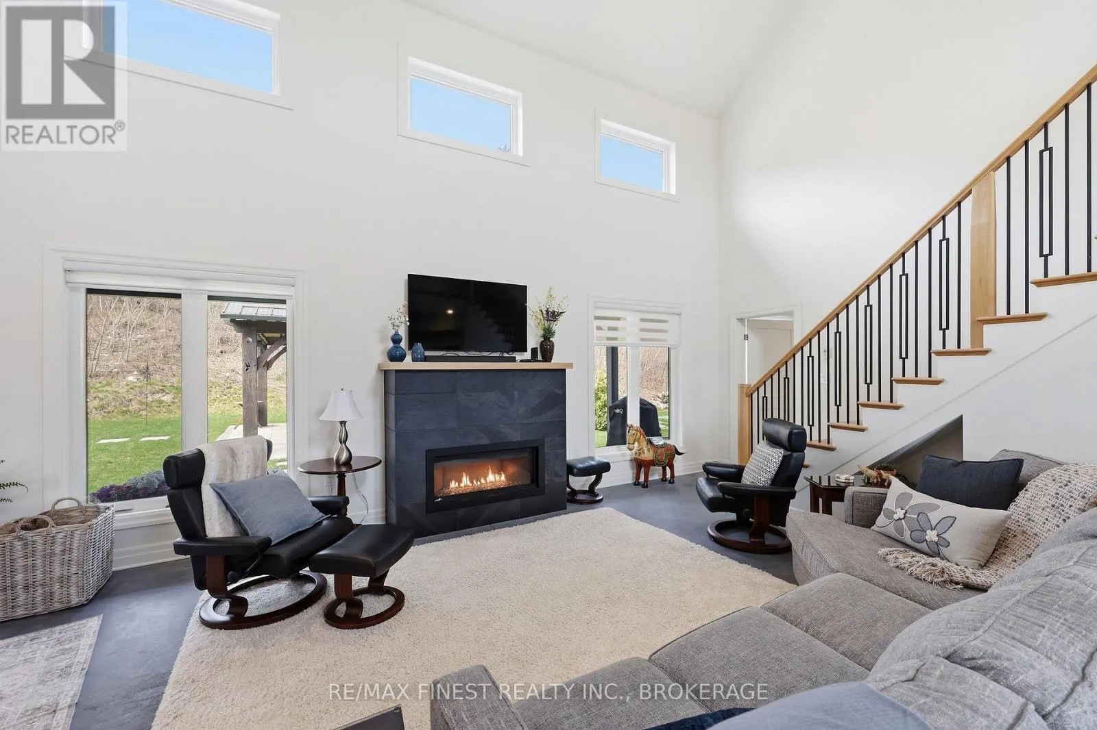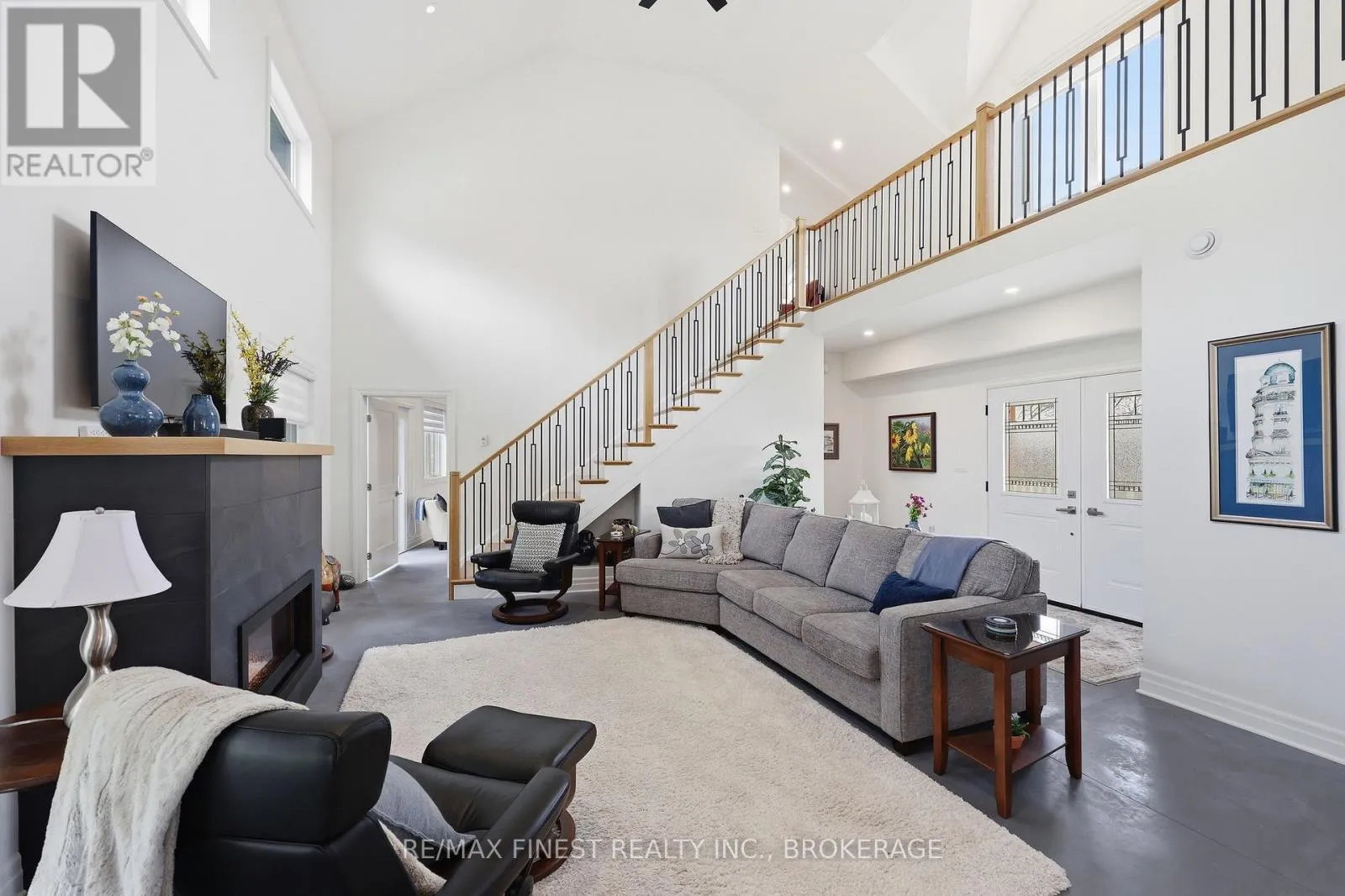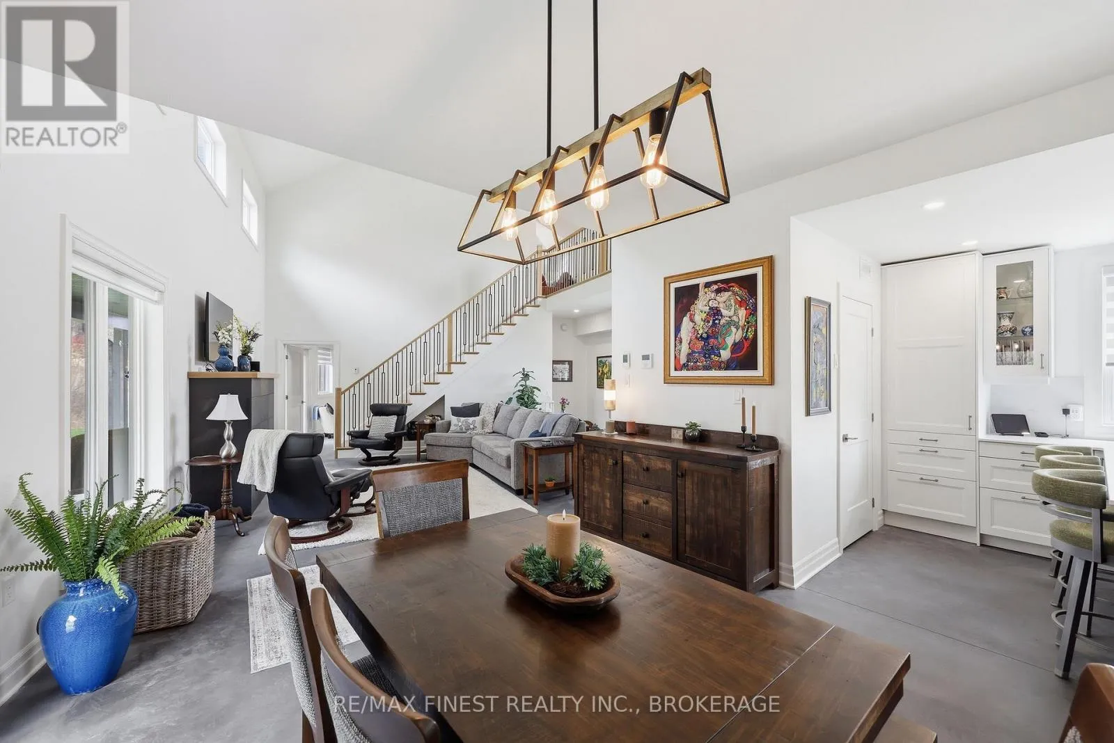 This one is special – located in the sought after waterfront community of Collins Lake, this 4 year old custom build (Bima Construction), slab on grade, two storey home is one of a kind! The main foyer will welcome you with high ceilings, incredible natural light, heated stone floor throughout and a powder room tucked under the stairs.