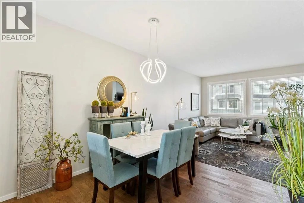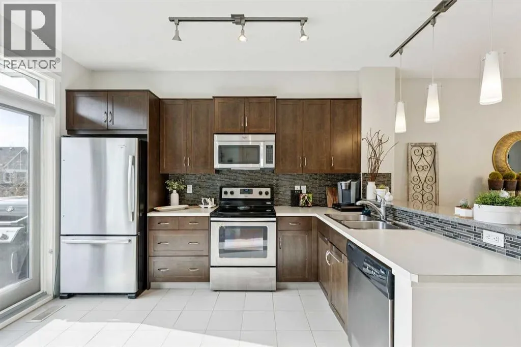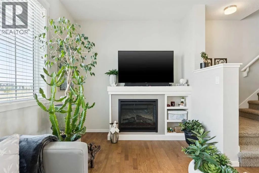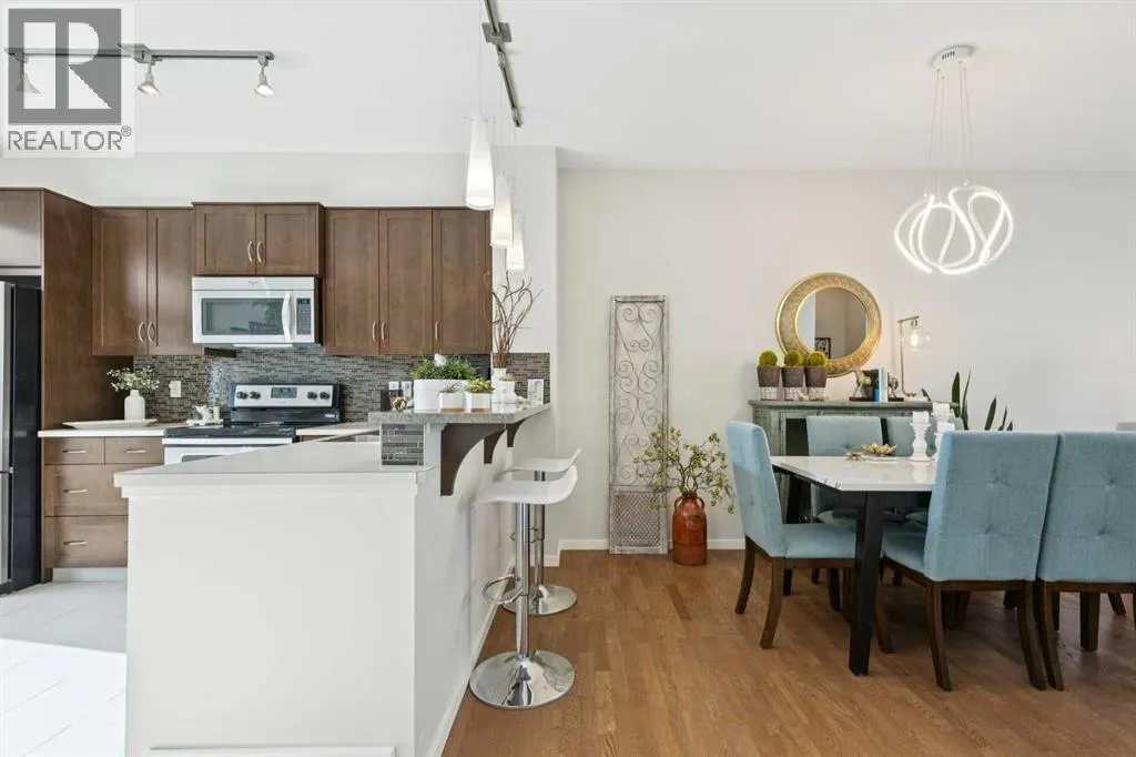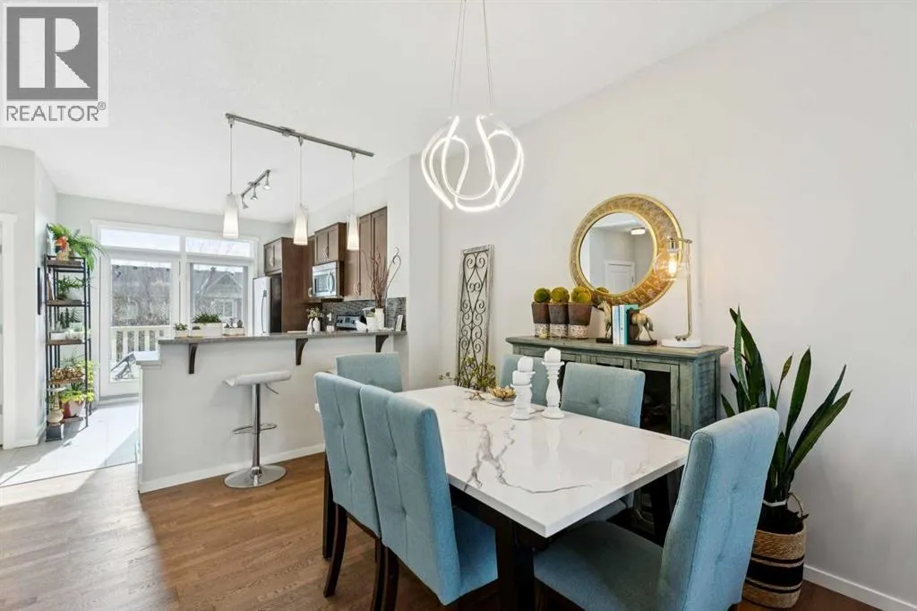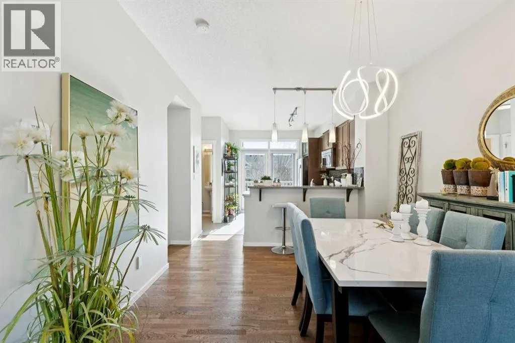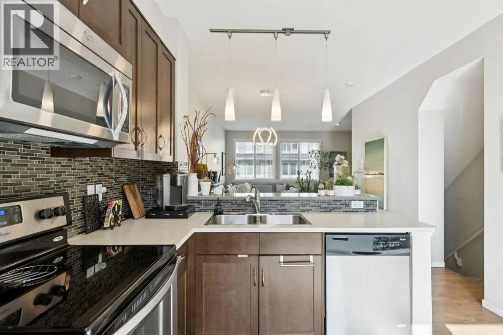 Natural light pours through this beautifully maintained townhome, where the main living level is bright, open, and exceptionally well appointed. The living room is anchored by a gas fireplace with built-ins, creating a warm and polished focal point. From there, the layout flows naturally into the dining area and kitchen, where richly stained cabinetry, stainless steel appliances, and a breakfast