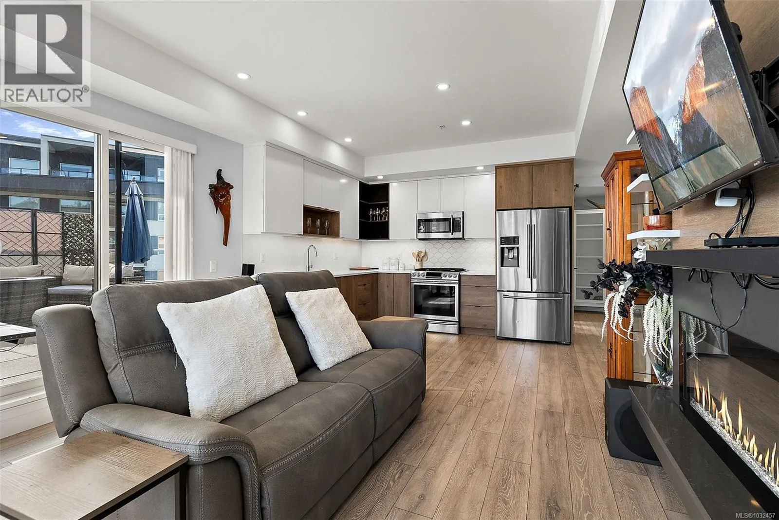Perched on the top floor of the prestigious Residence One, this luminous corner suite delivers refined contemporary living. Soaring 9′ ceilings, a gracious entry hall, and an open-concept layout create an immediate sense of sophistication, while the sleek kitchen impresses with a gas range, custom millwork, and quartz countertops. A linear electric fireplace with bespoke built-in shelving anchors the living