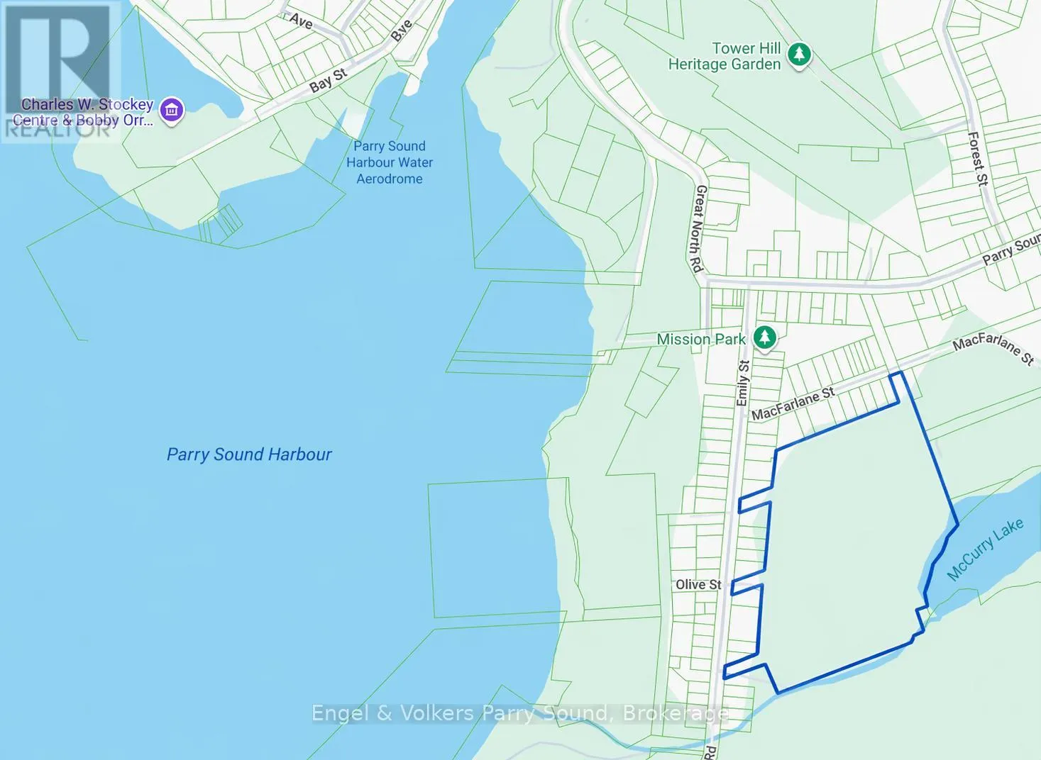 Development Opportunity | Parry Sound, Ontario. A rare and exceptional offering in the heart of Parry Sound, this expansive ~23-acre parcel presents a premier development opportunity with desirable R2(h) zoning and waterfront on McCurry Lake. Previously held by the Town of Parry Sound and now available to the public for the first time, this property represents one of the most