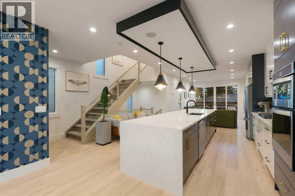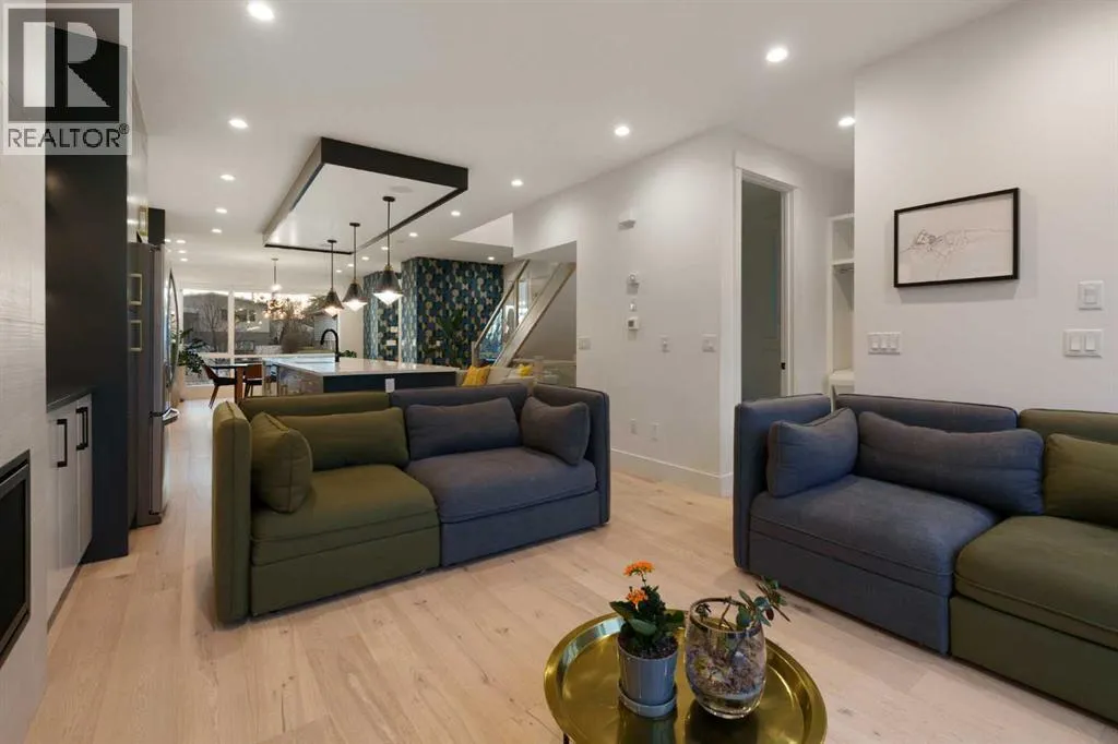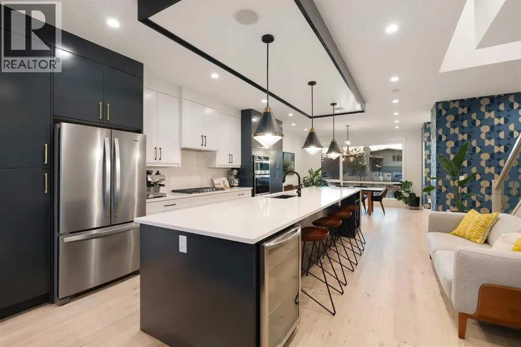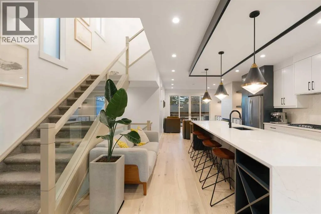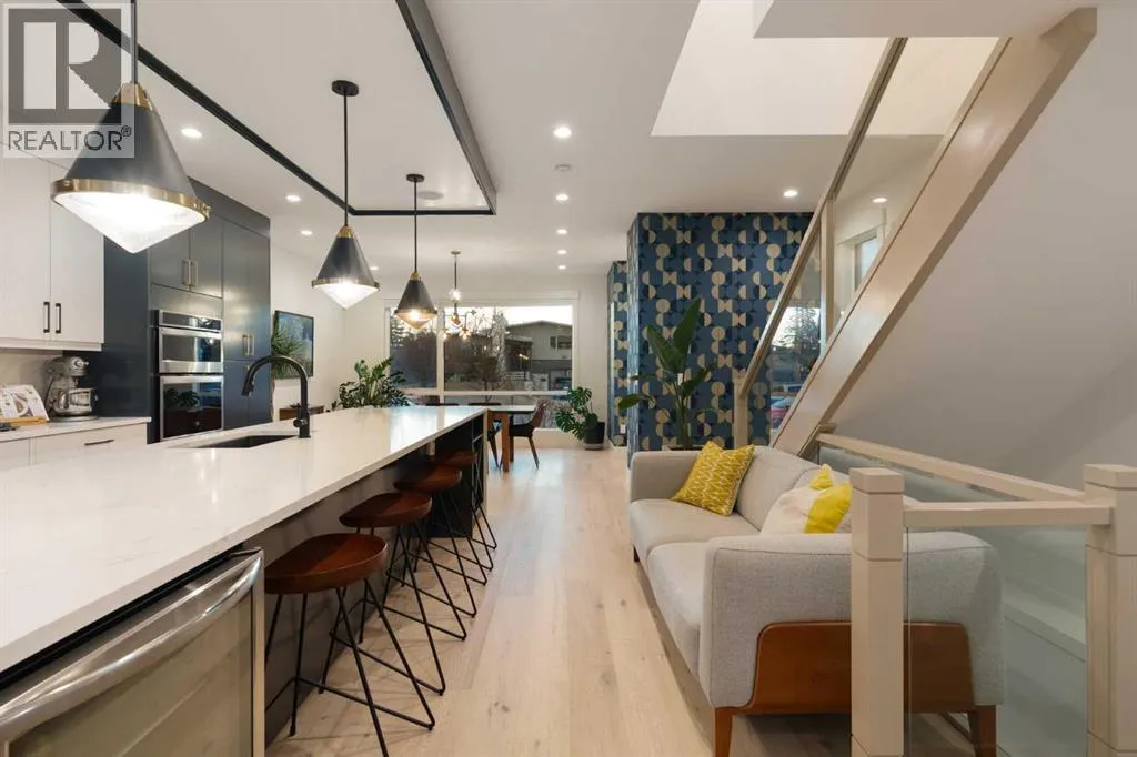 Step into a refined blend of contemporary design and timeless warmth. This beautifully crafted inner city home features wide-plank oak hardwood, painted ceilings, custom millwork, designer wallpaper, central A/C, a skylight that fills the space with natural light, plus a water softener and heat recovery ventilation system for enhanced comfort.The open-concept main floor is anchored by a chef-inspired kitchen