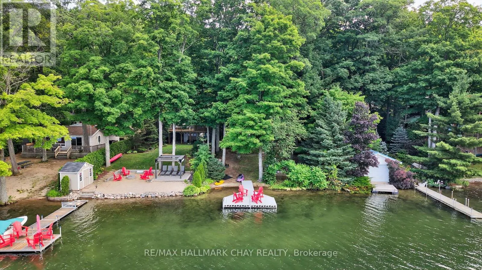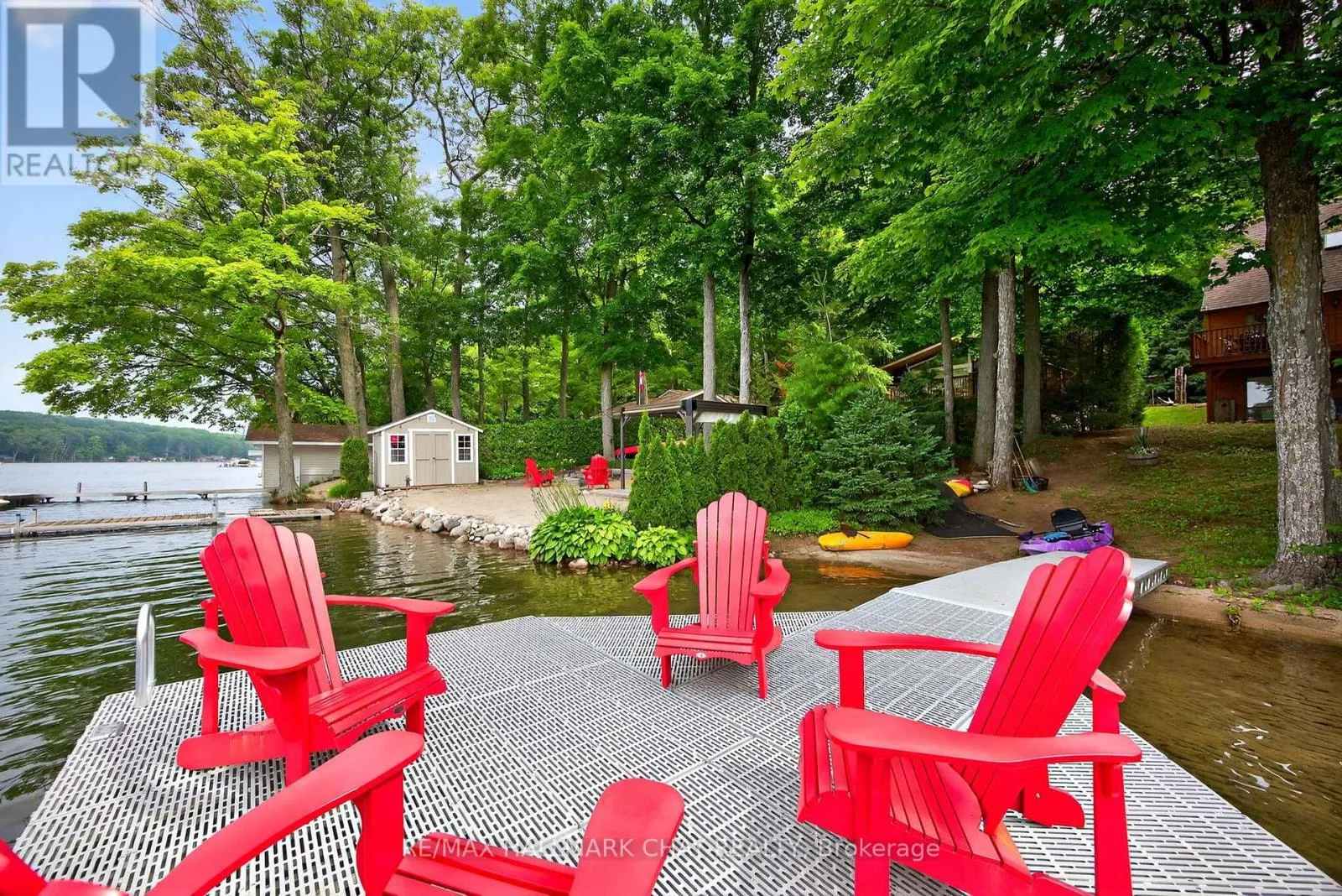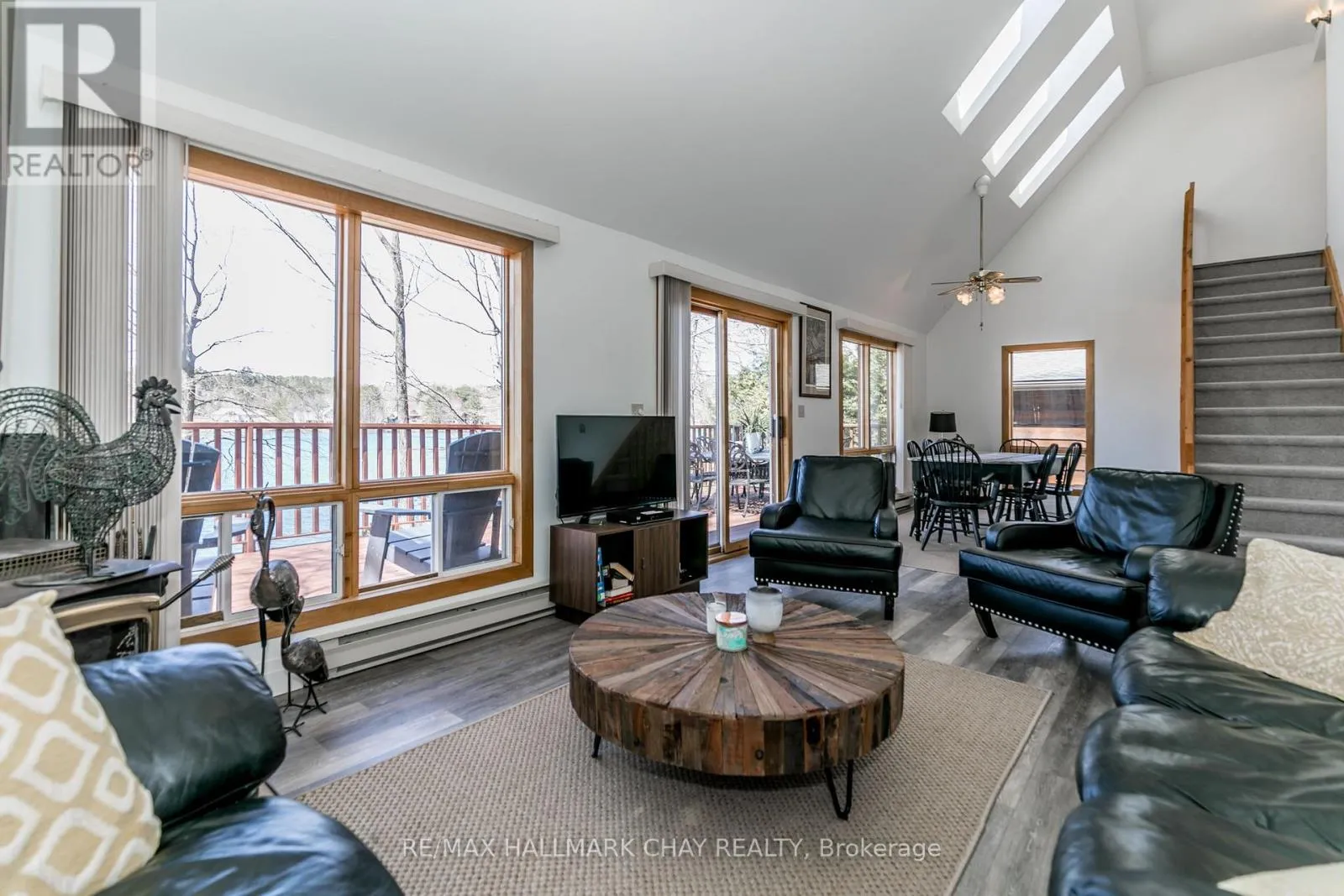 Nestled along 50 feet of pristine shoreline with coveted western exposure, this enchanting 3-bedroom, 3-bathroom chalet-style cottage offers the perfect blend of charm, comfort, and functionality. Set on the tranquil waters of Farlain Lake, the property showcases breathtaking sunsets and serene lake views year-round. The main level features a bright, open-concept living and dining area with soaring cathedral ceilings and