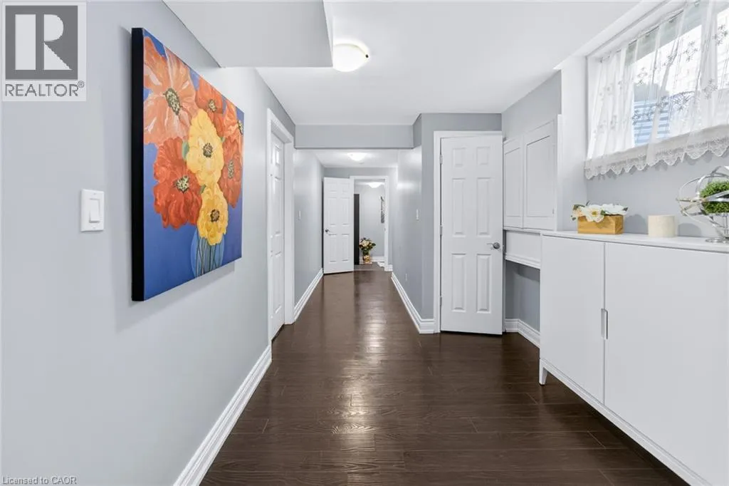 is move in ready. An open concept main floor features a combined dining room/kitchen open to the living room that spans the width of this home. A sliding door leads out to a deck surrounded by greenery for your privacy. A pergola at the back of the yard provides a sun shaded space for children or your own enjoyment. The second floor has 3 generous size bedrooms and two 4-pc bathrooms. The large primary bedroom has a vaulted ceiling adding an architectural feature to this room. Wall to wall closets and a 4-pc ensuite complete this space. The other 2 bedrooms are generous with large closets and windows. Gleaming hardwood and engineered hardwood flooring flows throughout these two floors. In the basement you will find an open-concept recreation room with lots of windows. A 2-pc bathroom is located on this level for your convenience. The utility/laundry room is spacious and provides tons of storage for seasonal items. From 21 Mullin Drive, you are only a short 7-minute drive along Woodlawn Rd E to big box stores and restaurants or an 18-minute ride to Stone Road Mall. (id:62650)