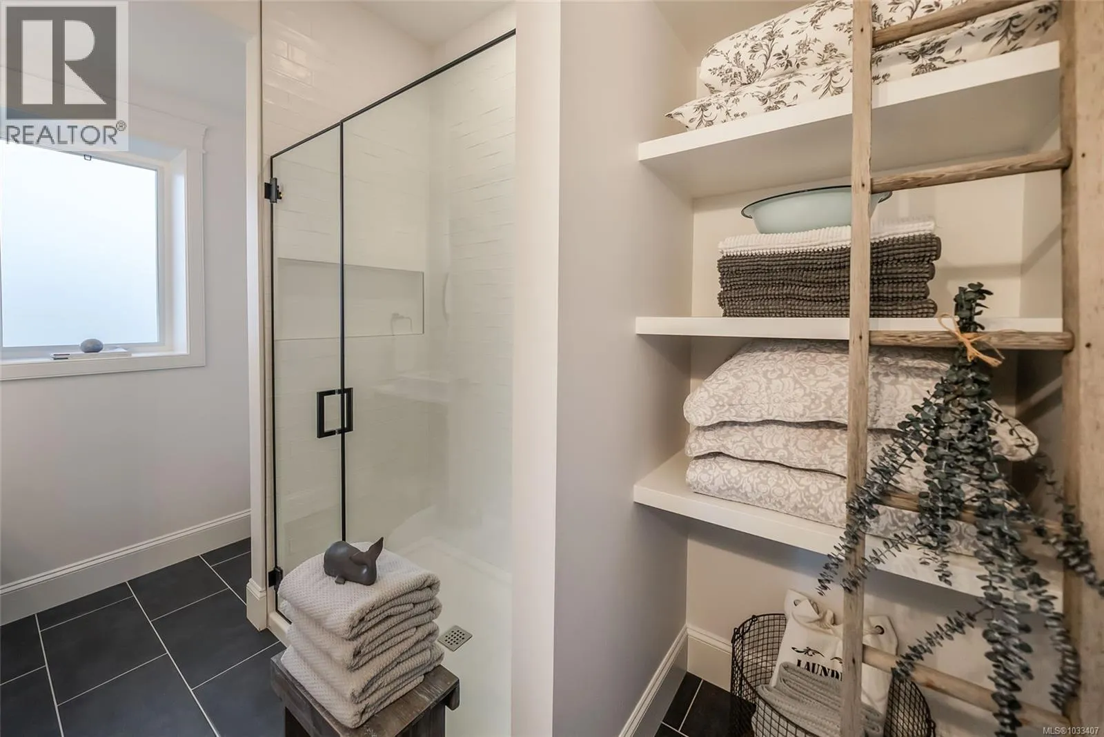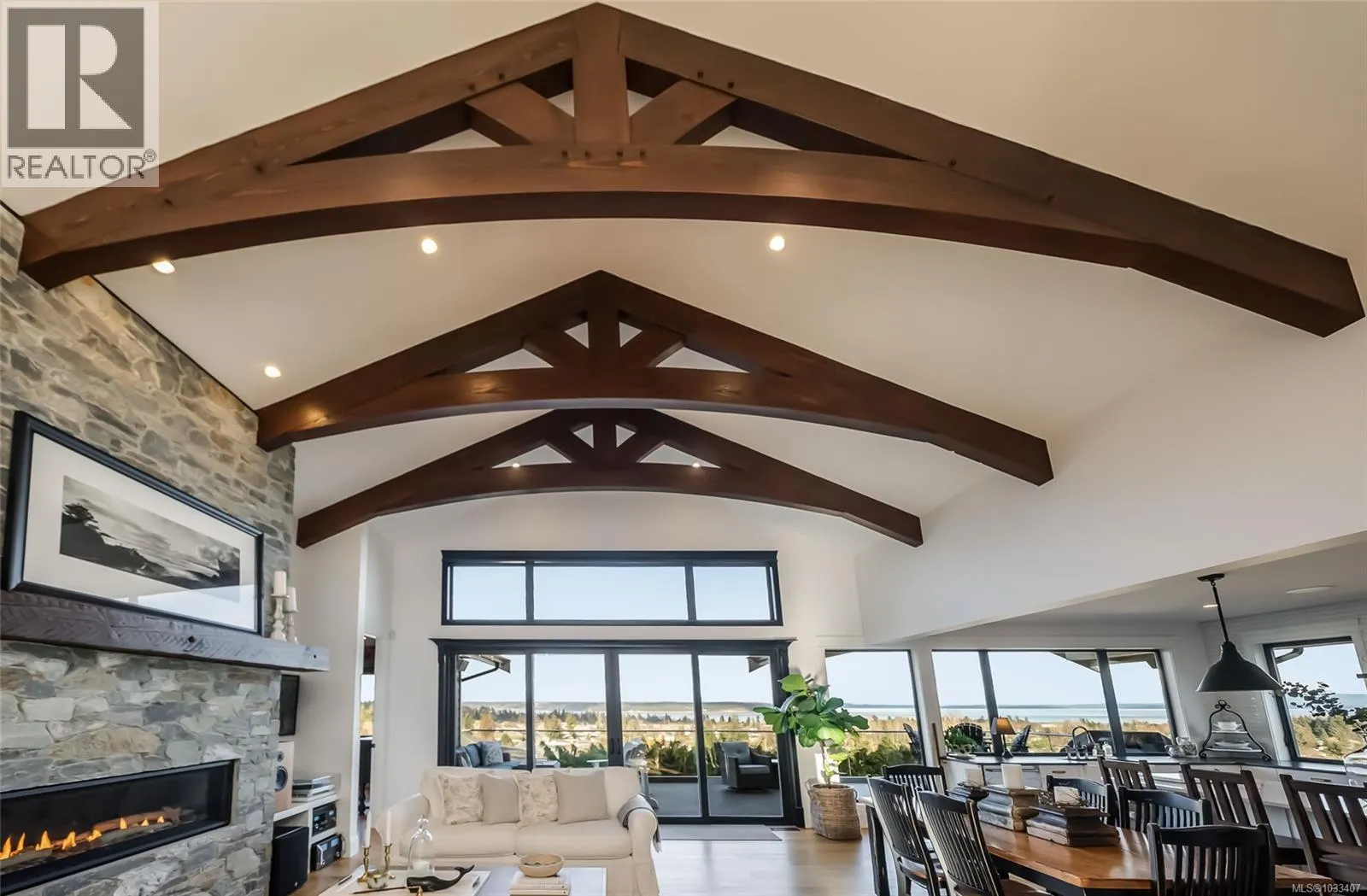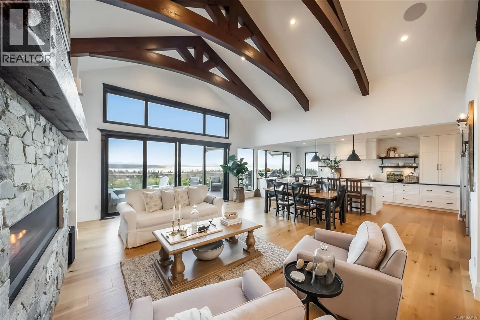 This breathtaking custom-built home was designed with intention and finished to perfection by Twelve Oaks Construction Ltd. offering panoramic ocean views that will leave you speechless. The living room is a showstopper, with vaulted ceilings showcasing old-growth custom curved exposed trusses and a sleek linear gas fireplace framed in real stone. The kitchen is a chef’s paradise—sprawling and stylish, with