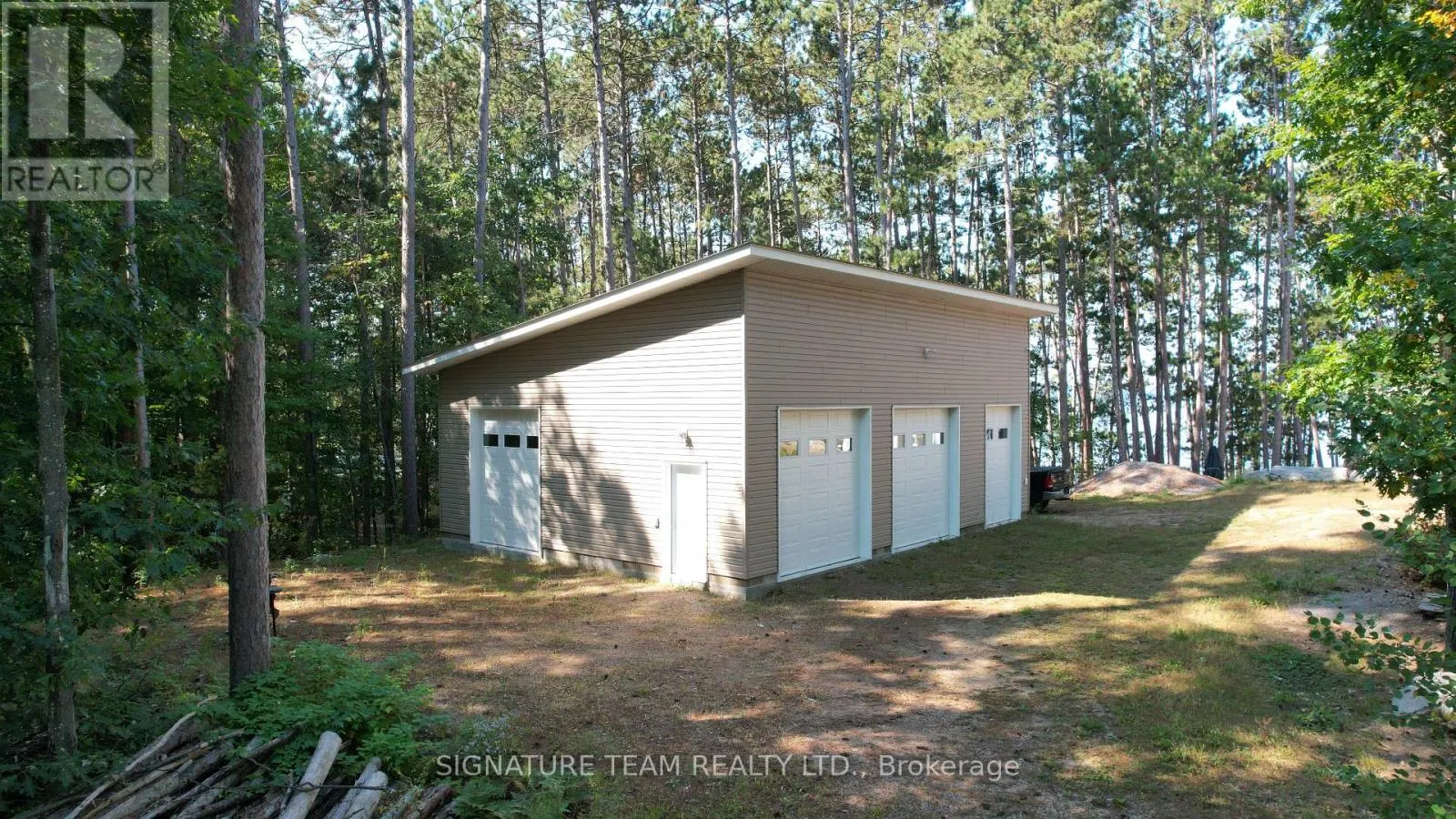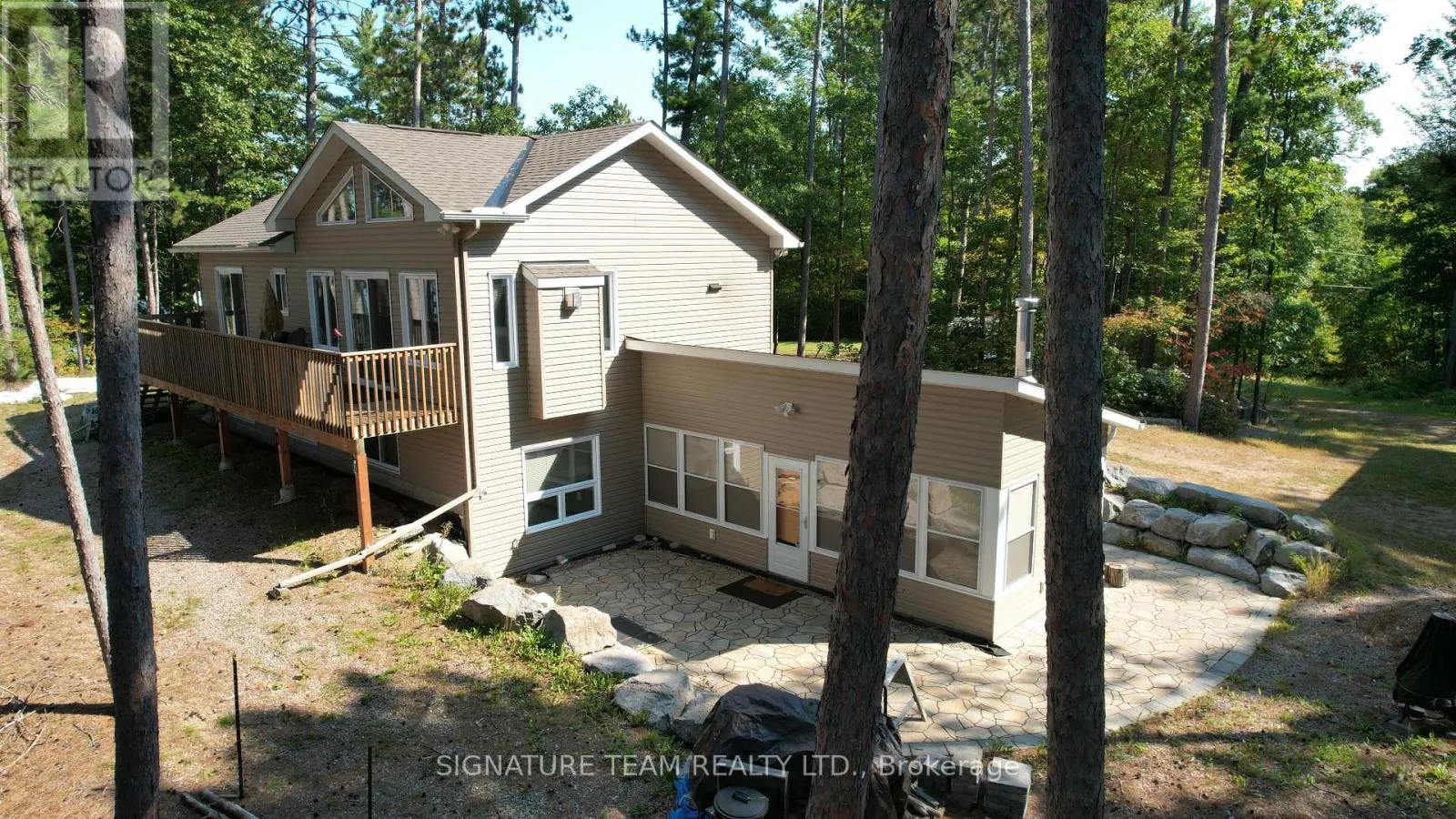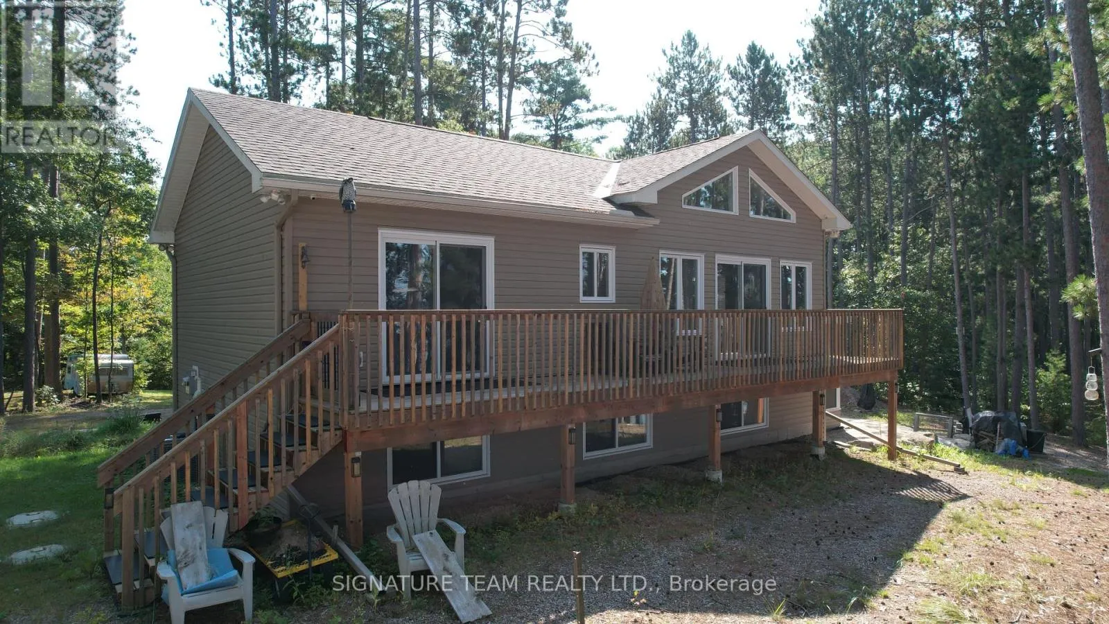 A Round Lake Waterfront Property, with amazing sunsets from the main deck and sand beach that is over 1km long for walking! This home (built in 2017) offers 4 bedrooms, 3 baths, 2 full kitchens, and a gazebo that can be used all year round with wood airtight stove! Not to mention the 40ft x 30ft, 3 bay detached garage,