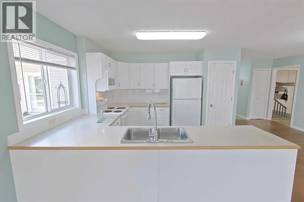 Welcome to 60+ adult living at Fletcher Village in Old Town Airdrie! This spacious, bright, and open 2-bedroom condo offers comfort, convenience, and a strong sense of community.Enjoy the inviting front porch, perfect for relaxing in the shade, along with a front-attached insulated garage and an extra-long driveway that provides ample parking for you and your guests.Inside, the home features