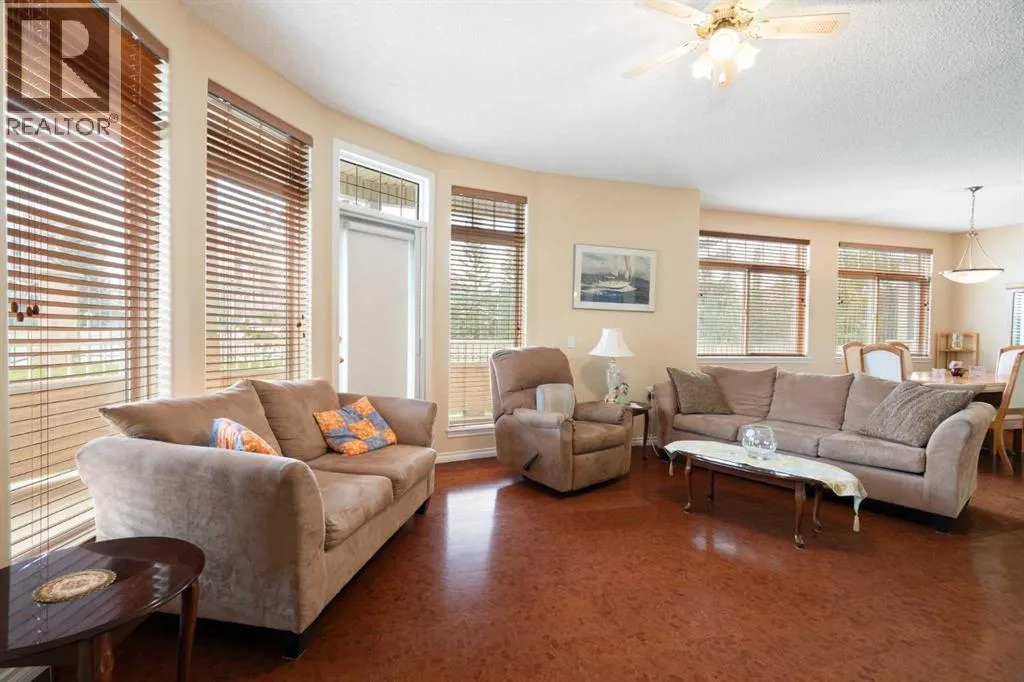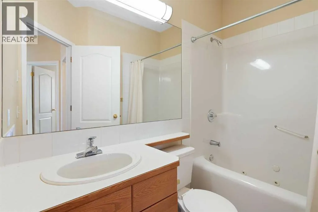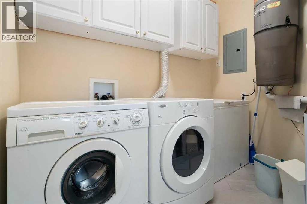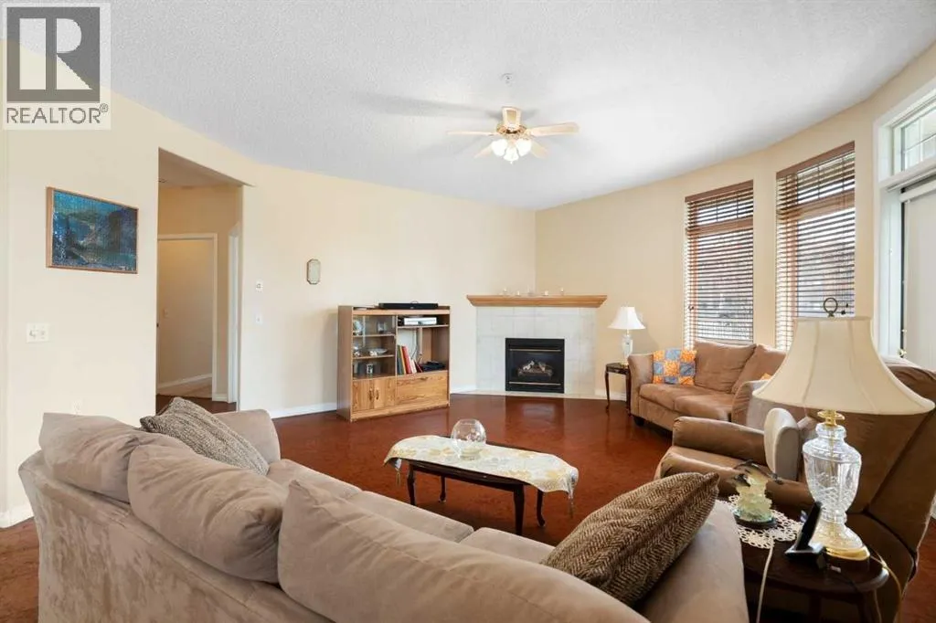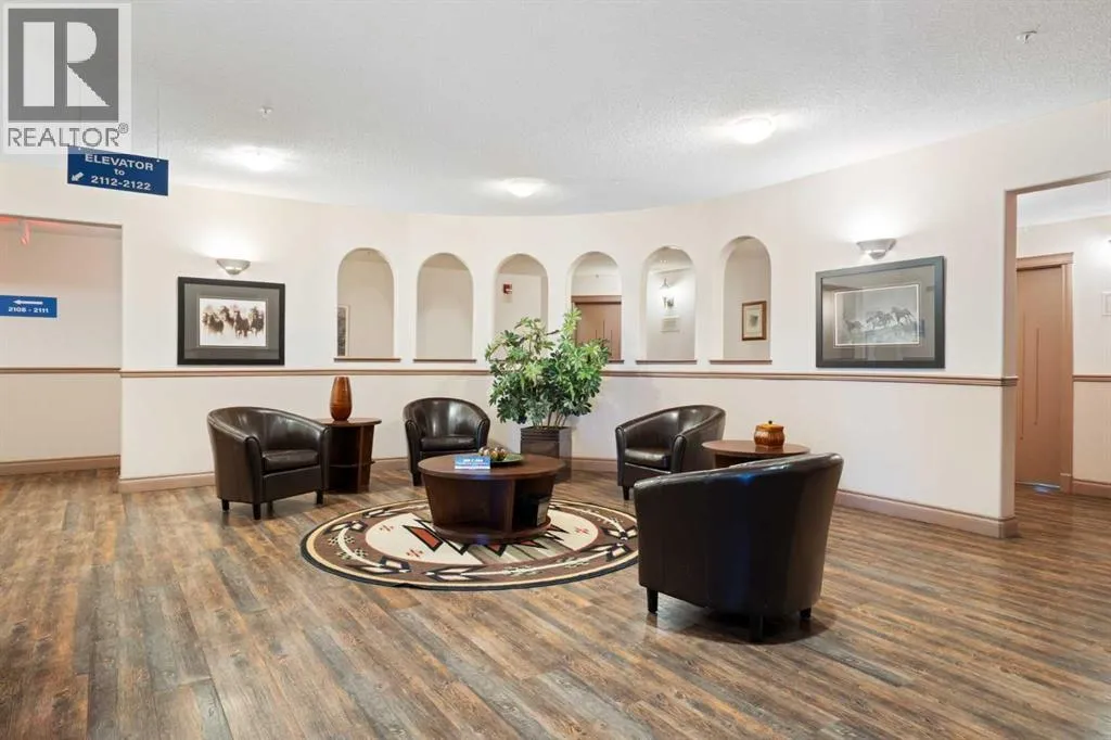 so much to work with in making it your new home. The entrance is wide and inviting with a large closet and space for seating. The newer rectangular tile that continues into the kitchen is easy to maintain. Moving forward into the living area your senses will be impacted by the abundance of natural light, the spaciousness of the living area, the unique curved wall, the airiness created by the 9’ ceilings, all complimented by the soft neutral colour palate. There is great flexibility of use provided by the open plan. The living room features a corner gas fireplace for added atmosphere and comfort. Step out to the wrap-around patio with southeast to southwest exposure and enjoy a morning coffee, summer lunch or evening BBQ. A large dining room with one wall of windows, space for a buffet and hutch, located next to the kitchen can accommodate daily meals or larger gatherings. A raised breakfast bar provides another option for snacks. The well-planned kitchen is bright with white appliances, lots of cabinets, counter space and a pantry. Retire to the primary suite with space for a king-sized bed, large window, walk-in closet with organizers and a 3-piece bathroom with a walk-in shower and storage cabinet. A second bedroom can function as a guest room or den. There is a main 4-piece bathroom with a one-piece jetted tub shower combination. A large laundry room with front loading washer and dryer has space for in-suite storage as well. The unit comes with 2 assigned parking stalls and a storage locker. This premier complex has a number of wonderful amenities including a hobby/workshop, self serve car wash bay, social/recreation r oom and a great clubhouse. Wonderfully landscaped grounds with paths and water features add to the overall ambiance of this fine home. It is located just off Old Banff Coach Road in the desirable community of Patterson. There is great access to Sarcee Trail, Stoney Trail, Highway #1 and public transportation. You will be close to many amenities and services such as McMahon Stadium, Foothills Medical Centre, University of Calgary, Canada Olympic Park, Calgary Farmer’s Market, Westhills Towne Centre and so much more. You owe it to yourself to check it out today. (id:62650)