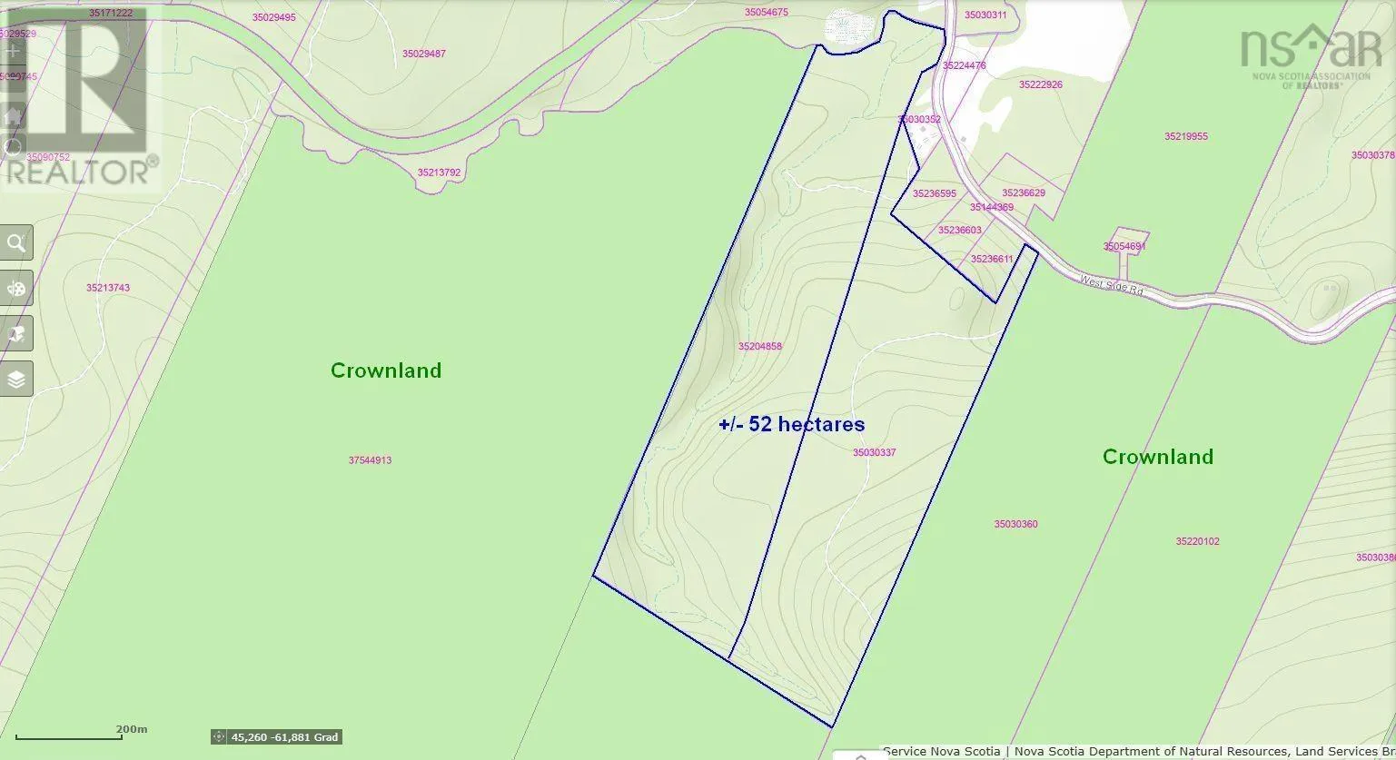 This beautiful 128.5 Acre property is nestled in the natural landscape of Country Harbour, just 20 kilometres from the Atlantic Ocean on the east coast of Nova Scotia. The extensive mixed forest area with its mature trees is located directly on West Side Road, a public road that is cleared in winter and maintained by the municipality. A complete