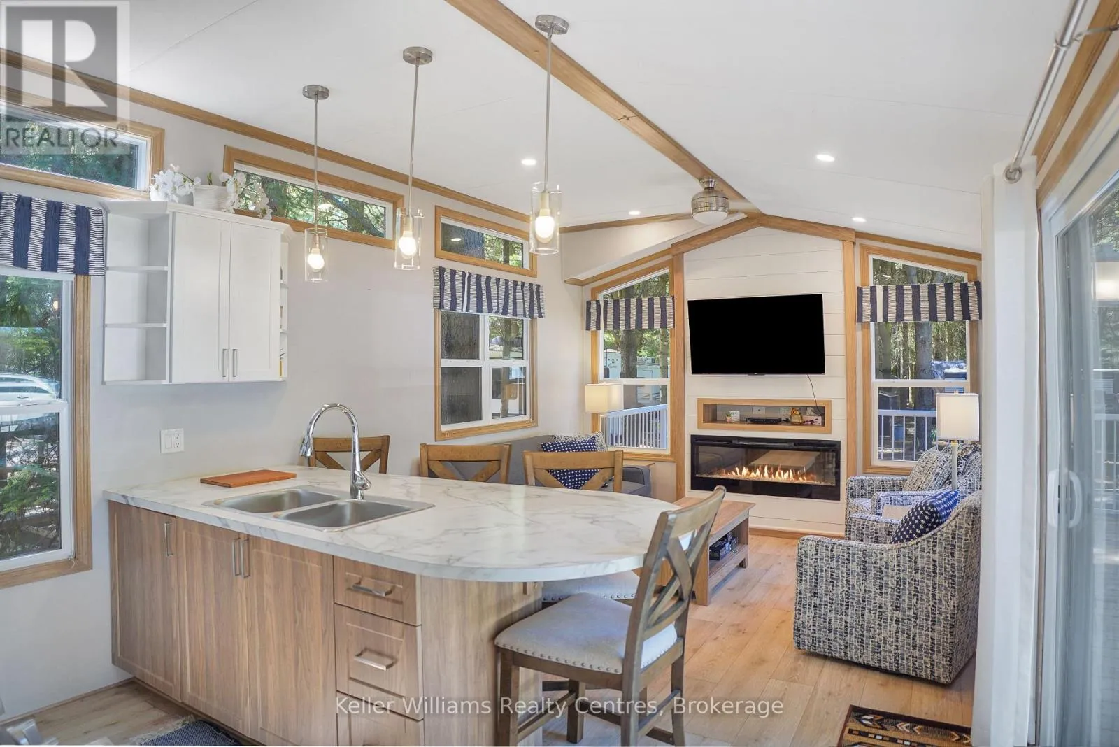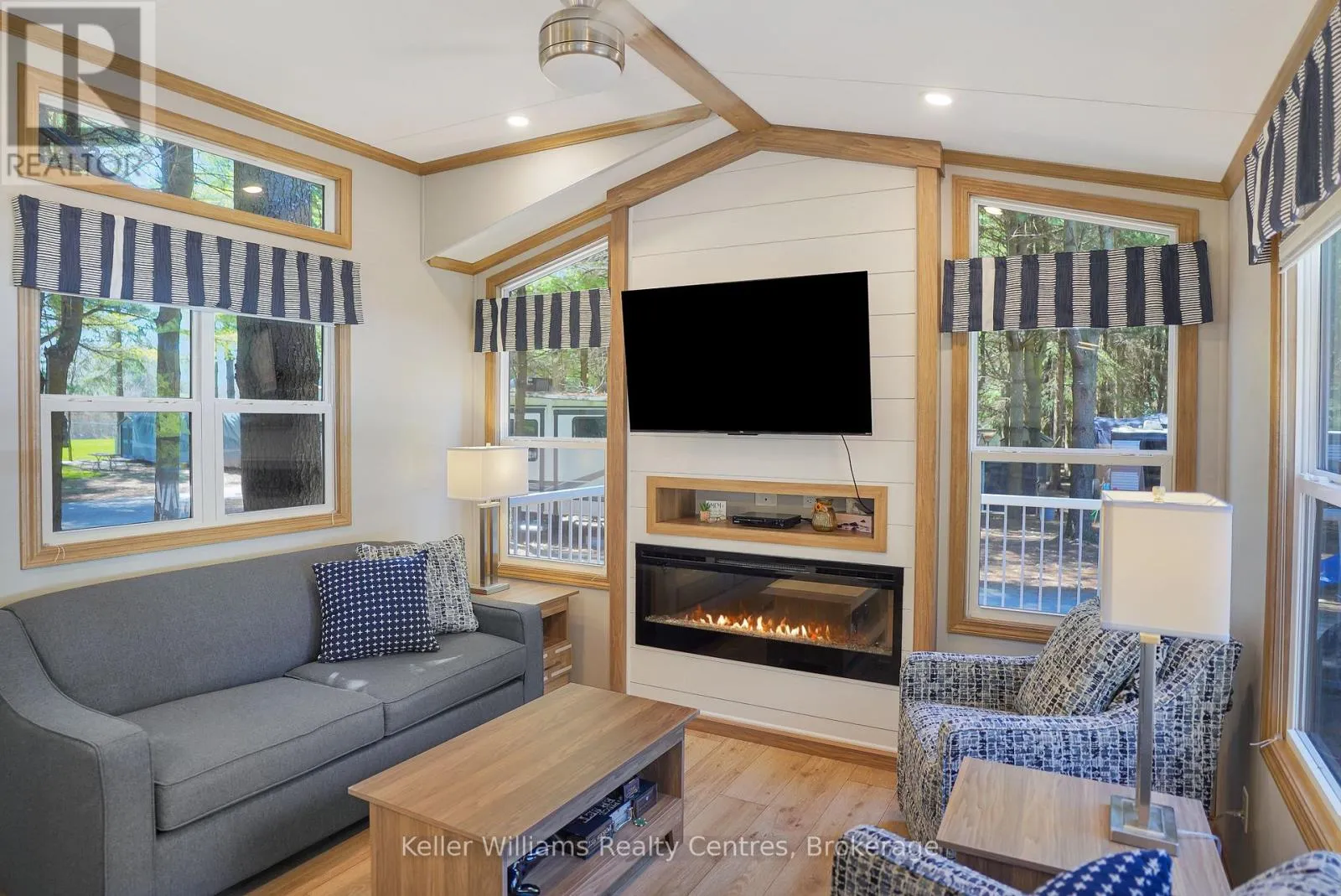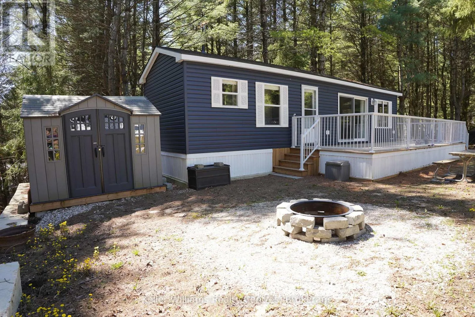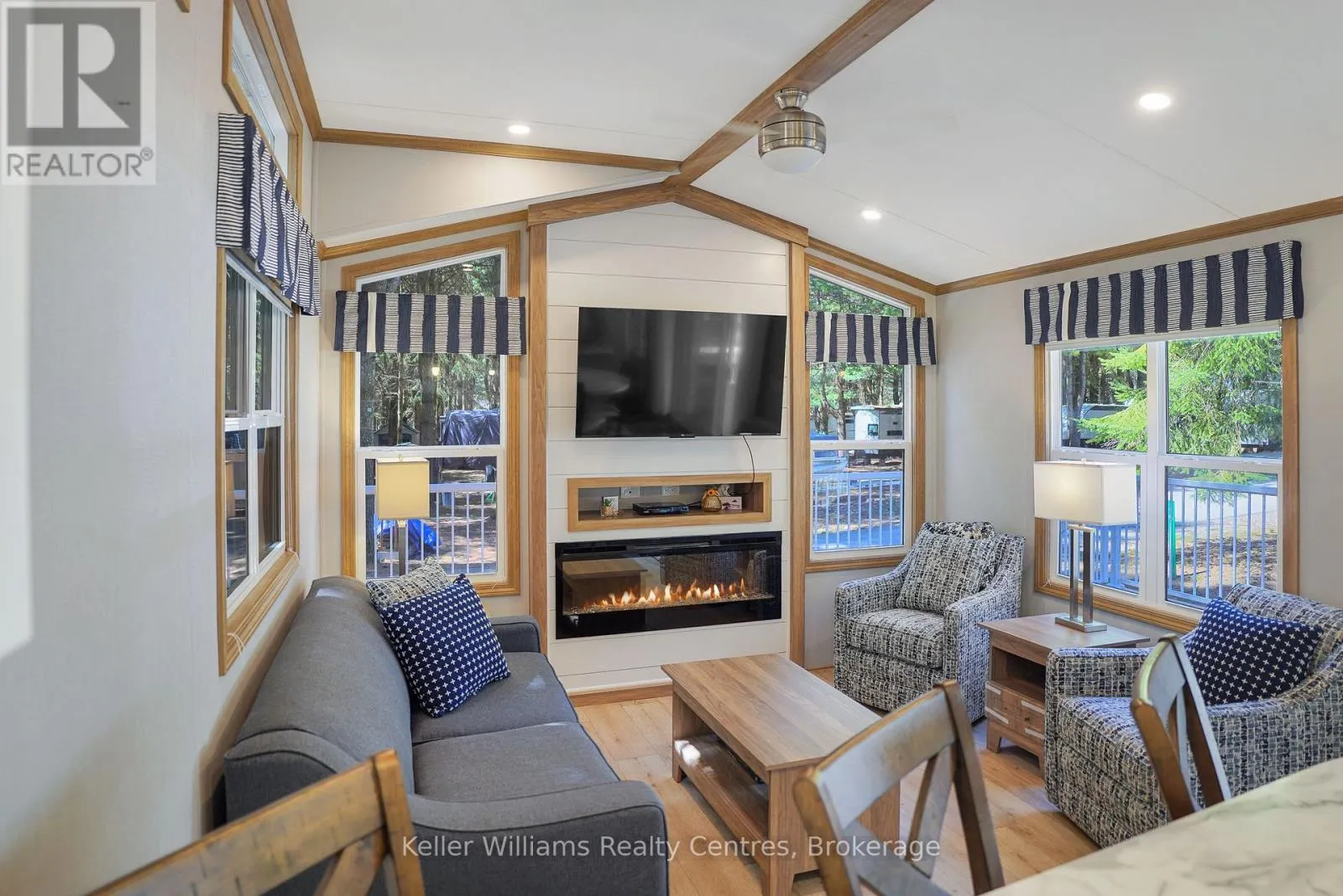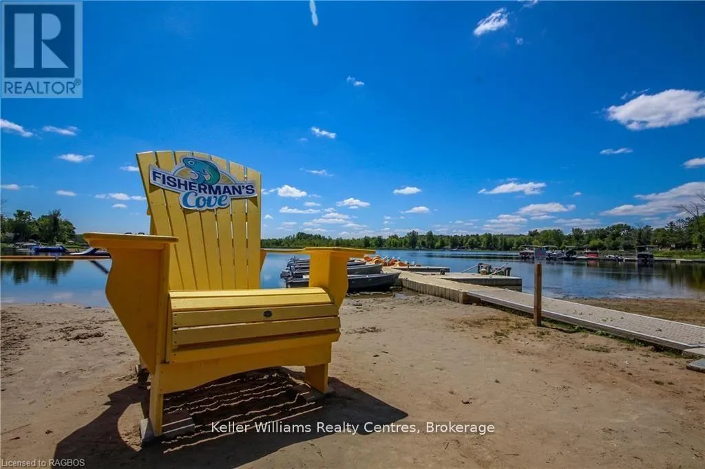 Welcome to effortless seasonal living at Fisherman’s Cove with this stunning 2023 Northlander Escape. Tucked into a private, treed setting, this beautifully designed 2-bedroom, 1-bathroom park model offers the perfect blend of modern comfort and cottage charm.Step inside to an inviting open-concept layout featuring vaulted ceilings, oversized windows, and warm natural finishes that create a bright, airy feel throughout. The