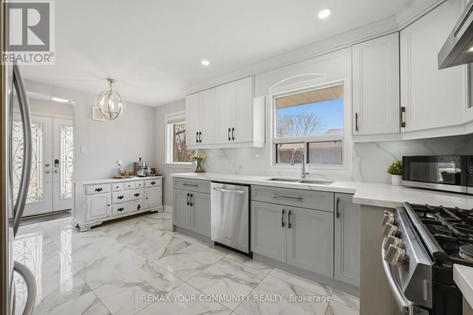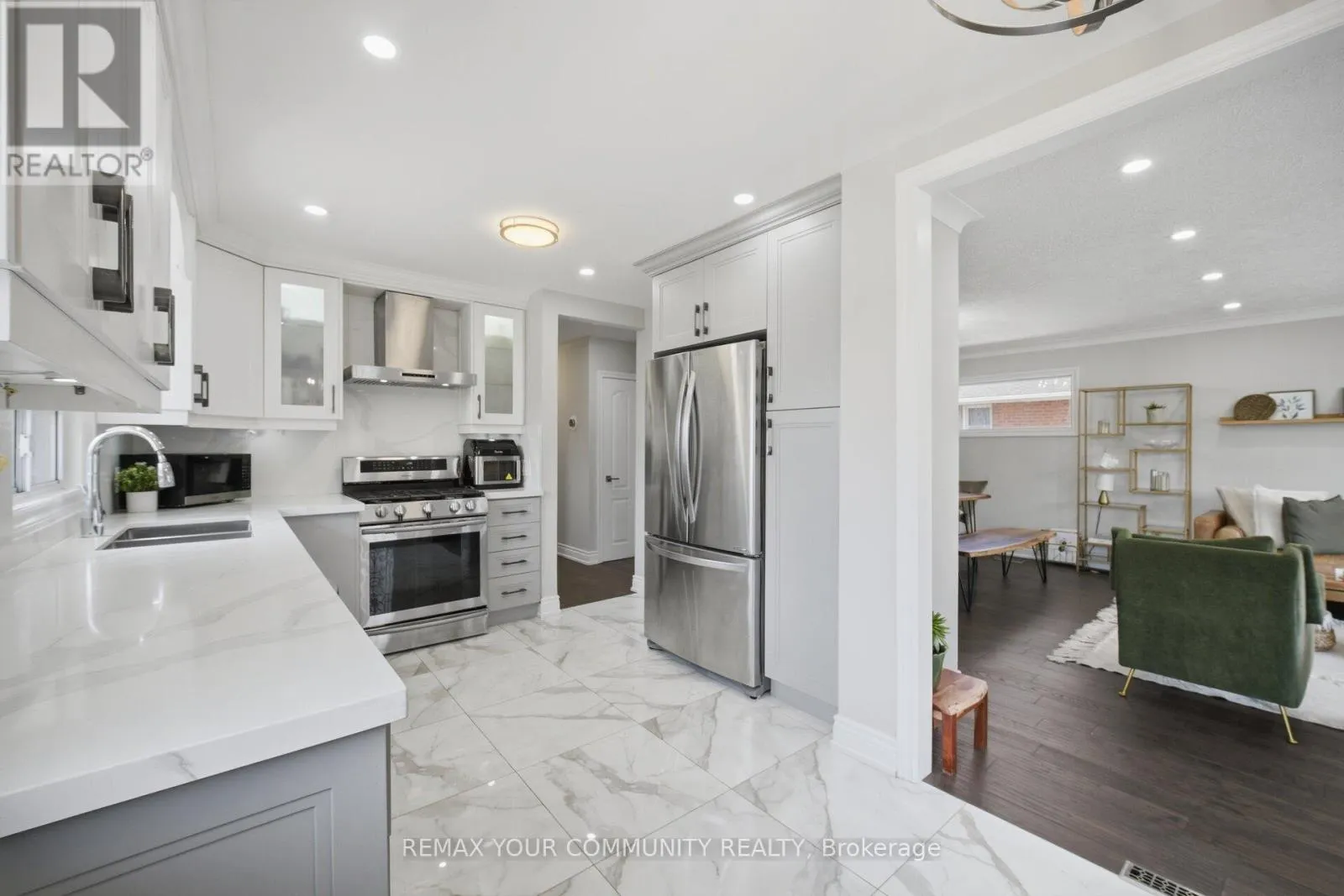 Beautifully redesigned bungalow backing onto a private ravine setting, surrounded by mature trees, walking trails, and green space. The main floor features contemporary hardwood in soft grey tones, complemented by a custom two-tone kitchen with a built-in pantry and quartz countertops that extend seamlessly into the backsplash for a clean, modern look. Stylish lighting, including pot lights throughout, along with