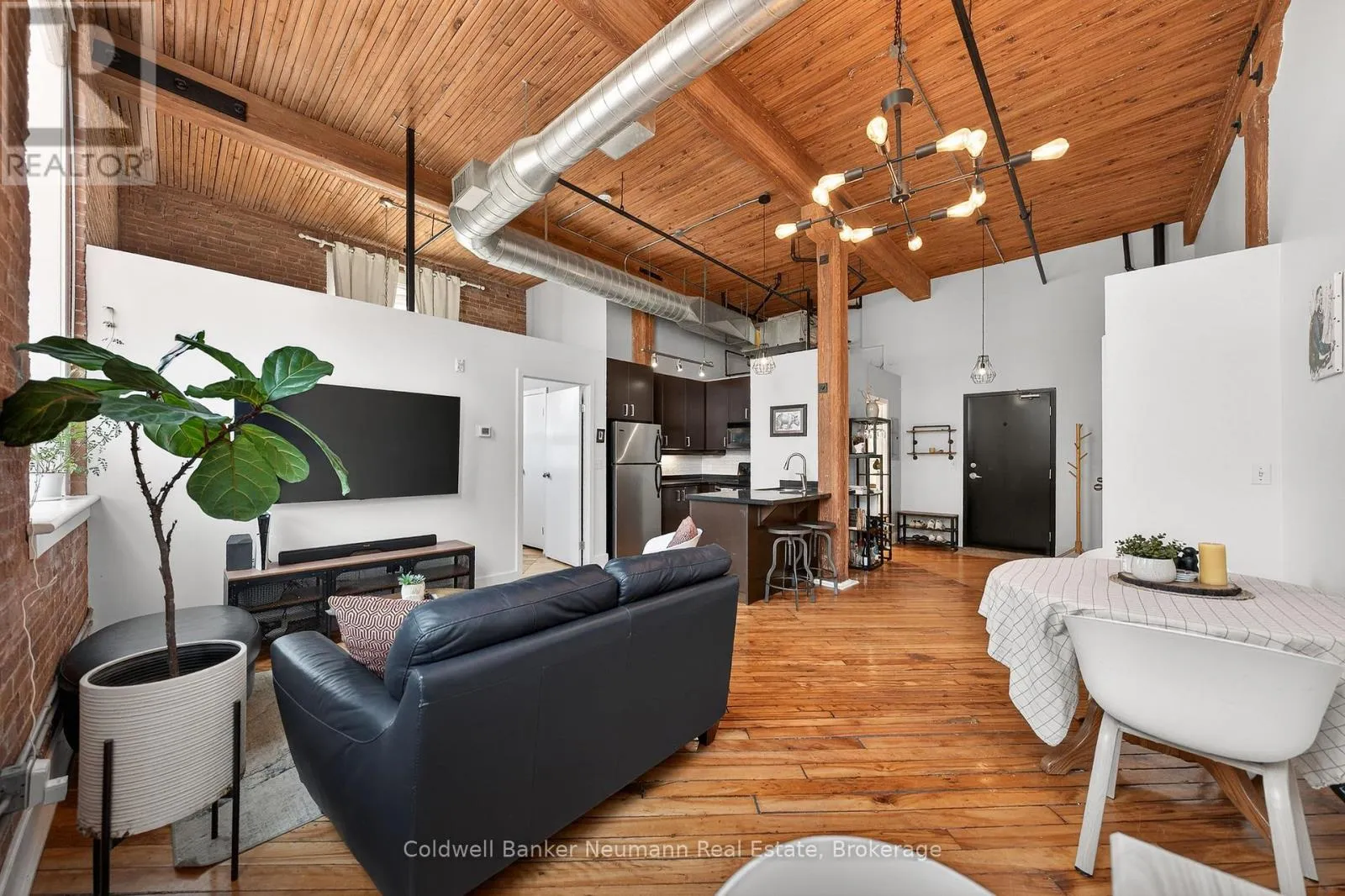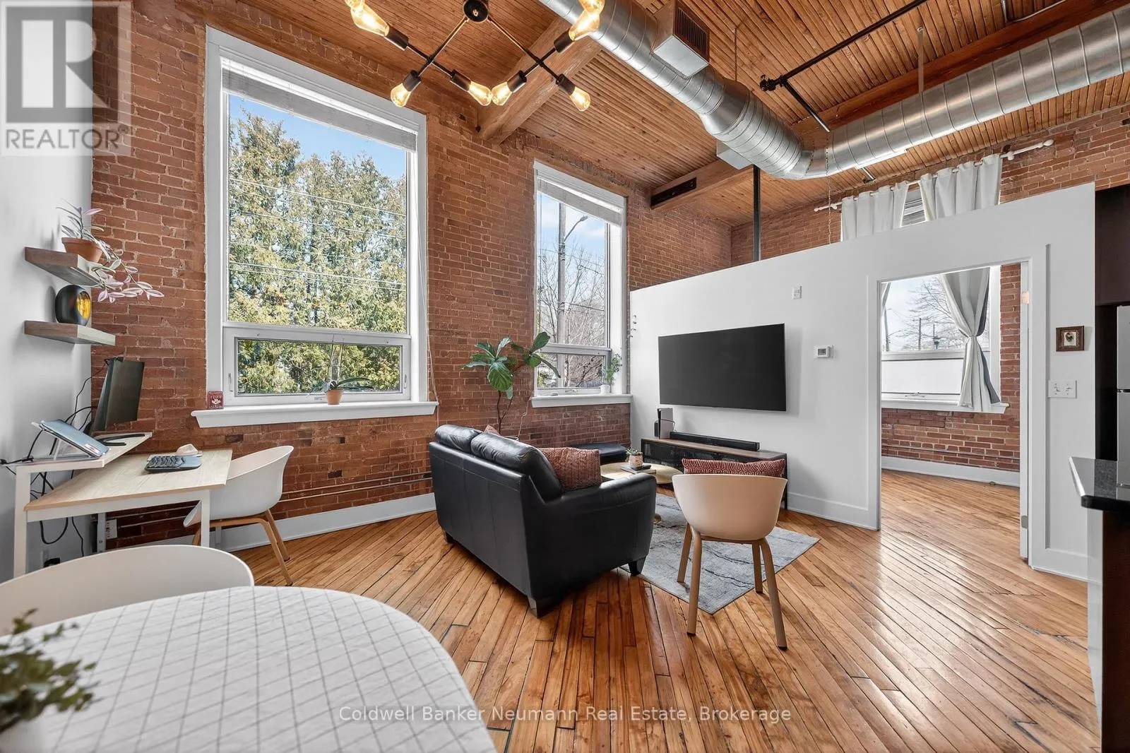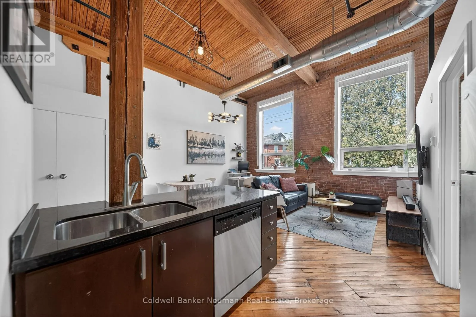 Authentic loft living in the heart of Guelph. Located in the highly desirable Mill Lofts, this corner unit is a one-bedroom, one-bathroom. it showcases the timeless appeal of true industrial design paired with thoughtful modern updates.Rich exposed brick walls set the tone throughout the space, adding warmth, texture, and undeniable character you simply won’t find in newer builds. The open-concept