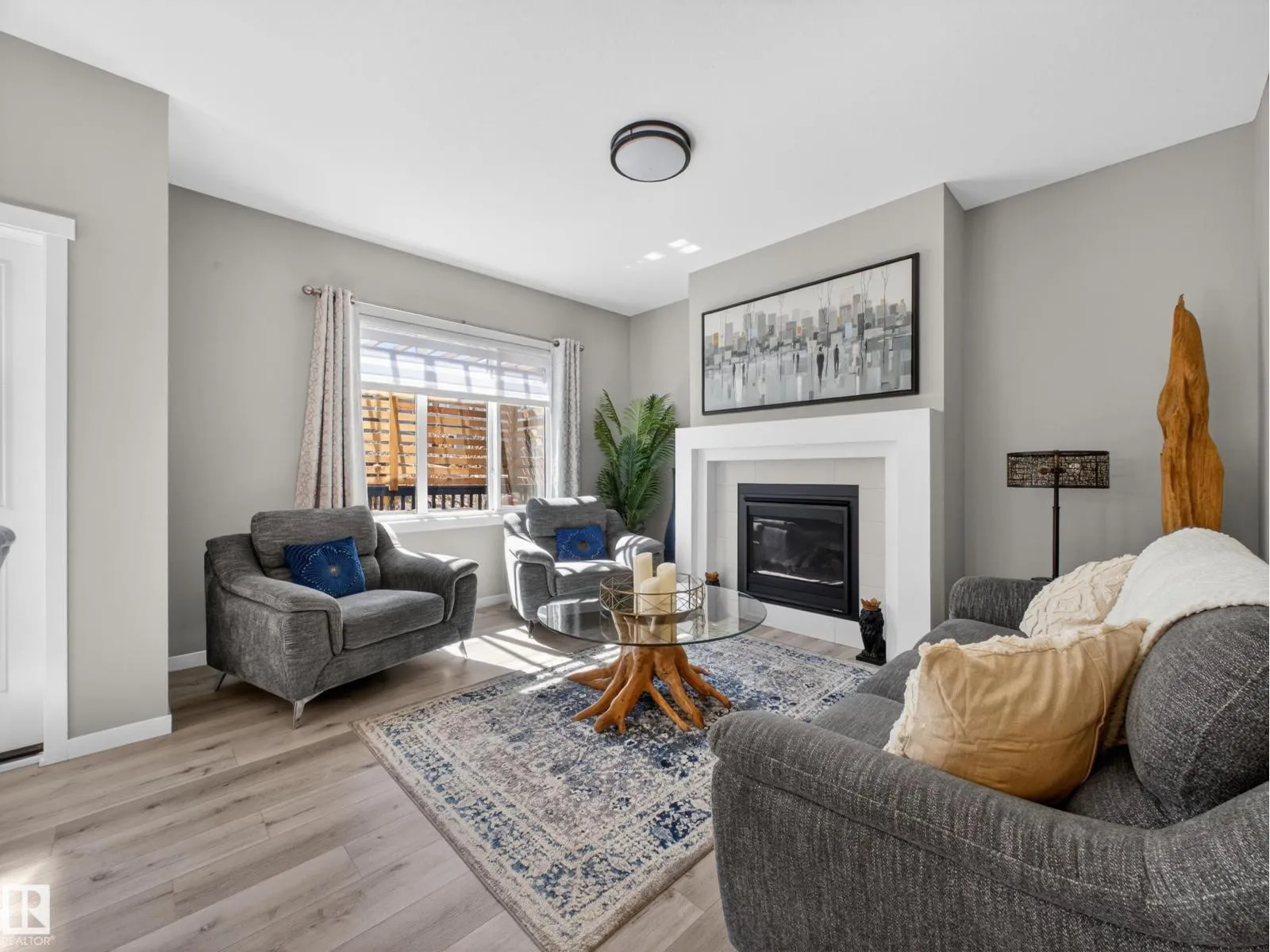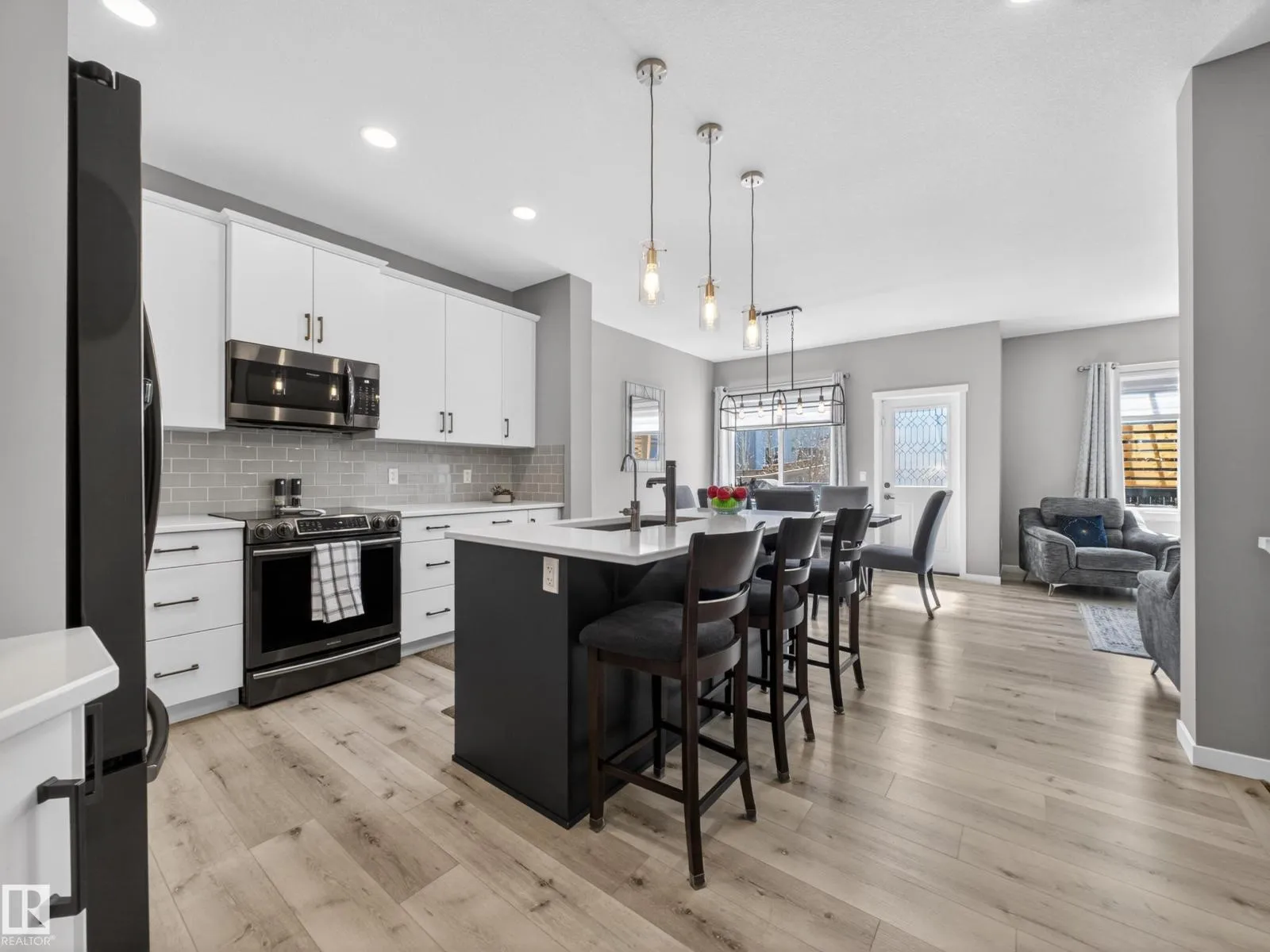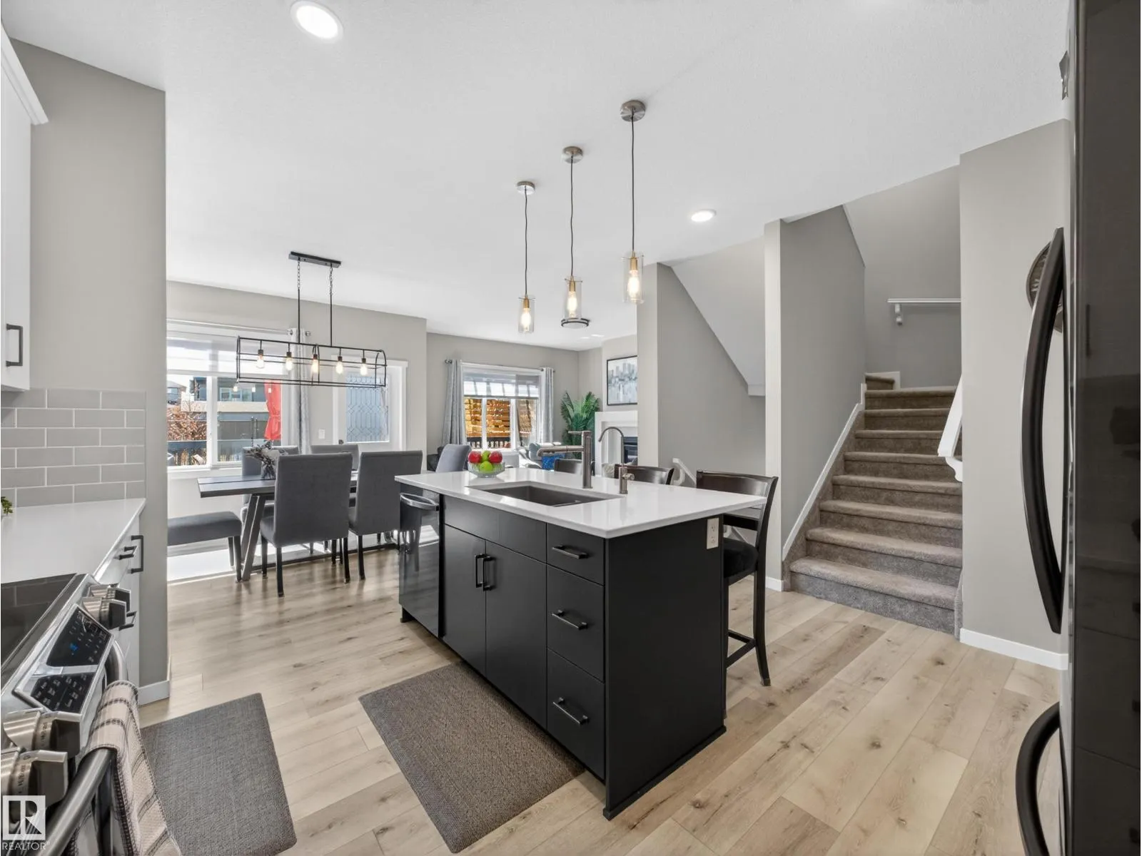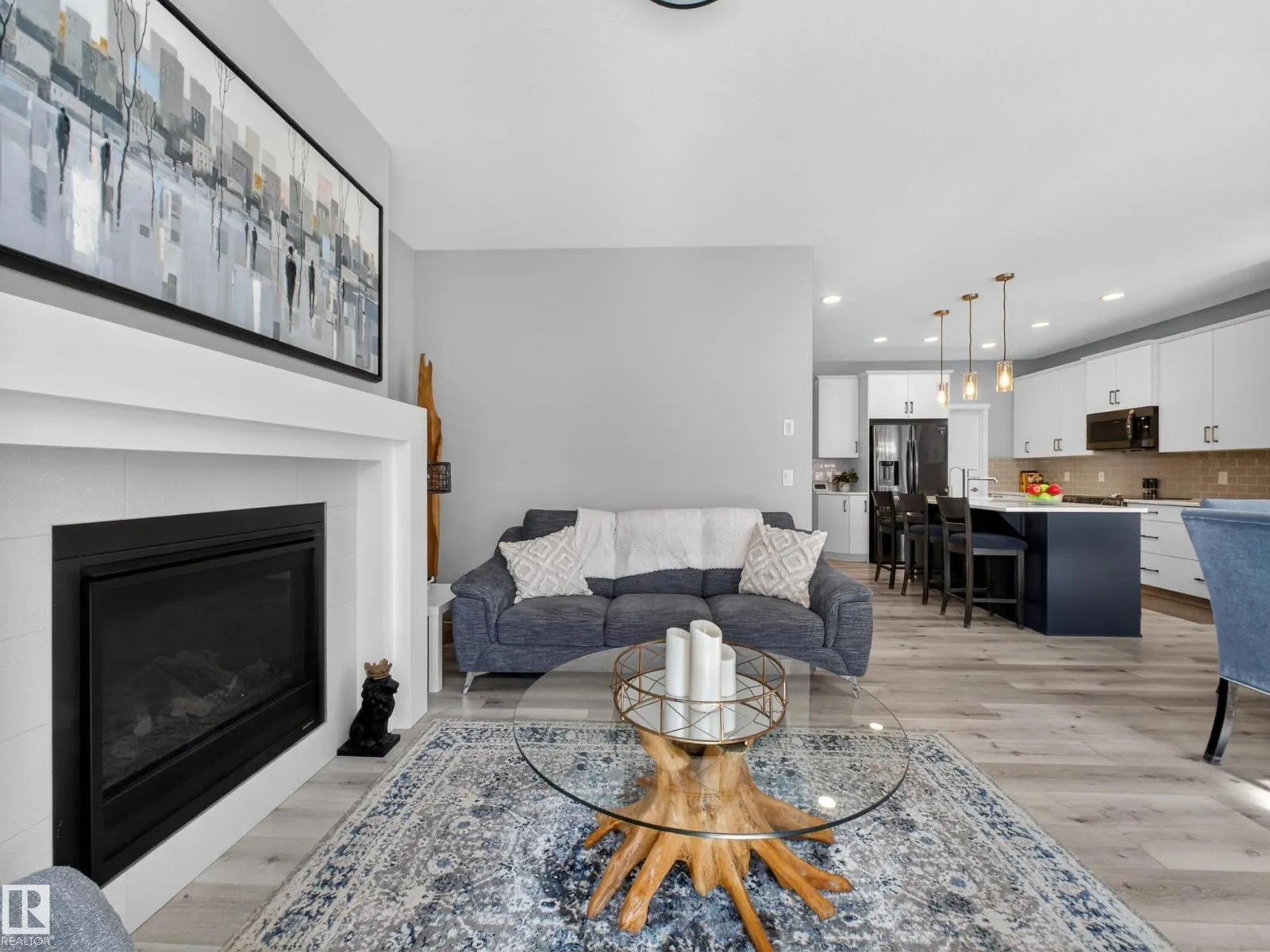 Welcome to this stunning, move-in ready home with stylish, modern finishings throughout! The main floor features beautiful LVP flooring and a designer kitchen with classic white cabinetry, a contrasting grey island, quartz countertops, sleek hardware, and stainless steel appliances. The open-concept living room is anchored by a trendy gas fireplace and a large picture window overlooking the backyard. Step outside