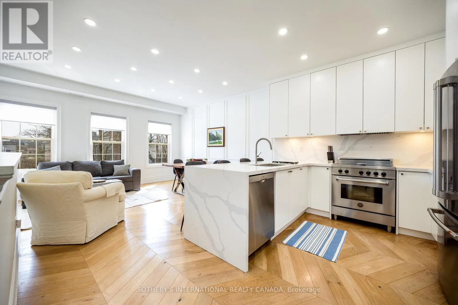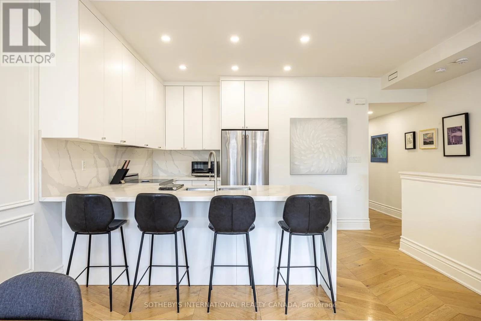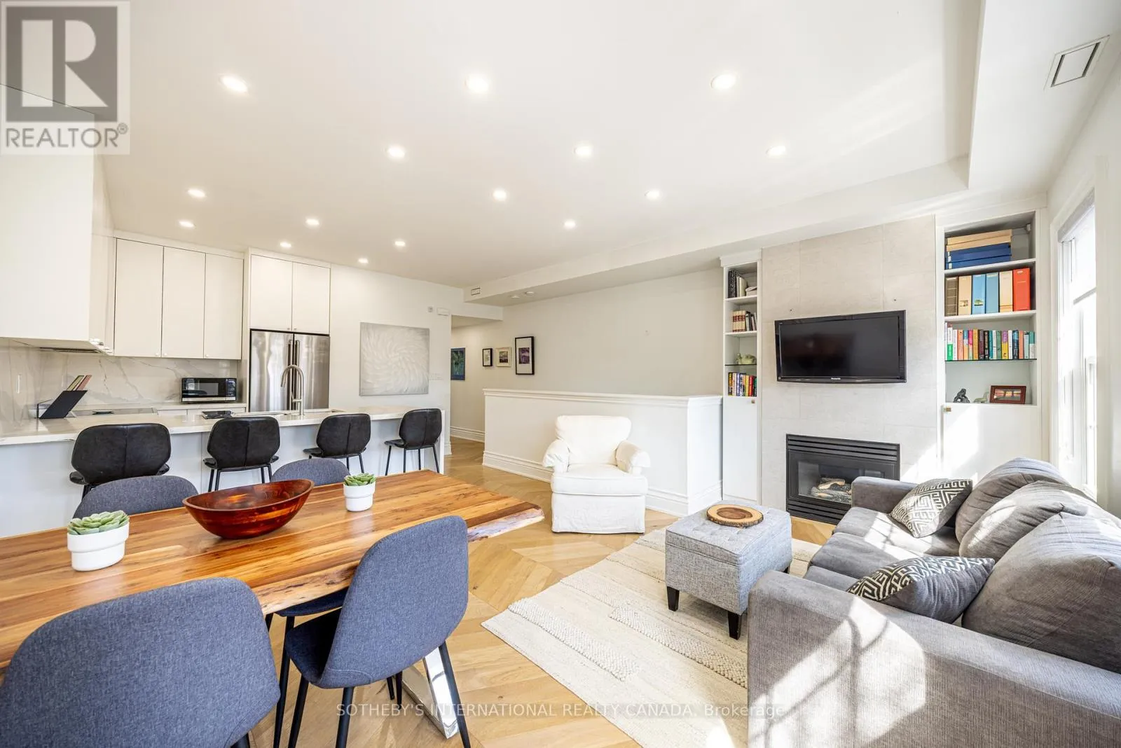 Bright and sun-filled, this exceptional two-bedroom, two-bathroom walk-up condo offers soaring 11-foot ceilings and a thoughtfully designed layout. Wide plank herringbone floors flow throughout the space, adding warmth and timeless elegance, while the natural gas fireplace creates a cozy focal point in the expansive living area. With only a few neighbours, this residence provides a sense of privacy rarely found
