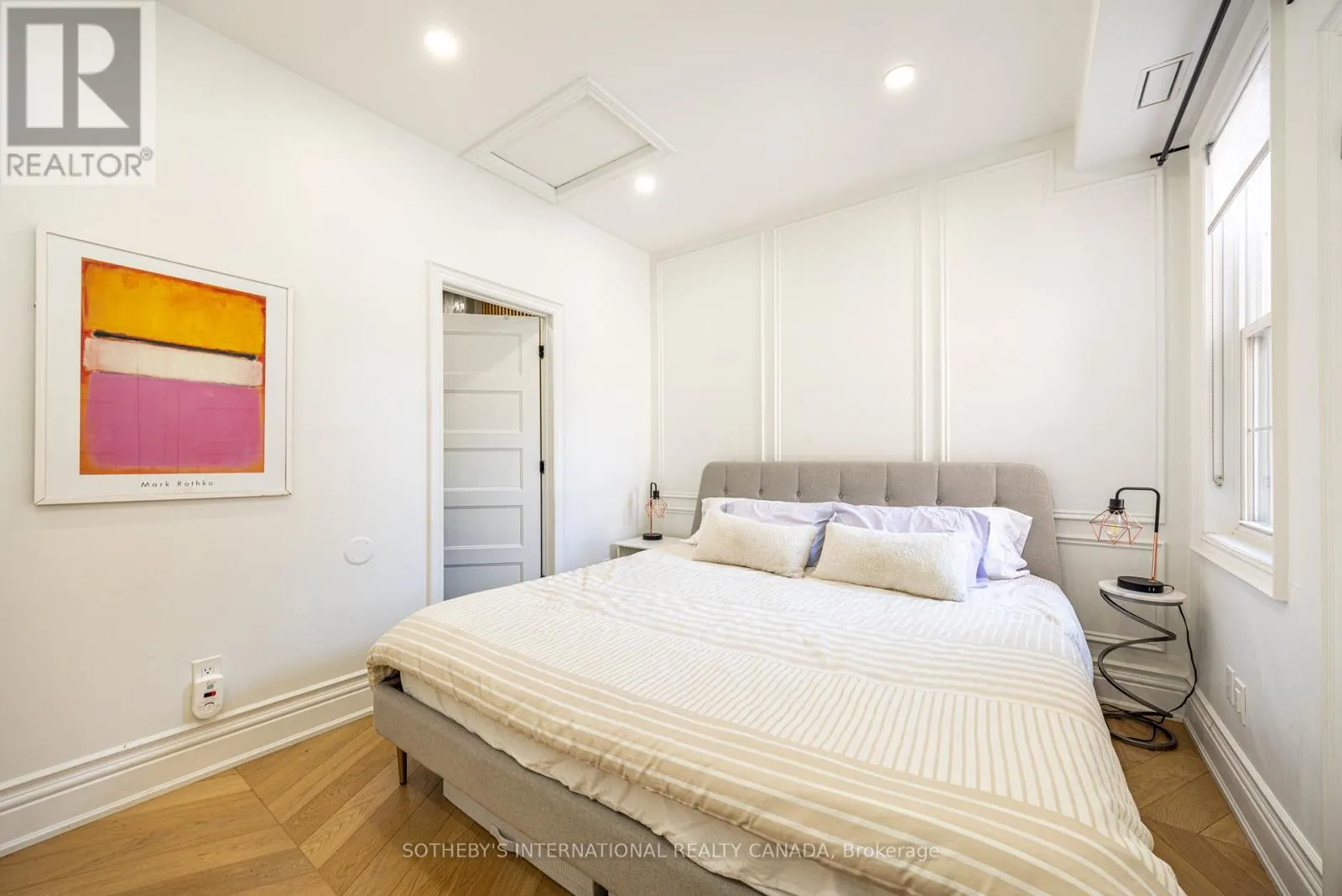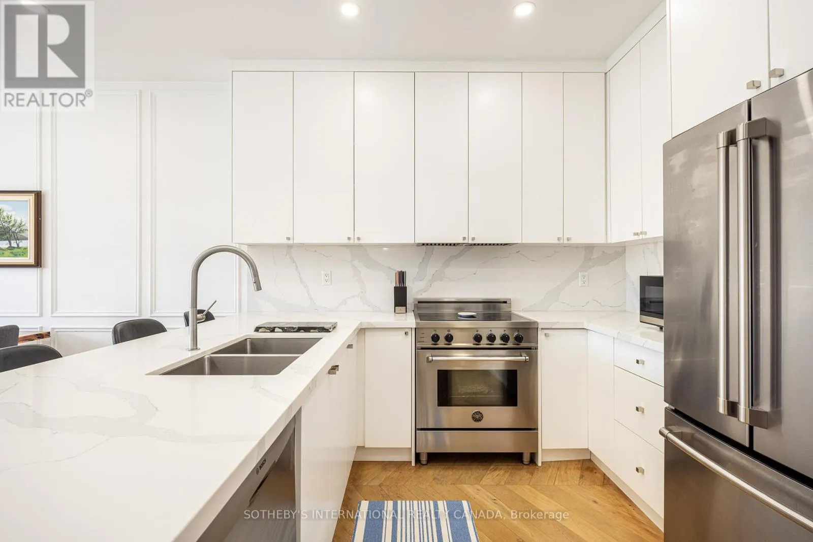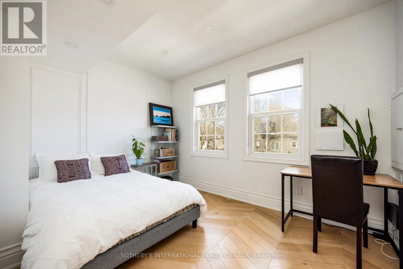 Bright and sun-filled, this exceptional two-bedroom, two-bathroom walk-up condo offers soaring 11-foot ceilings and a thoughtfully designed layout. Wide plank herringbone floors flow throughout the space, adding warmth and timeless elegance, while the natural gas fireplace creates a cozy focal point in the expansive living area. With only a few neighbours, this residence provides a sense of privacy rarely found