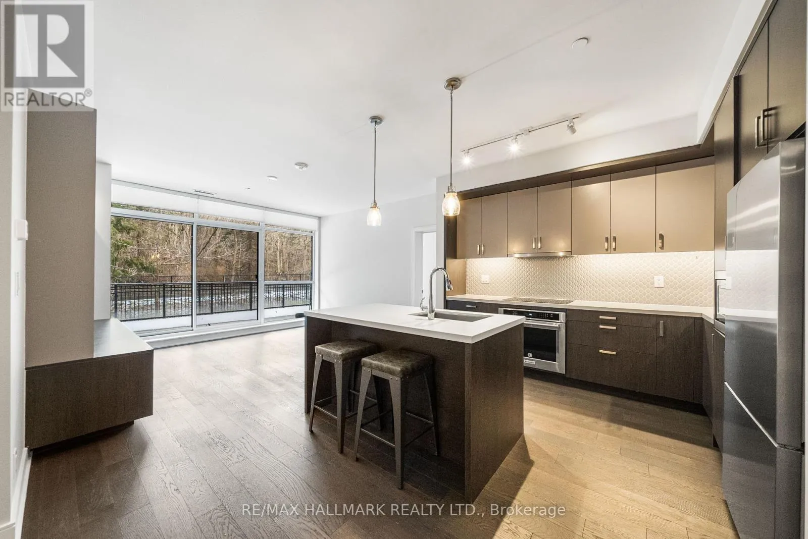 Love Where You Live! Located in the highly sought-after Craftsman Condos in vibrant Clarkson Village, this luxurious ground-floor suite offers over 1,200 sq ft of upgraded living space, complemented by an impressive 466 sqft private terrace overlooking serene Birchwood Park. Thoughtfully designed with timeless finishes, this home features engineered hardwood flooring, remote-control roller shades on all windows, and pot lights