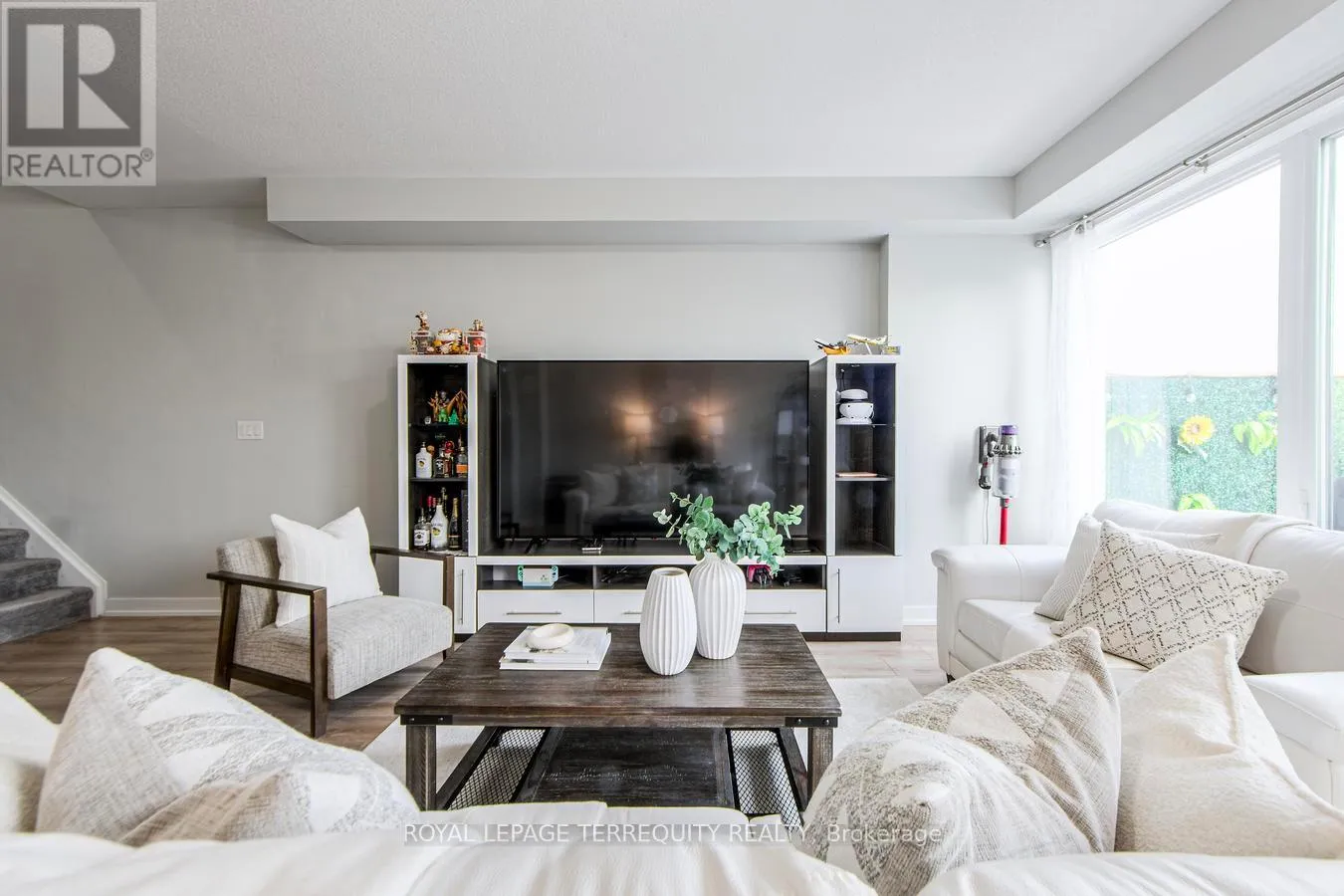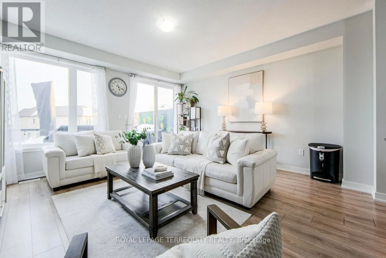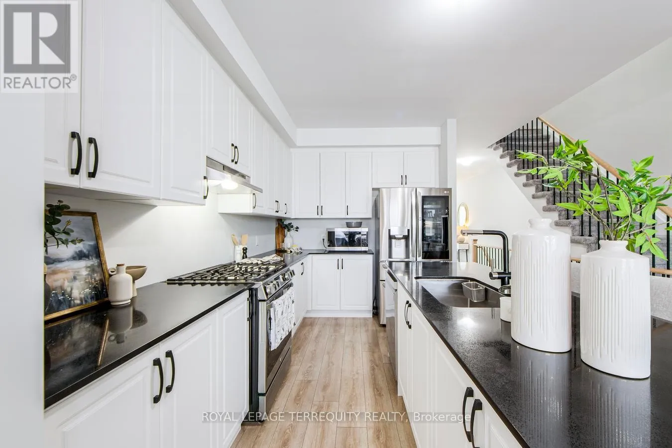 With 2,014 square feet of beautifully finished living space, this modern Freehold Townhome is move-in ready. The open-concept design boasts soaring 9′ smooth ceilings, pot lights, and upgraded wide-plank vinyl flooring. A stunning custom kitchen features a quartz center island with an extended breakfast bar, upgraded cabinetry, and high-end stainless steel appliances. A convenient pass-through servery seamlessly connects the kitchen